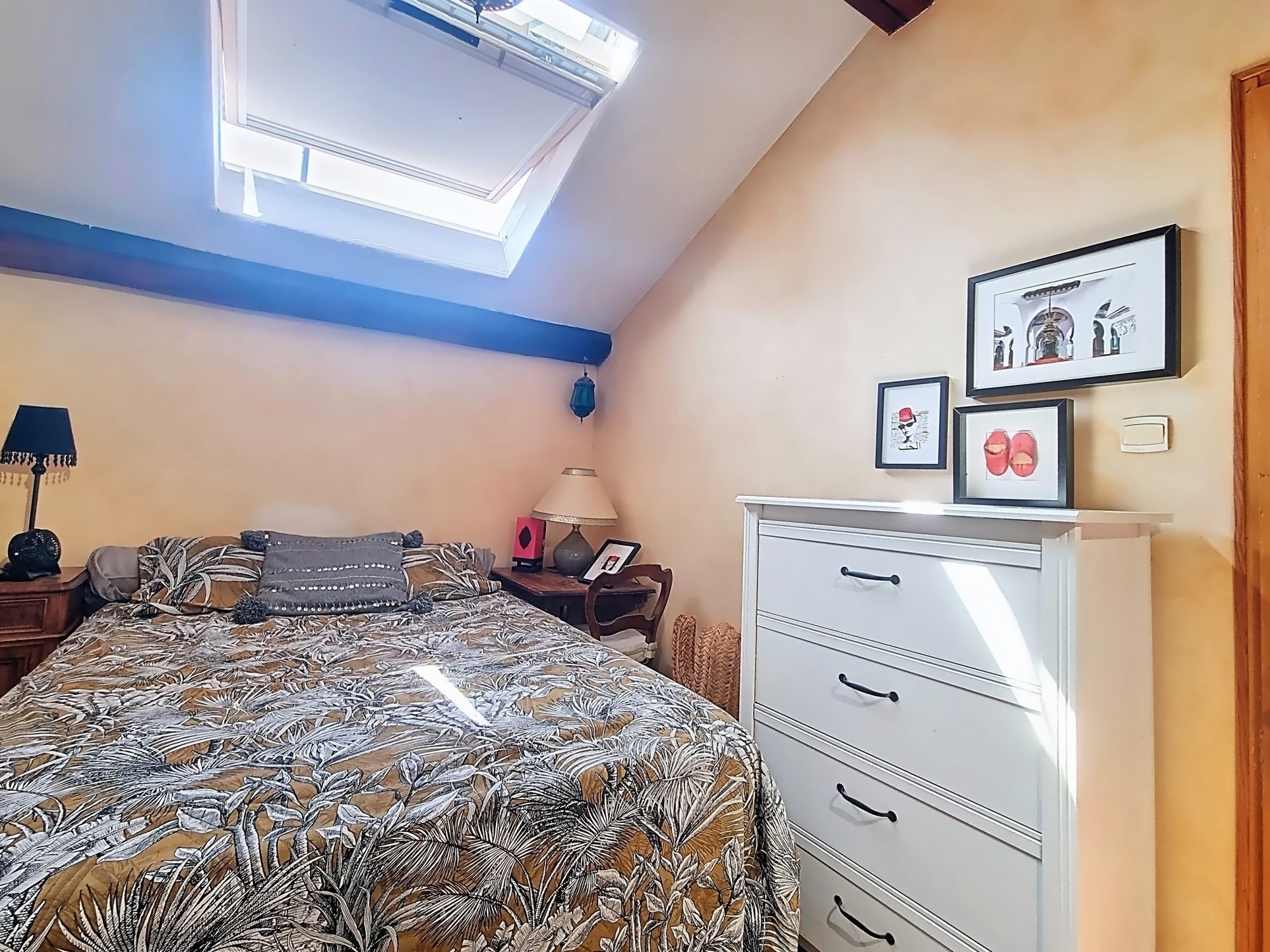A l'étage, vous disposez d'une grande chambre avec Velux et d'une salle de bains.