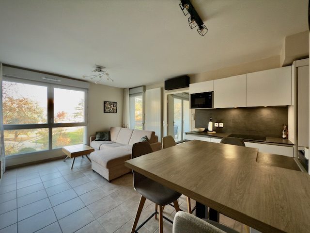 - Pièce de vie de 26m² avec cuisine ouverte entièrement meublée et équipée, l'ensemble ayant accès sur un balcon de 6,5m², une belle chambre de 12 m² avec sa salle d'eau douche attenante, WC indépendant. En sous sol : Box fermé .