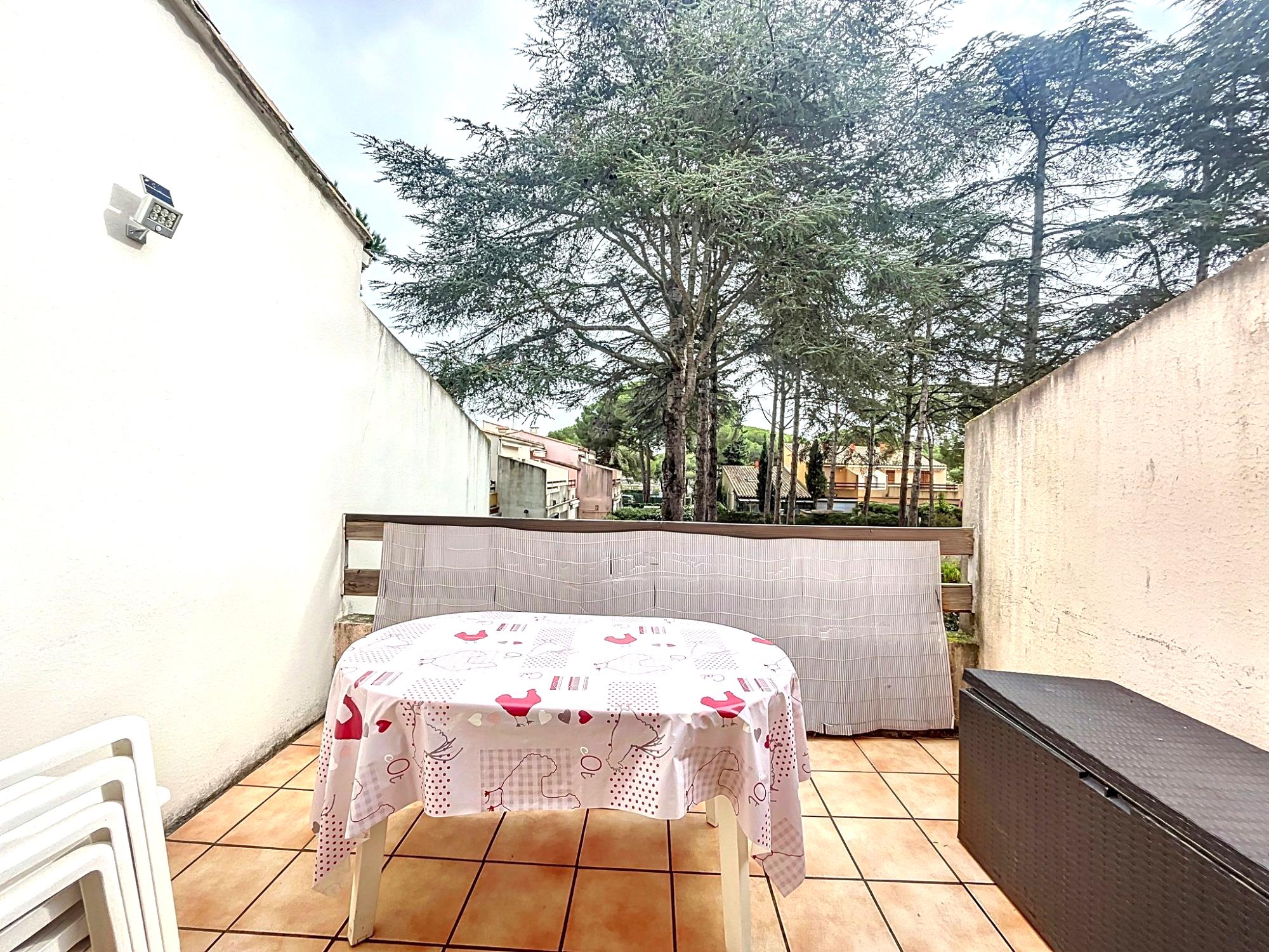CAP D'AGDE : Quartier Pinède, dans une résidence calme et sécurisée avec gardien et piscine,  Studio mezzanine haute et cabine de 21,98m² loi carrez, terrasse d'environ 8m²  sans vis à vis, parking privatif.