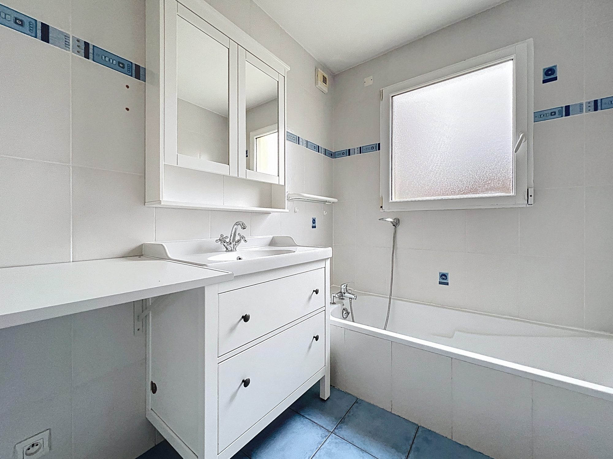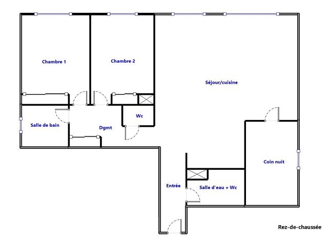 Ce rez-de-jardin se compose d'une entrée, une salle de d'eau avec wc, une cuisine ouverte sur séjour, deux chambres, un dégagement, un bureau , une salle de bain, un wc.