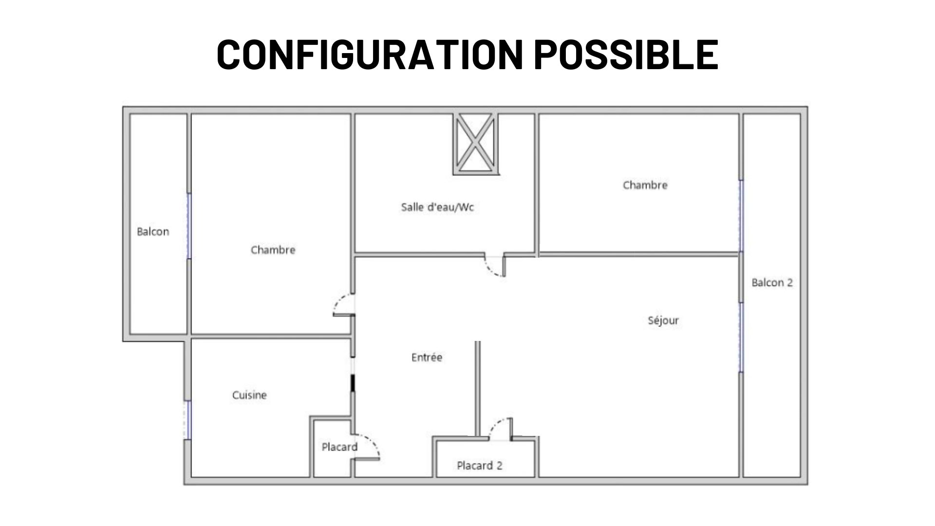 Il est tout à fait envisageable de créer une pièce supplémentaire pour transformer l'appartement en T3 (configuration initiale)