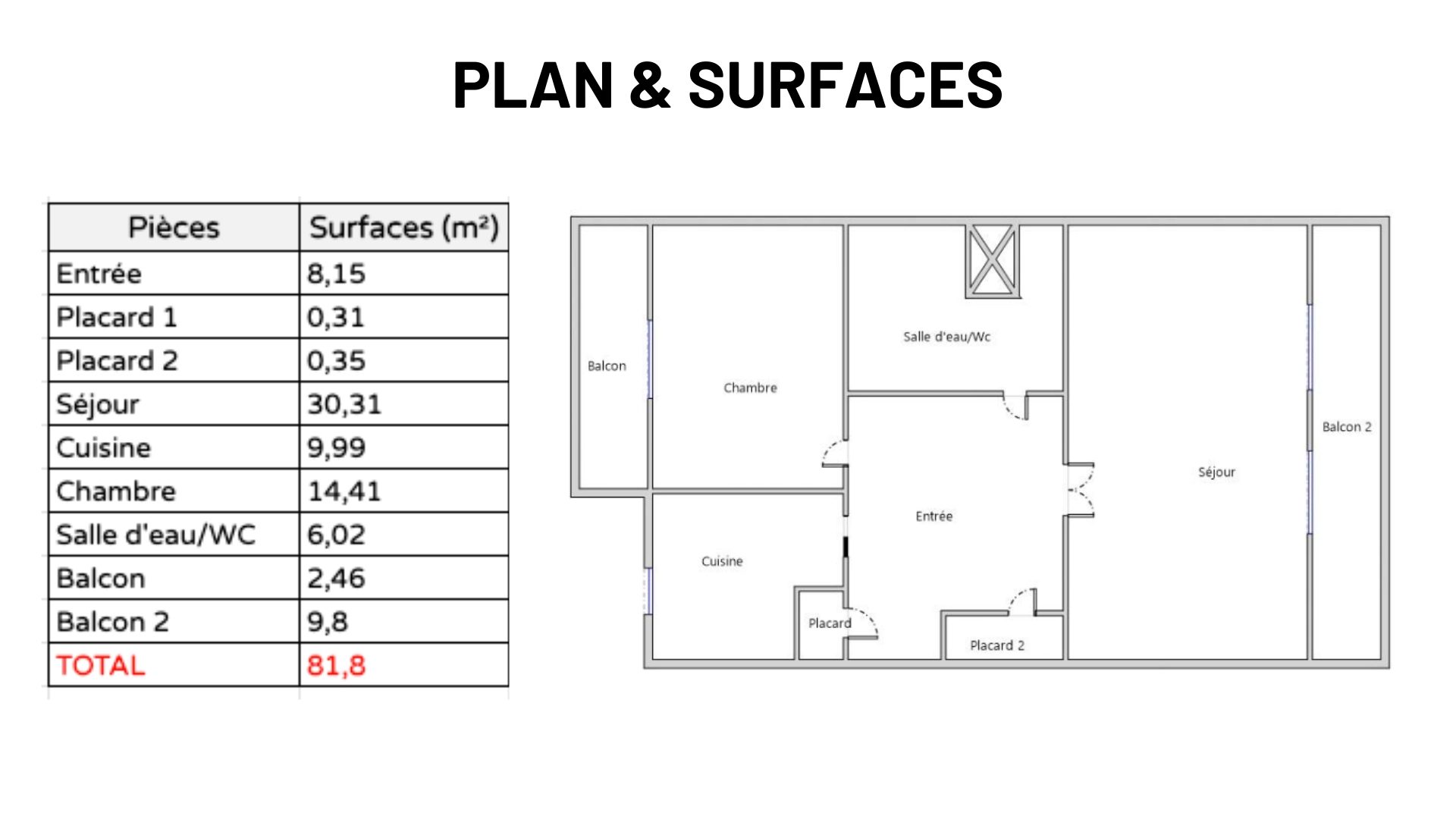 Cet appartement offre une surface totale de 69,54m² Carrez comprenant un spacieux séjour de 30m² , une cuisine séparée, salle d'eau, une grande chambre de 15m² et de nombreux rangements intégrés. Vous profiterez également de 2 balcons de 10m² et 2,5m² protégés par store banne manuel.