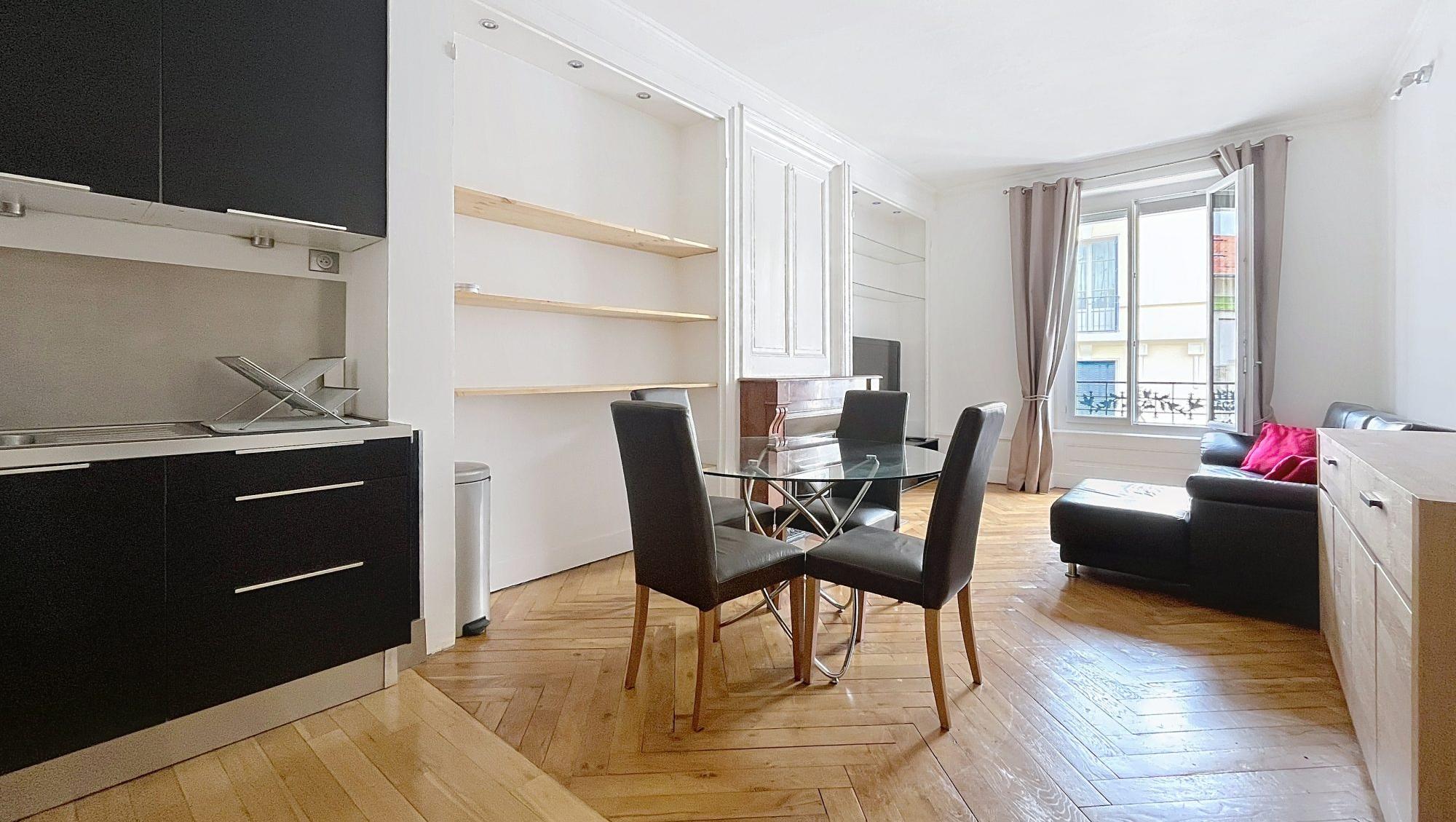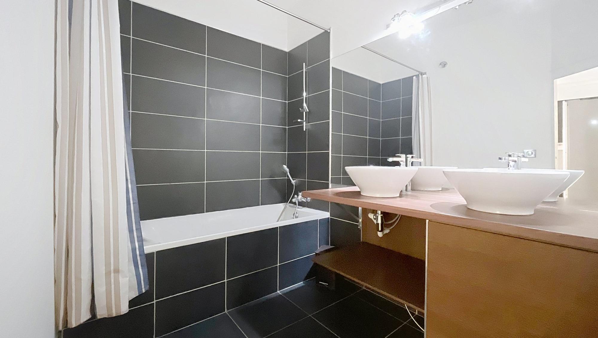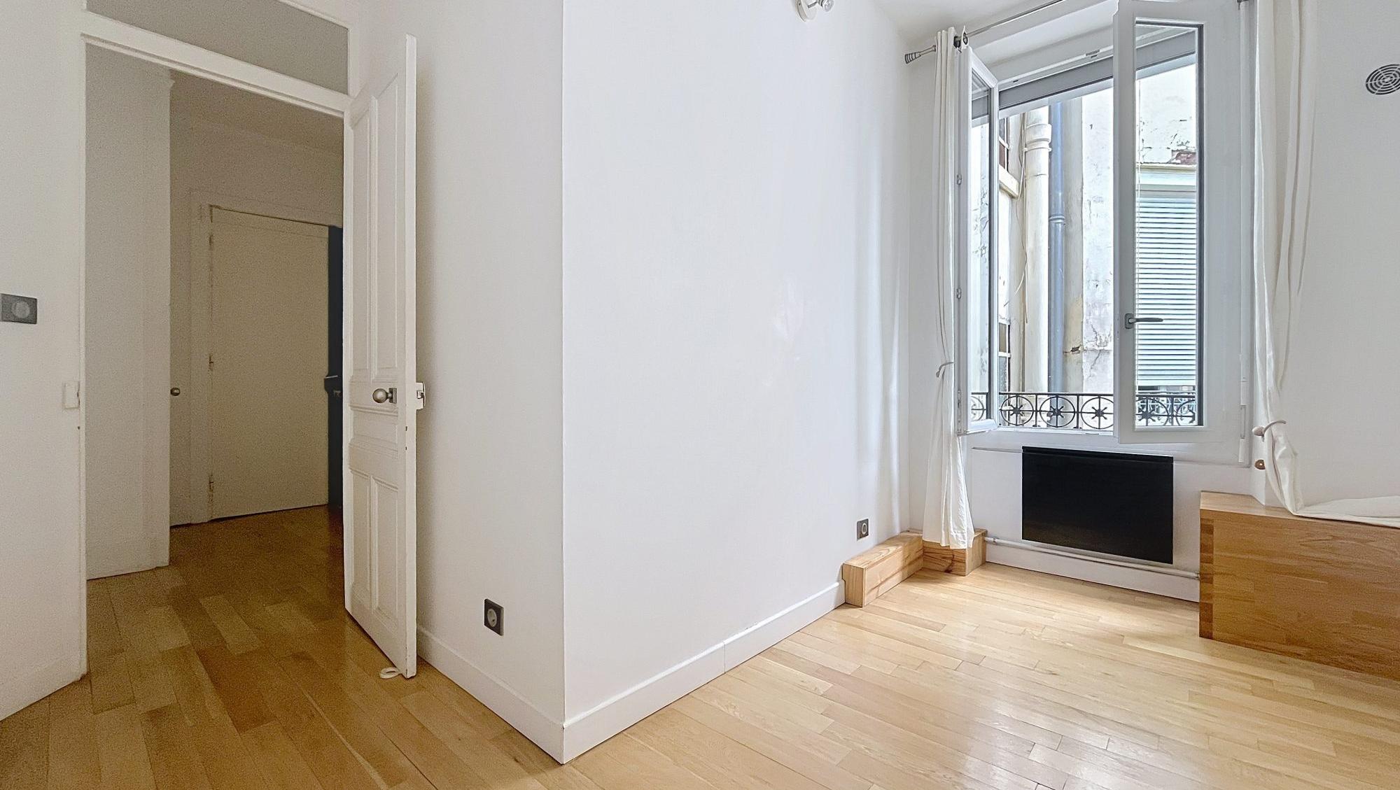 L’espace nuit comprend deux chambres : l’une sur cour avec rangements, l’autre côté rue, plus spacieuse. La cuisine est ouverte sur le séjour. Salle de bain avec double vasque.