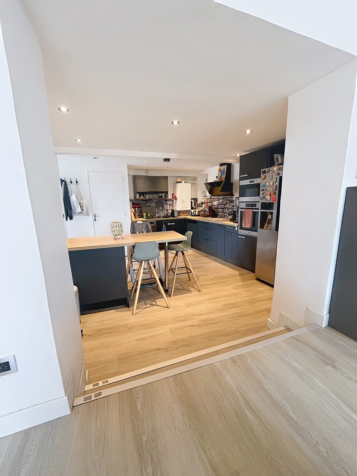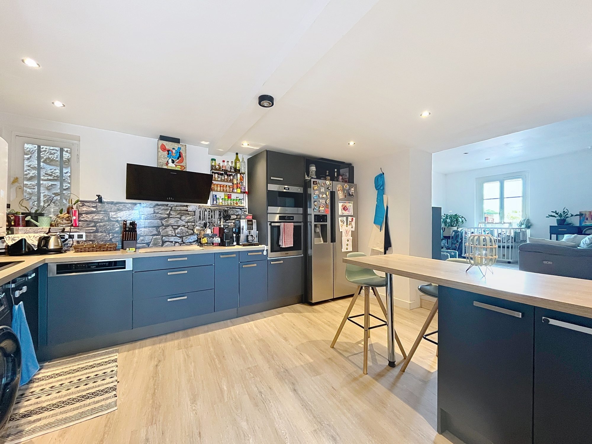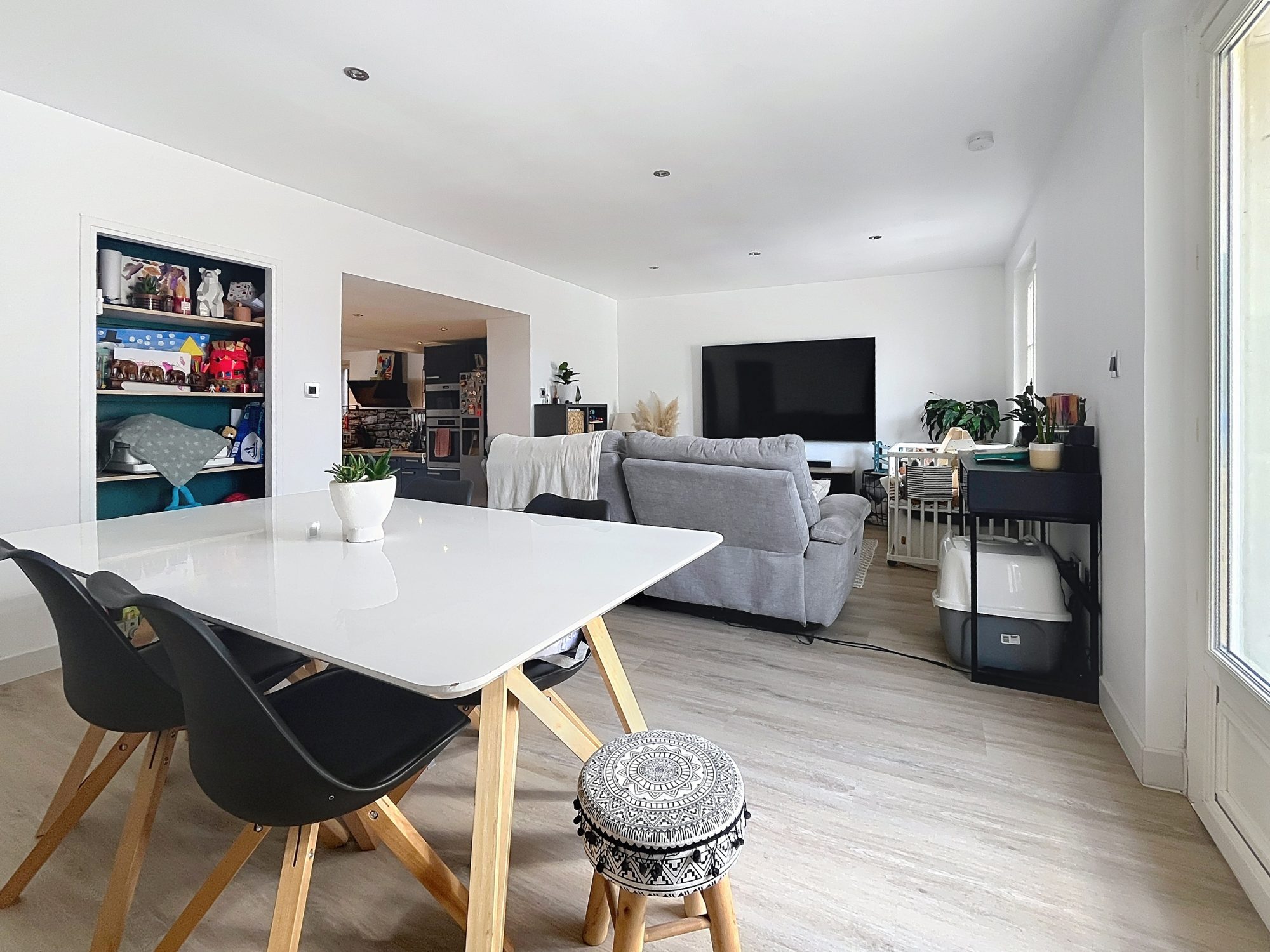 La pièce de vie et son sol parquet de 37 m2 se compose d'une cuisine ouverte sur salon avec accès direct sur une belle terrasse aménagée de 44 m2, ainsi qu'un wc indépendant.