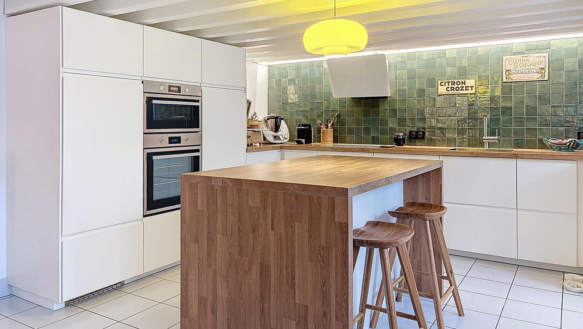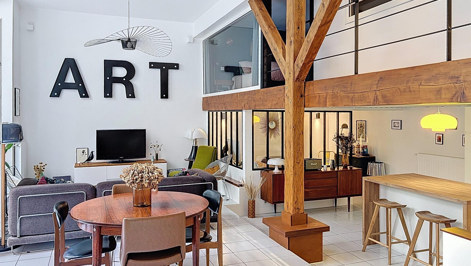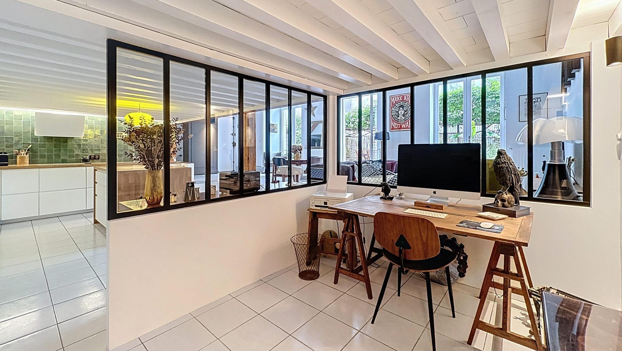 L’entrée se fait dans le vaste espace de vie d'environ 50 m² qui inclut le séjour et une très belle cuisine. Par transparence (verrière) et à demi-ouvert, on aperçoit le bureau.