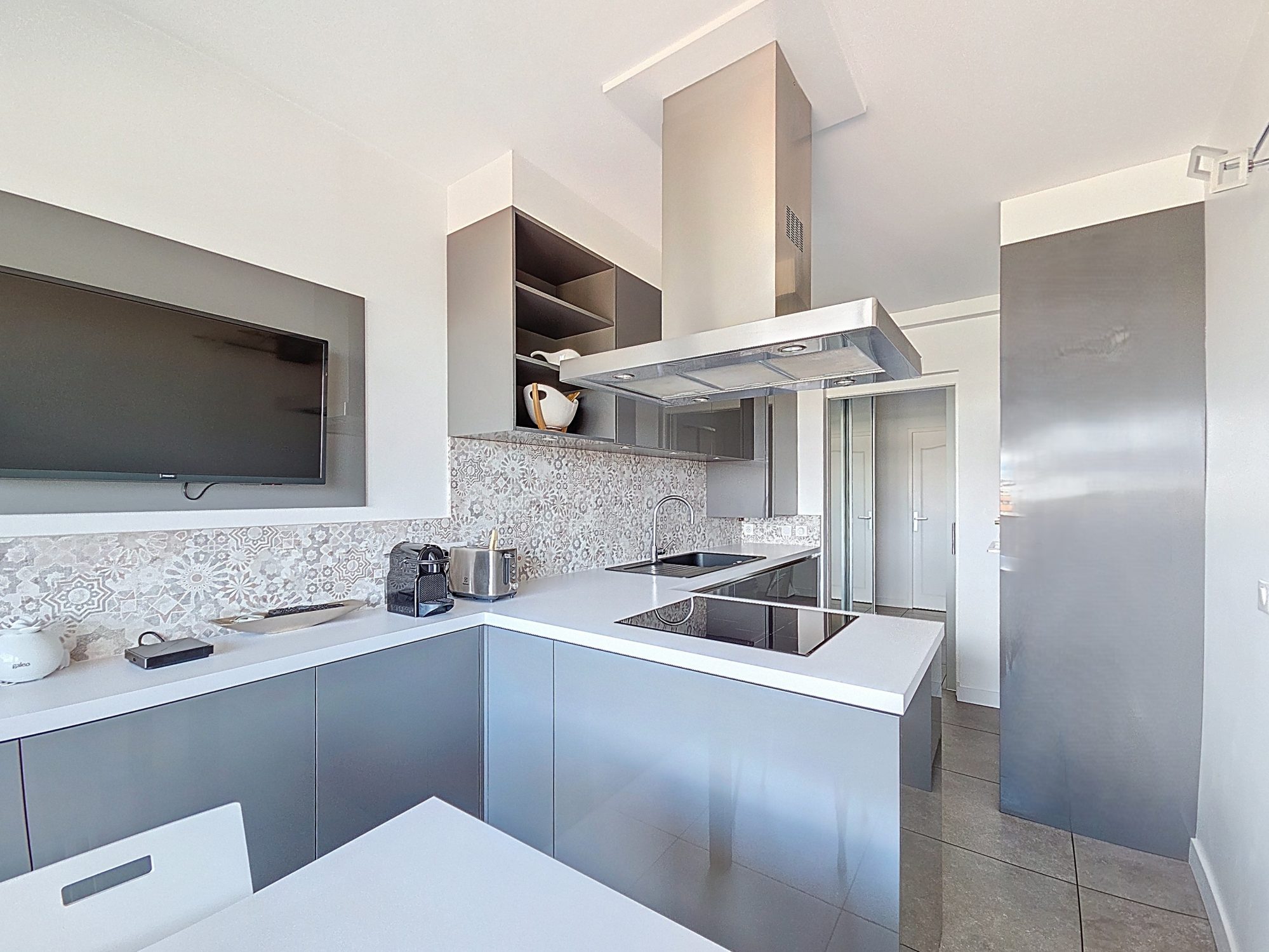 L'entrée dessert une spacieuse pièce de vie de plus de 37 m2 ( possibilité de créer une 3ème chambre) donnant sur un balcon de 12 m2, une cuisine indépendante parfaitement meublée et équipée (Four, Micro ondes, Hotte, plaque de cuisson induction, Lave vaisselle, Réfrigérateur), avec accès direct au balcon.