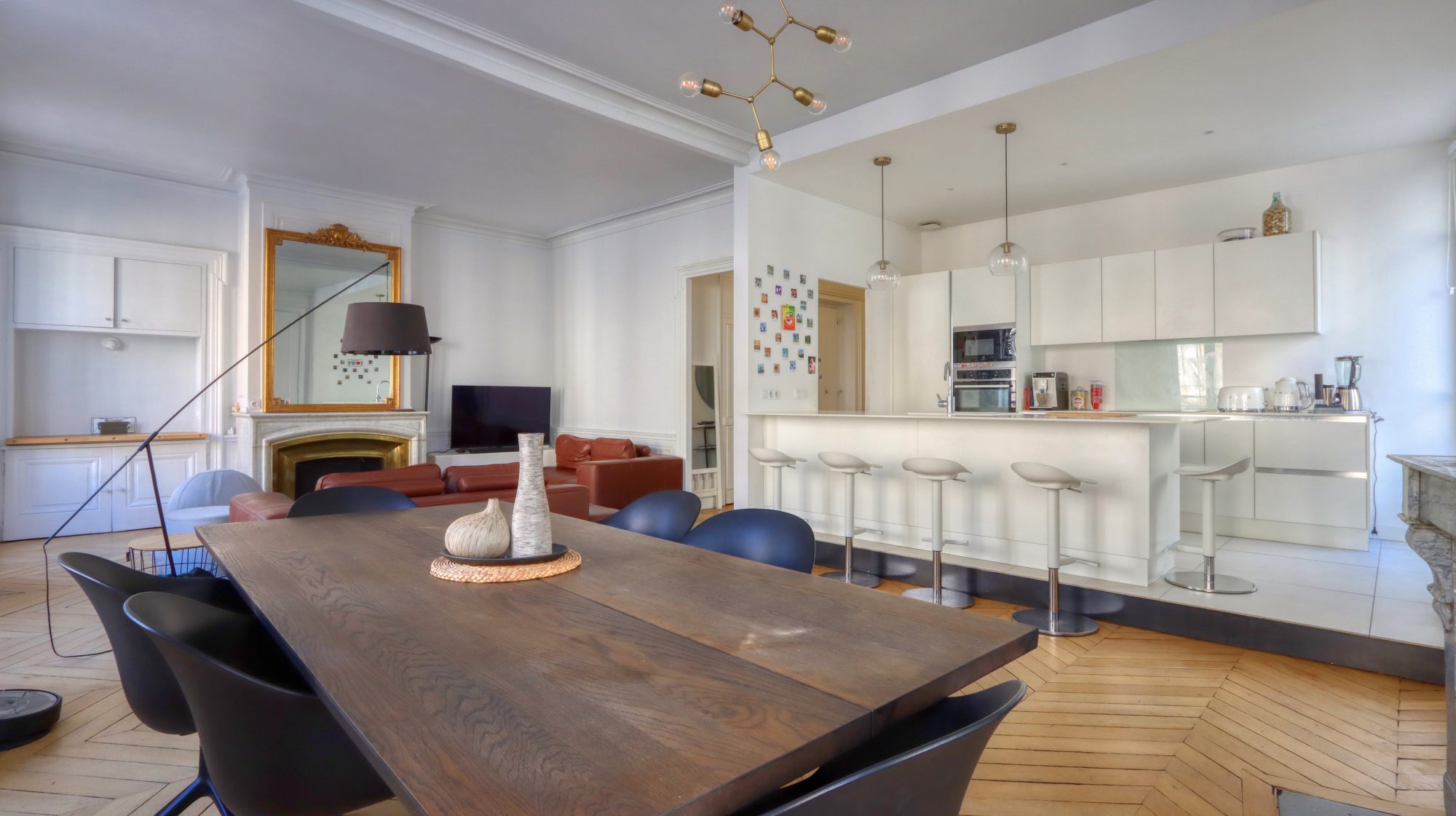 Une grande pièce de vie avec 6 fenêtres, parquet chevron, hauteur sous plafond, cheminées, cuisine ouverte contemporaine aménagée et équipée.