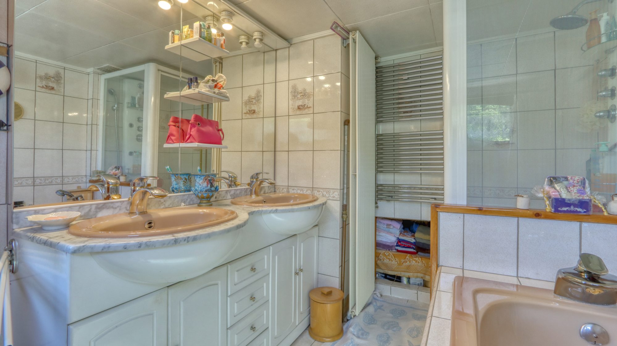 Il y à une salle de bain avec une double vasque et une douche sur l'arrière de la Péniche.