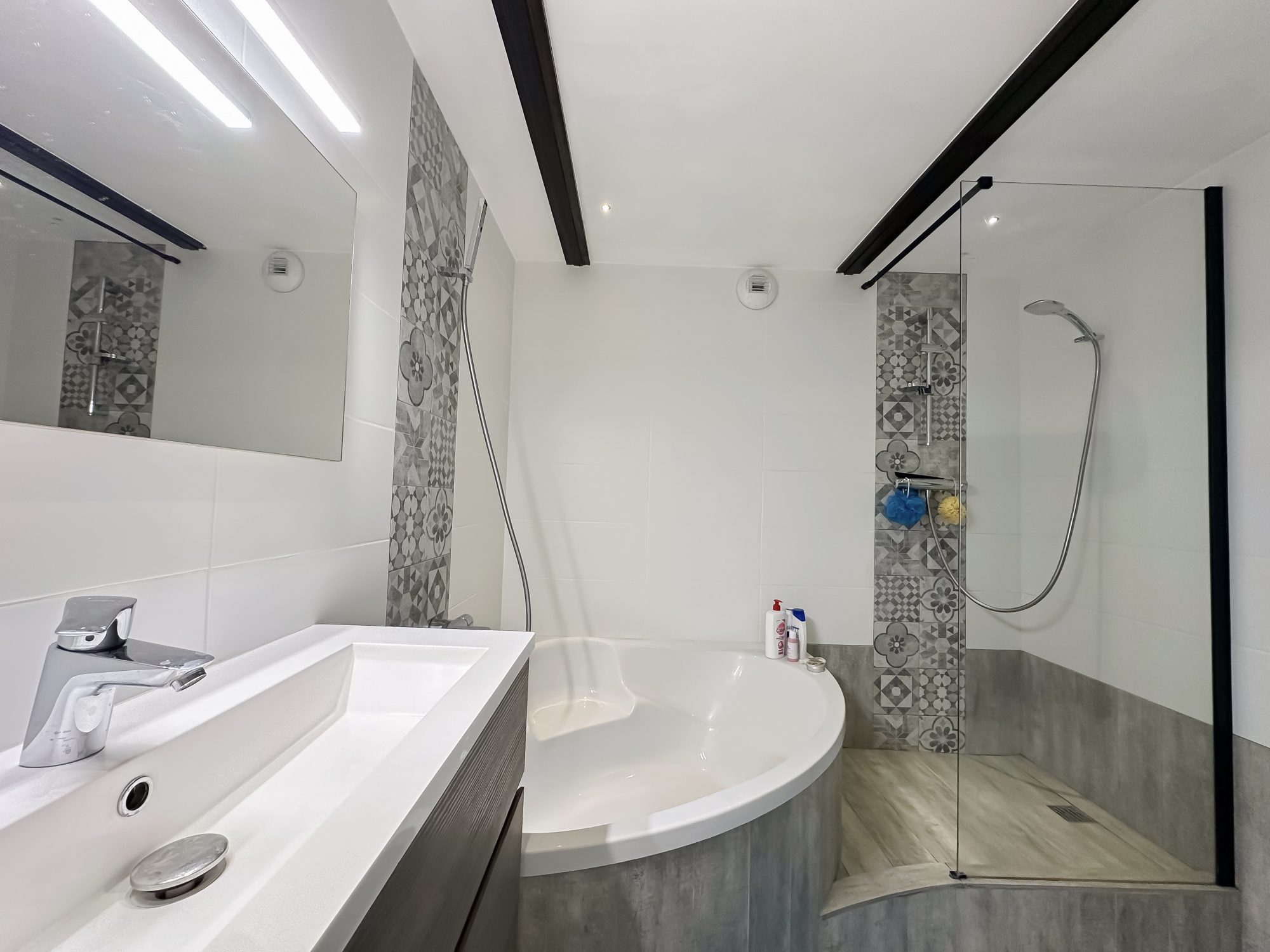 Cuisine/salle à manger de 28 m² climatisée, deux chambres, salle de bains (avec douche et baignoire), WC indépendant, coin buanderie.