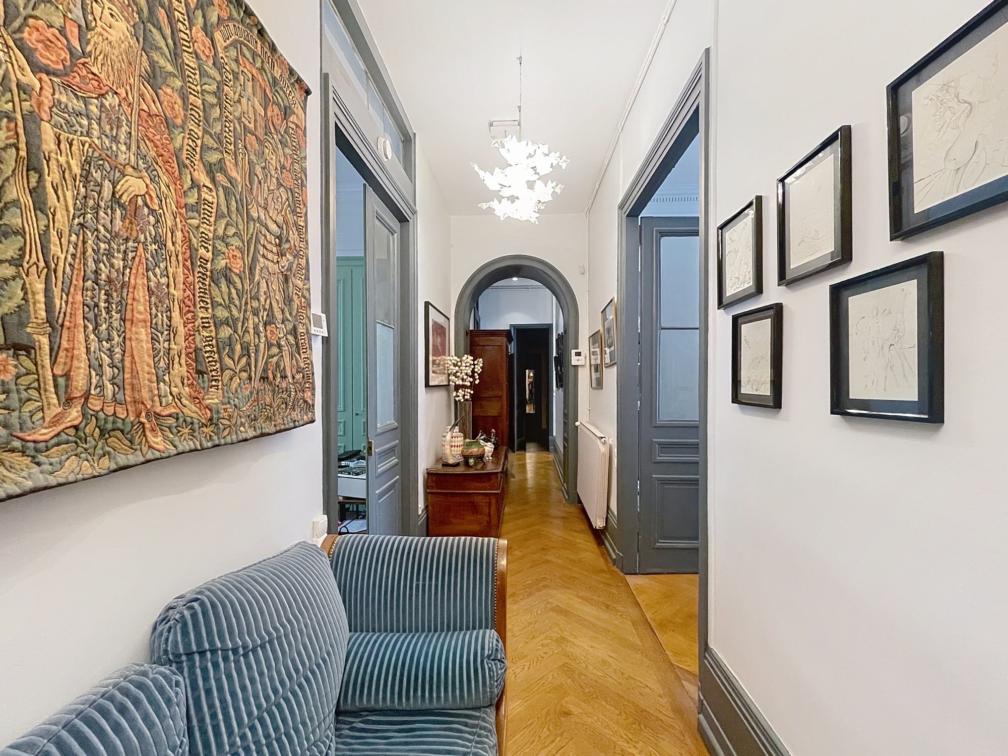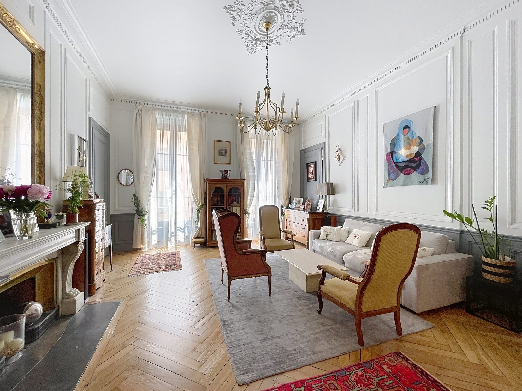 Situé au 1er étage sans ascenseur, cet appartement bourgeois traversant et lumineux vous séduira par son agencement et ses matériaux de qualité. Dès l'entrée, vous apprécierez ses placards, son parquet en chevron, sa hauteur sous plafond, ses boiseries et ses cheminées, autant de détails qui raviront les amateurs de l'ancien.