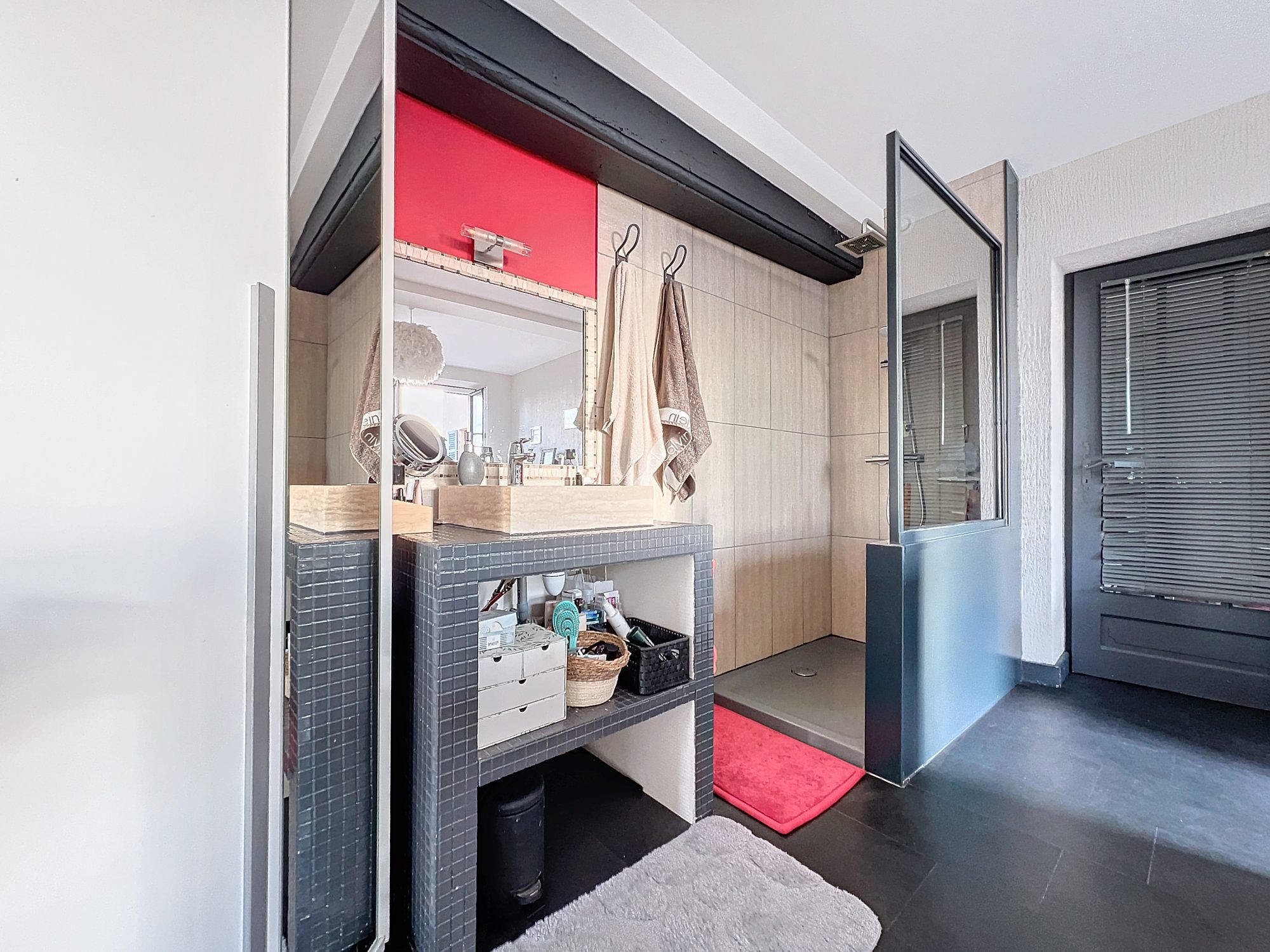La suite parentale lumineuse avec une salle d'eau avec un accès sur la terrasse.