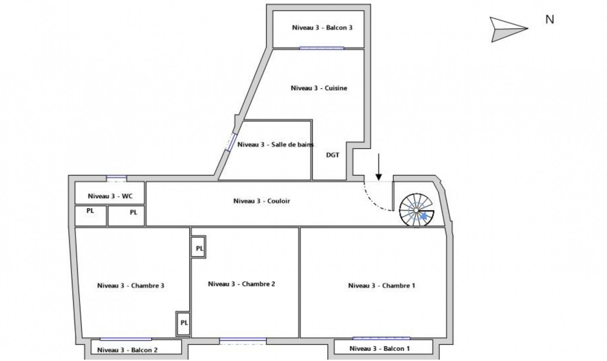 Au 3ème, nous avons le coin nuit avec 3 grandes chambres, d'une salle de bain, d'un WC séparé et une pièce dressing actuellement qui peut être une nouvelle chambre (anciennement une cuisine).