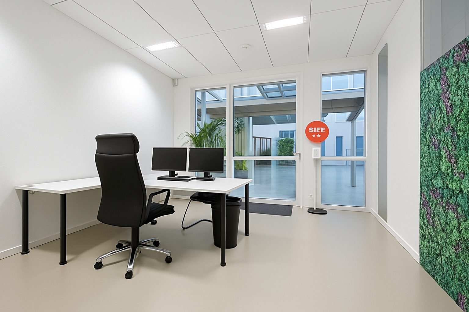 Site clos. Accès sécurisé par badge. Fibre optique. Cafétéria. Jardin. Accessibilité : Tram T2