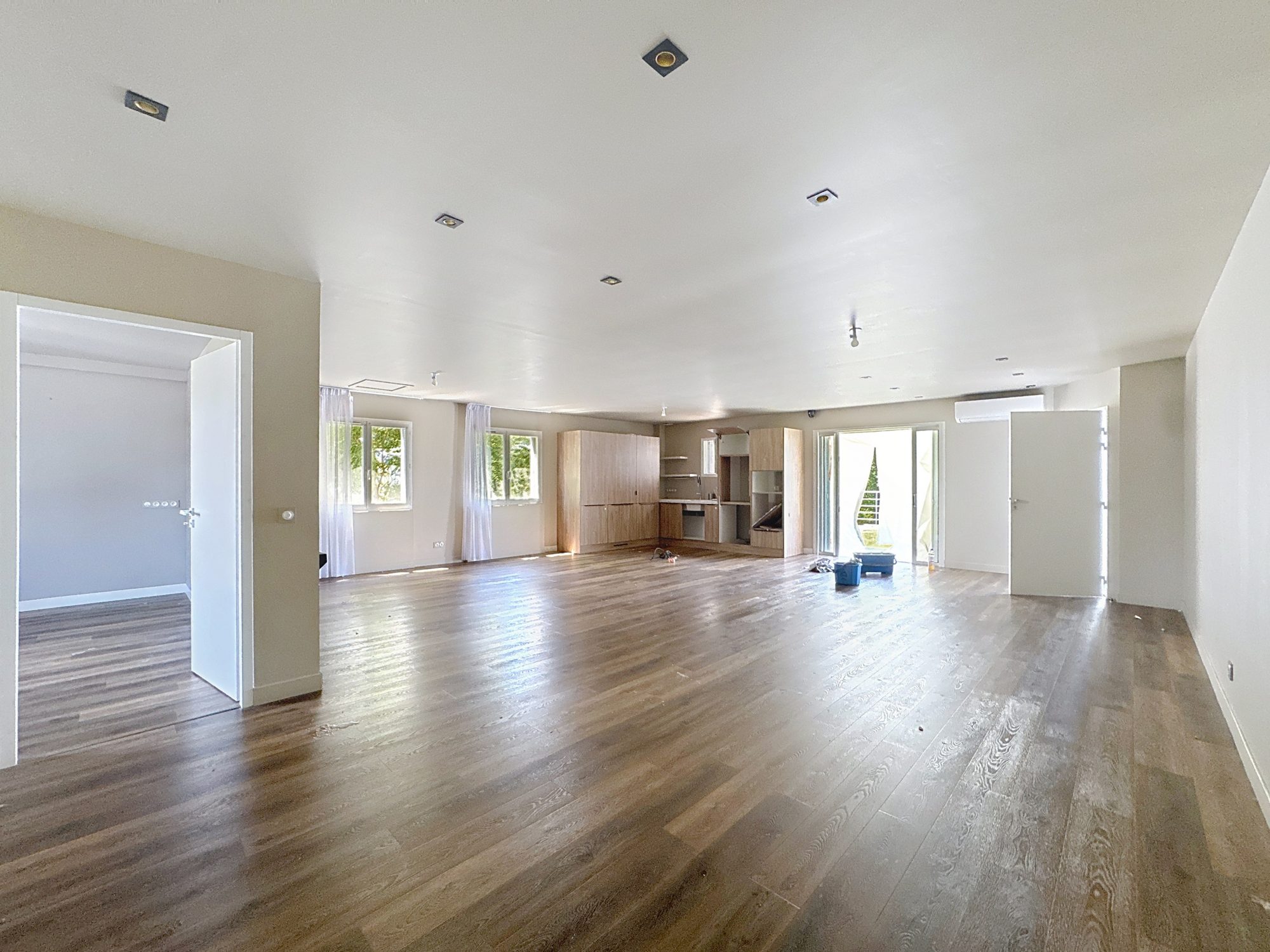 Nous avons donc une grande pièce de reception, un coin bar, une cave vitrée, deux toilettes PMR et une cuisine de 70m2.