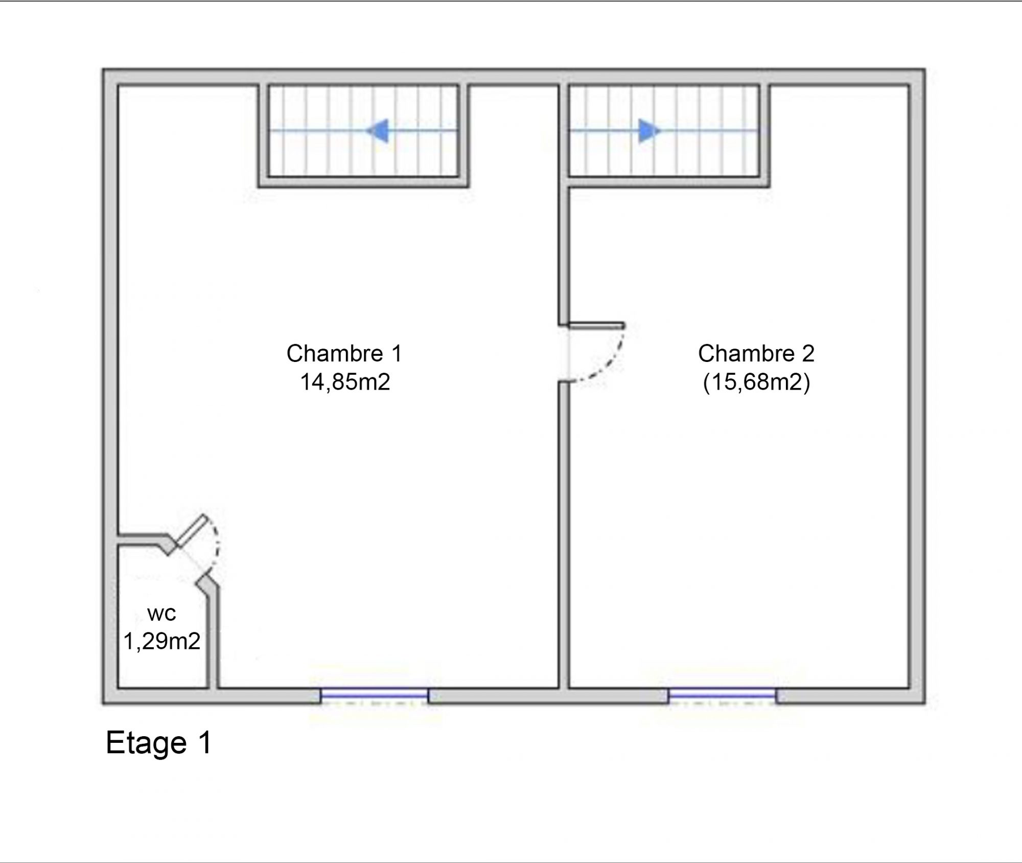 - Chambre 1 (Traversante vers Chambre 2): 14.85 m²