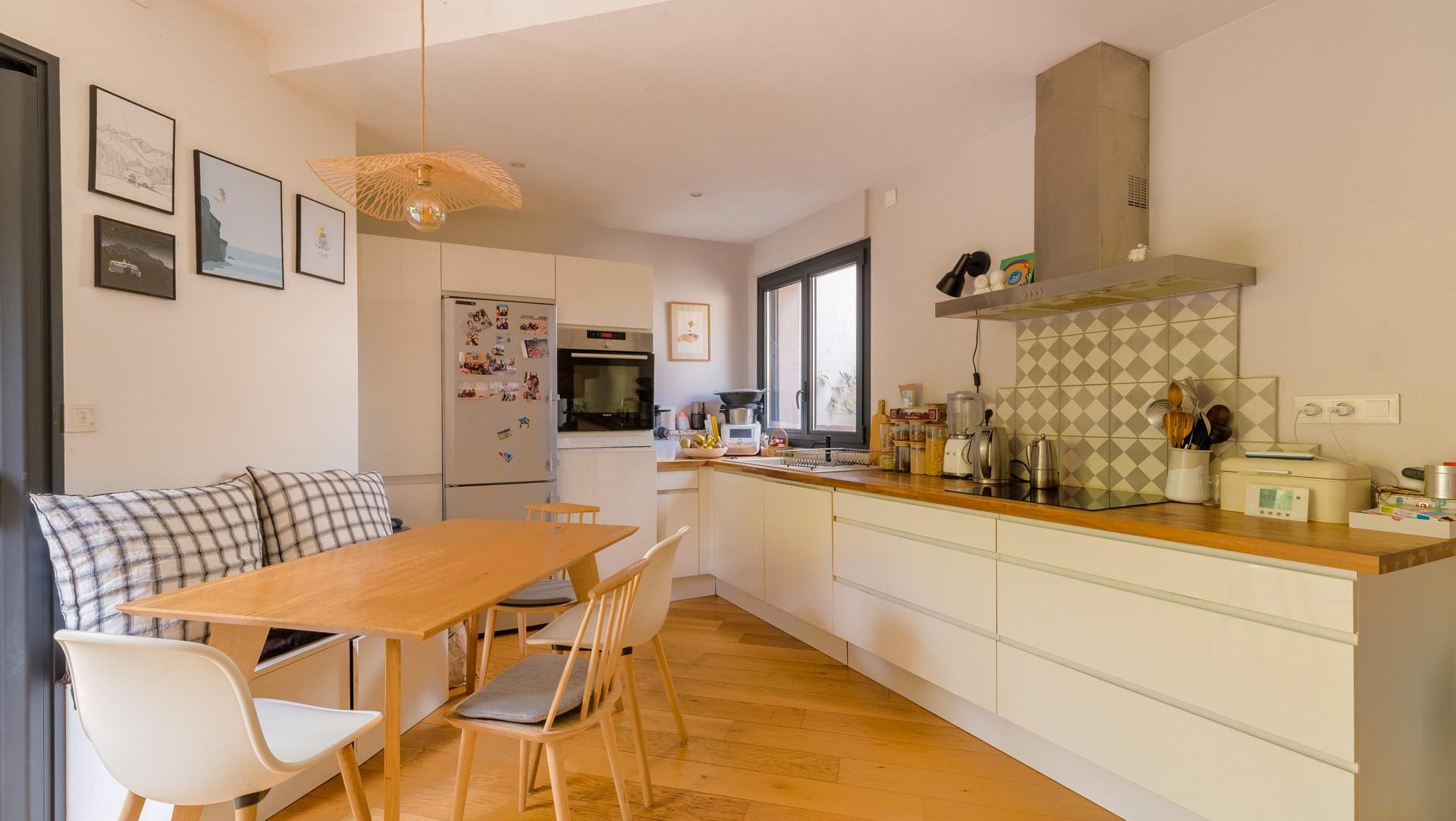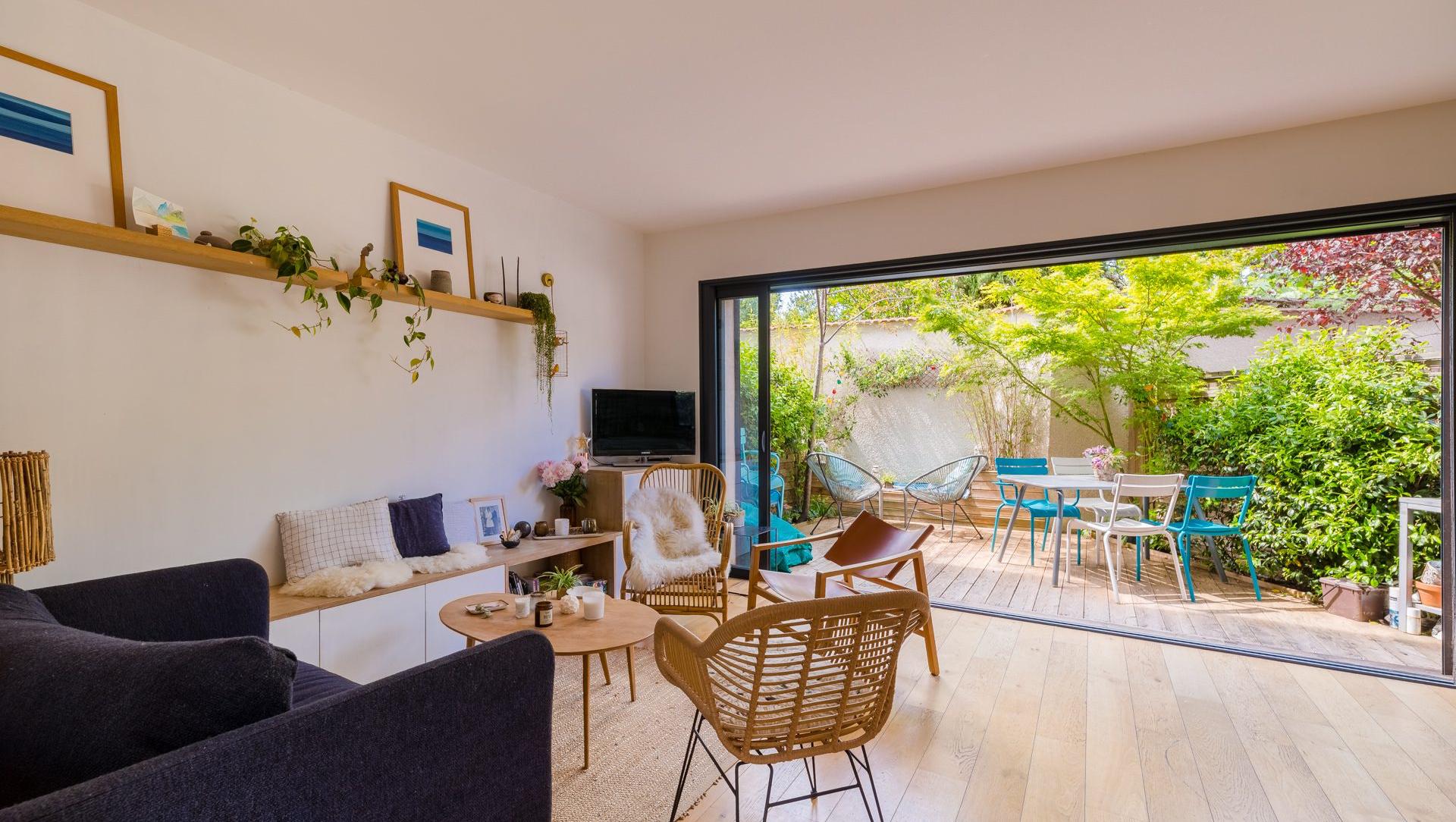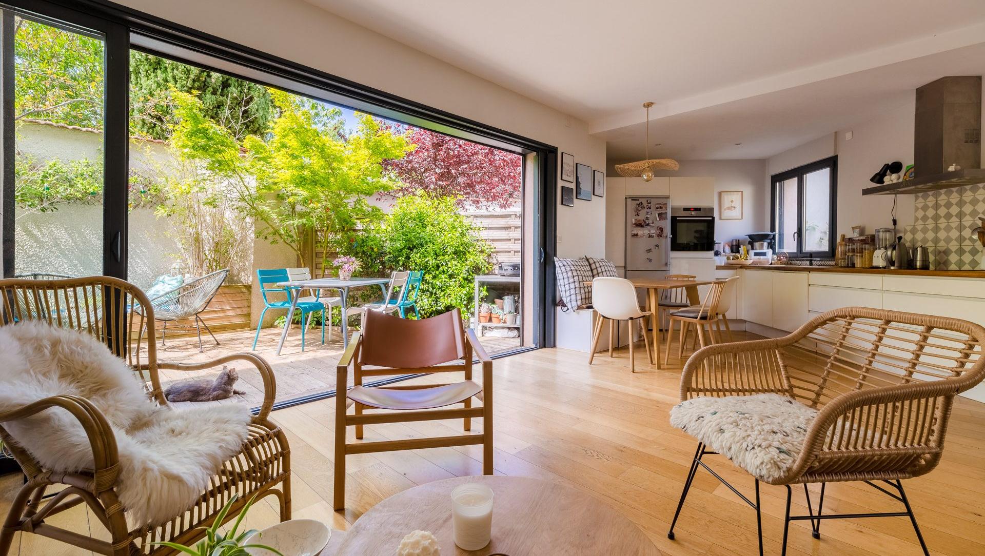 Découvrez cette maison contemporaine proposant des prestations de grande qualité et réalisées sur-mesure : parquet chêne massif, grande baie vitrée à galandage ouverte sur le patio, escalier sur mesure en chêne massif et acier trempé, salle de bains faite de carreaux de ciment et de béton, huisseries aluminium double vitrage anti UV...