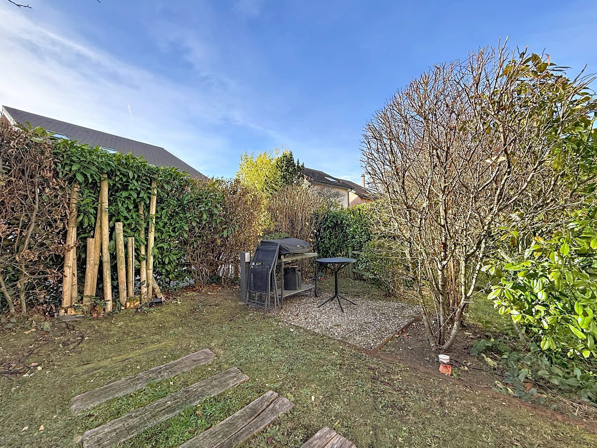 L'extérieur à l'arrière de la maison avec sa terrasse en composite et un jardin aménagé avec espace barbecue, la parcelle est d'environ 170m2.