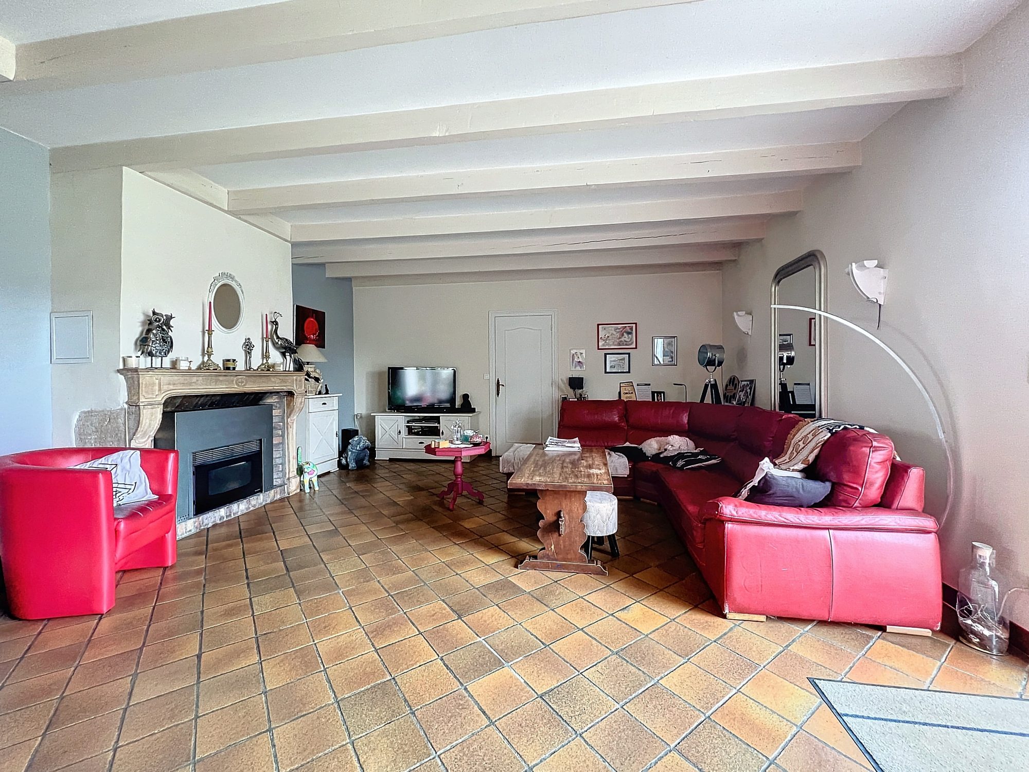 Elle se compose d'une grande cuisine équipée, d'un grand salon séjour avec cheminée / insert poêle à granulés, de deux chambres, d'une salle de bain avec douche et baignoire et d'un WC indépendant.