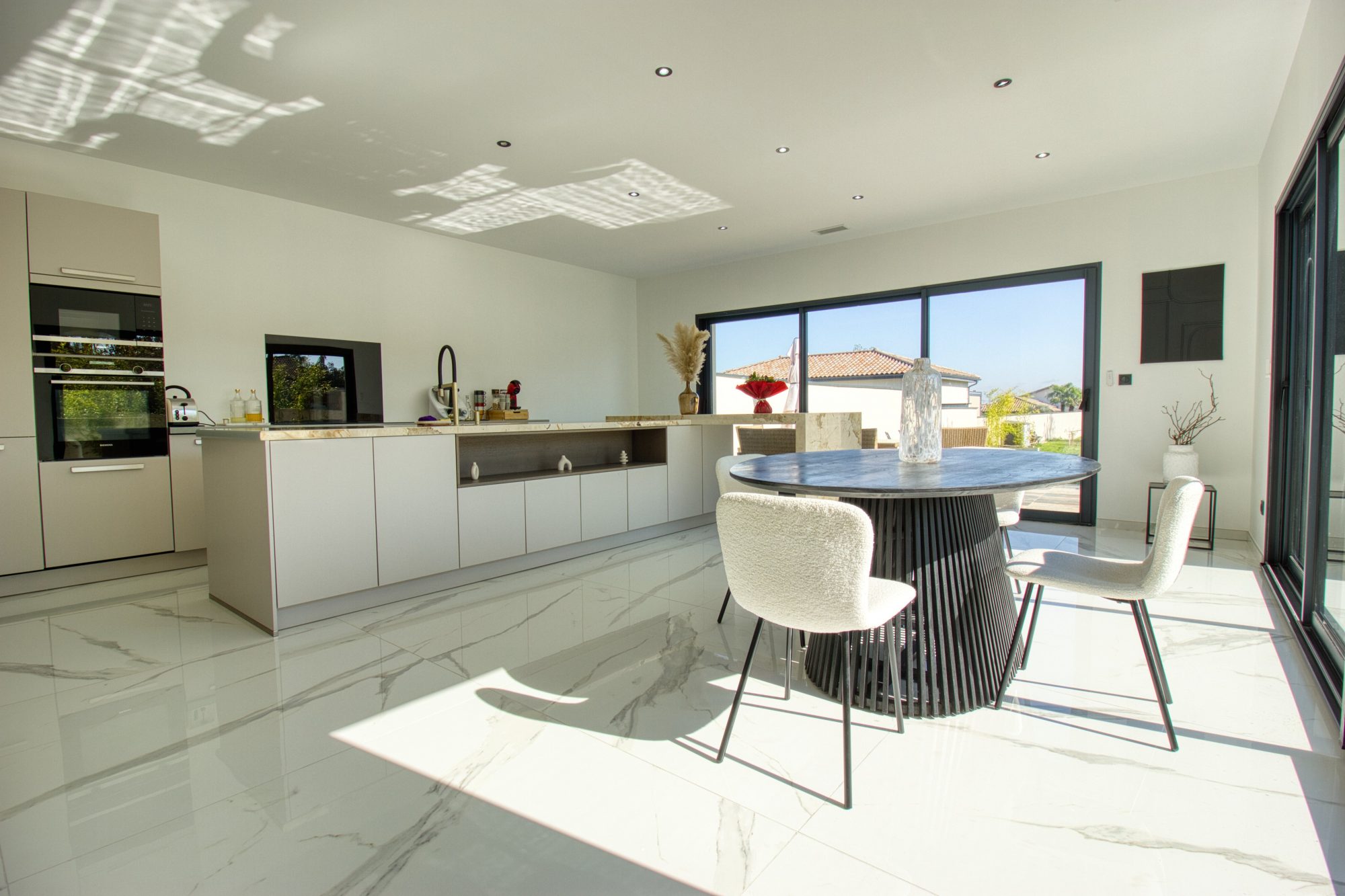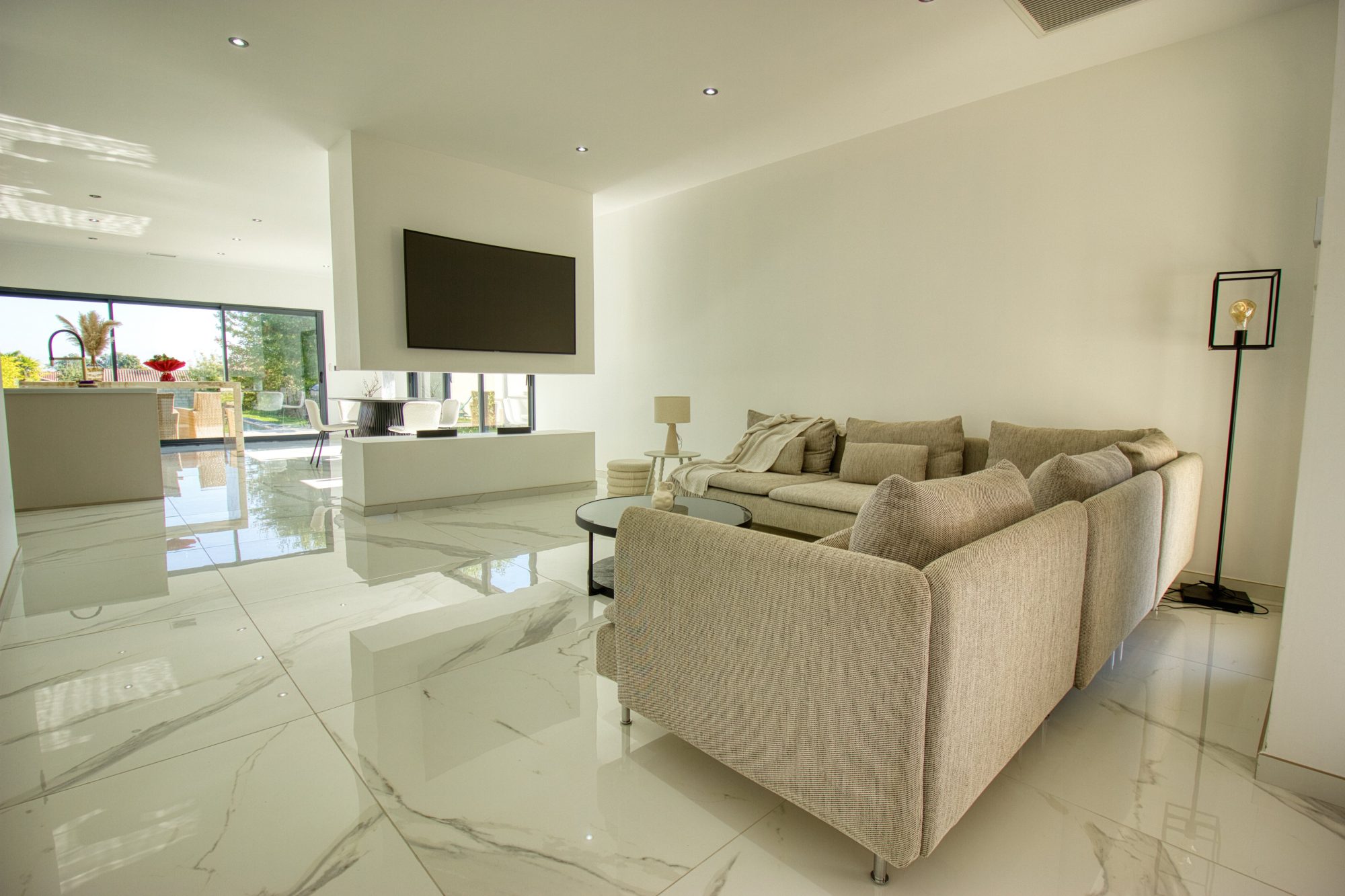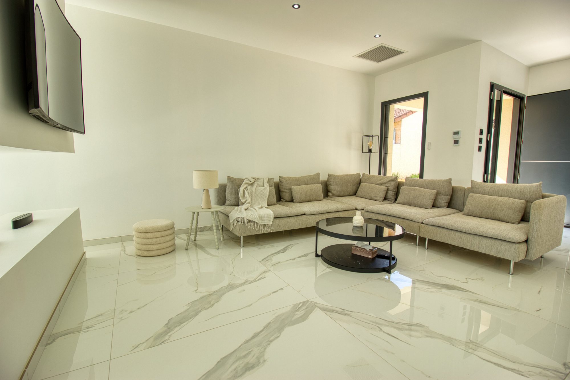 Cette villa est équipée d'une pompe à chaleur réversible gainable, d'ouvertures en aluminium à double vitrage, et d'une cuisine américaine aménagée et équipée.