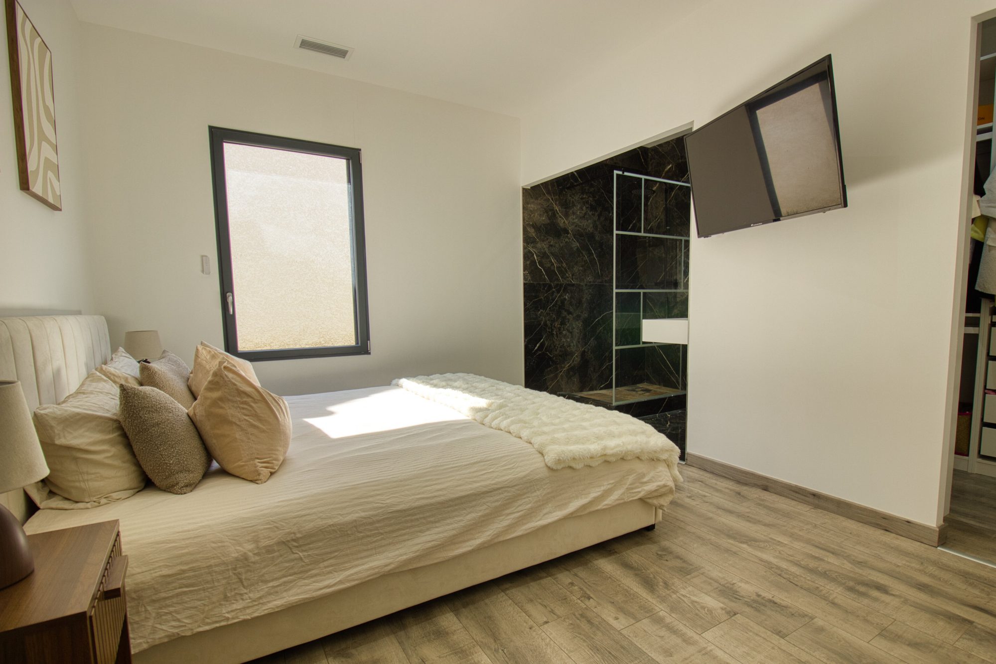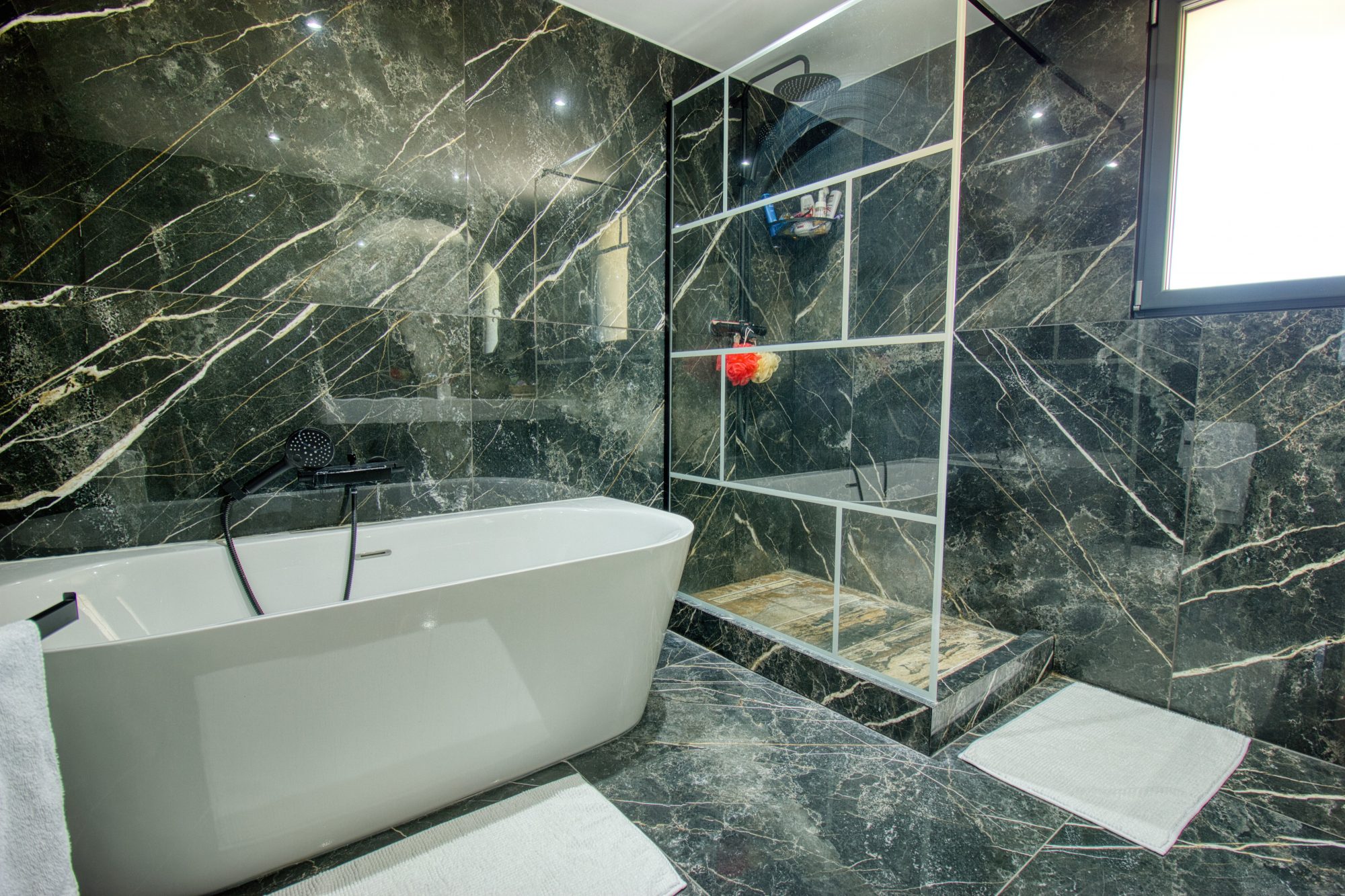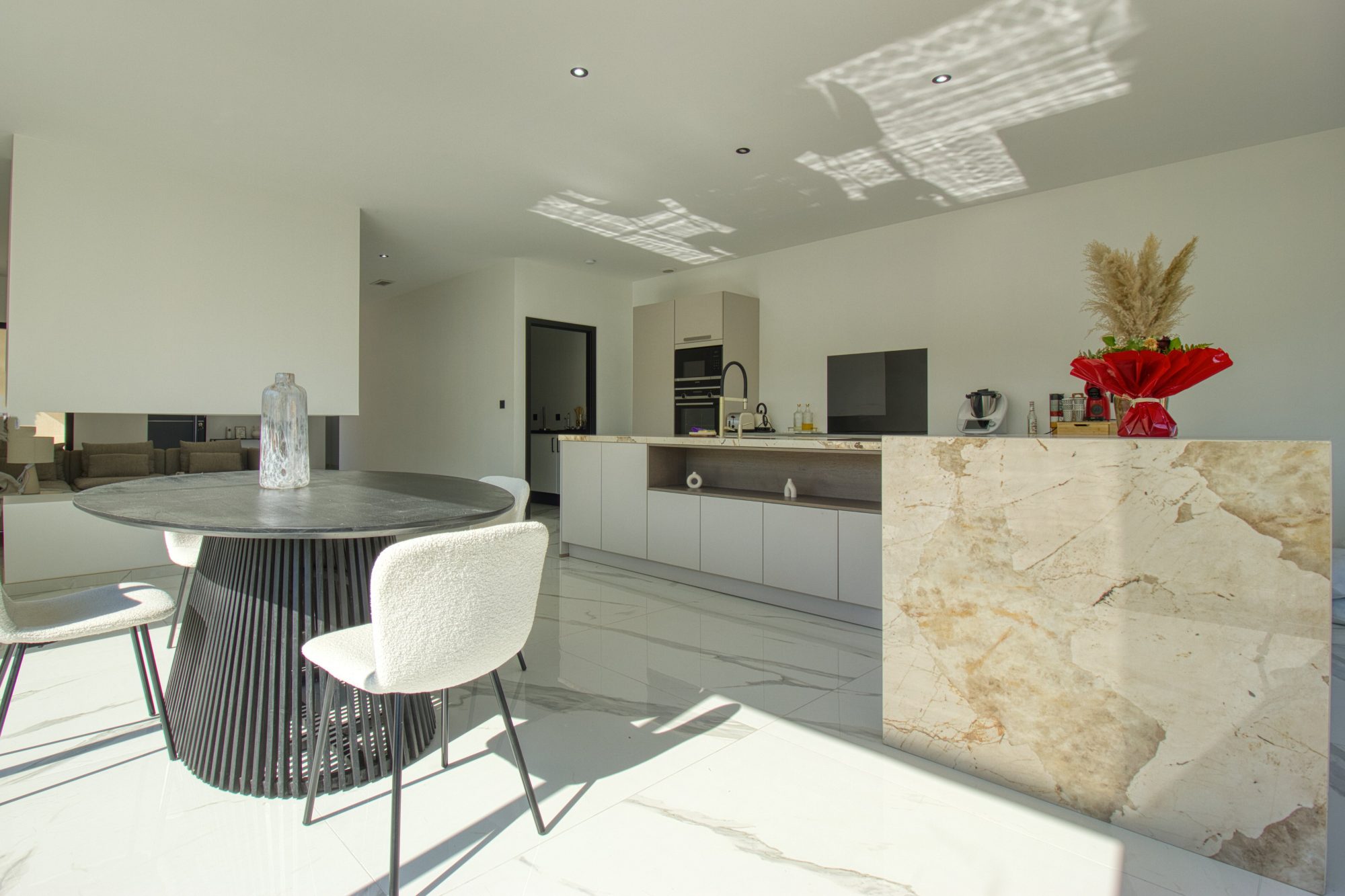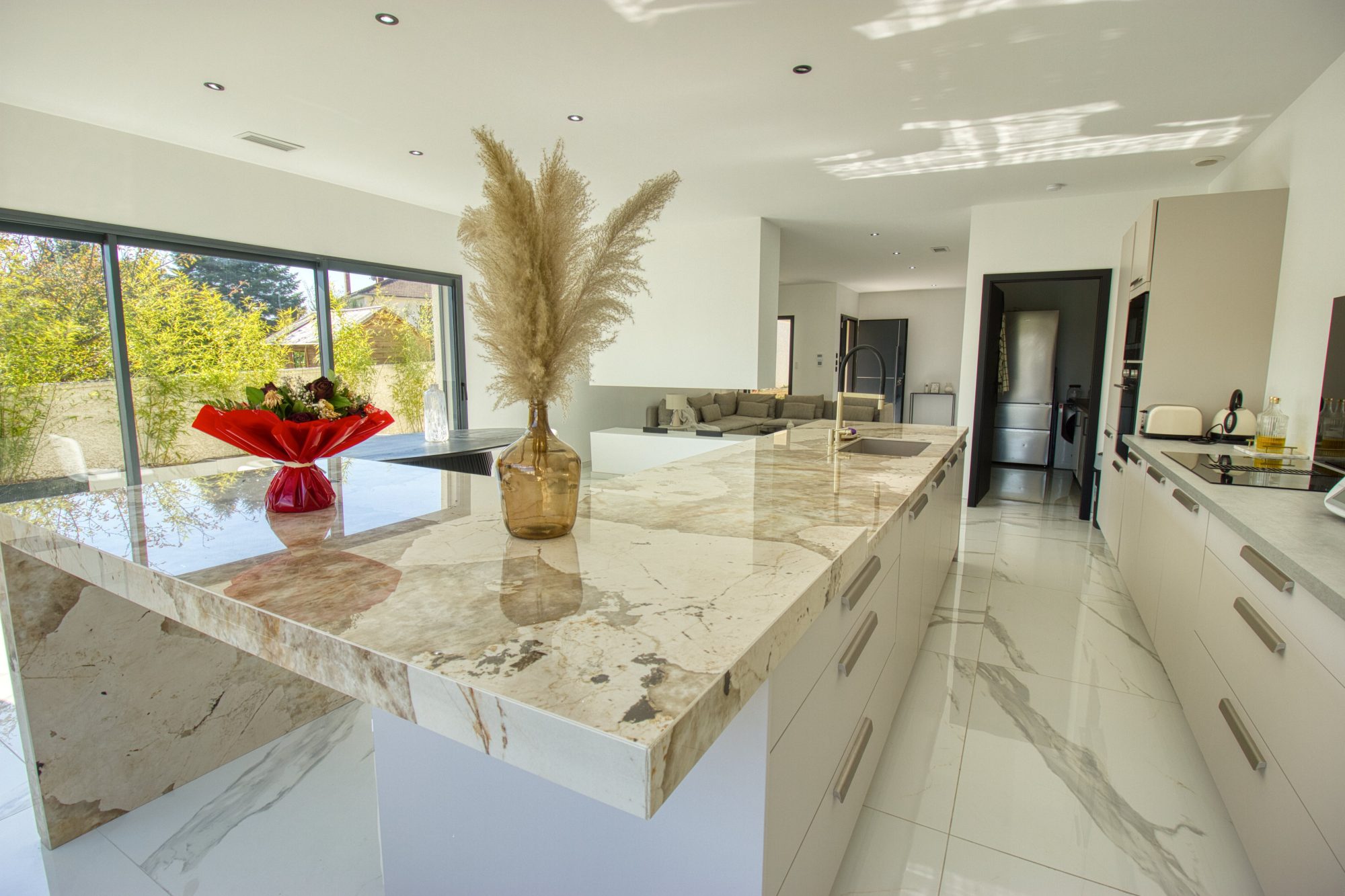 Cette villa est équipée d'une pompe à chaleur réversible gainable, d'ouvertures en aluminium à double vitrage, et d'une cuisine américaine aménagée et équipée.