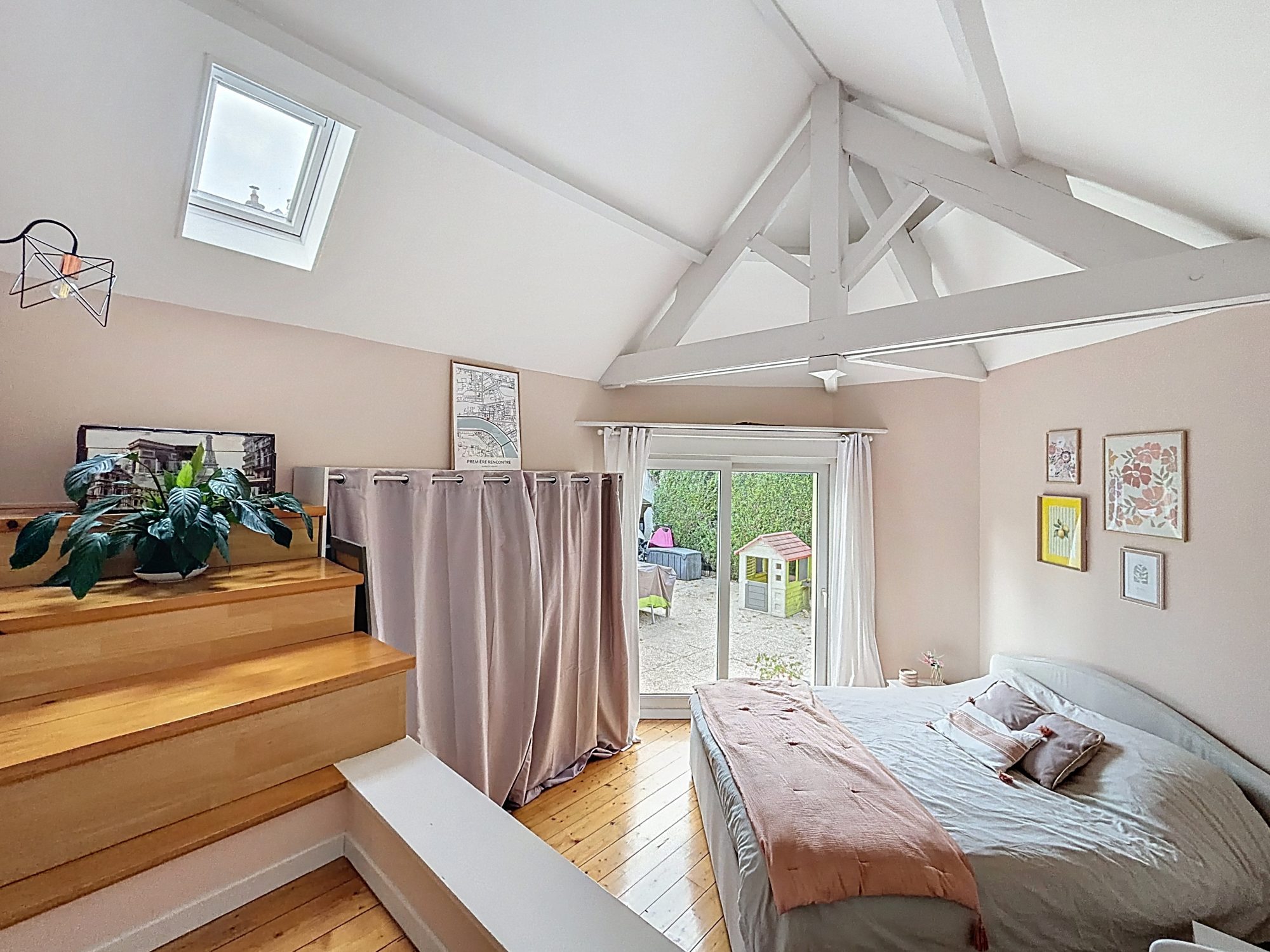 Au rez-de-chaussée, elle se compose d’un grand séjour lumineux de 40 m², d’une cuisine équipée agrémentée d’une élégante verrière, d'une chambre avec un superbe plafond cathédrale et un accès direct au jardin, et un toilette.