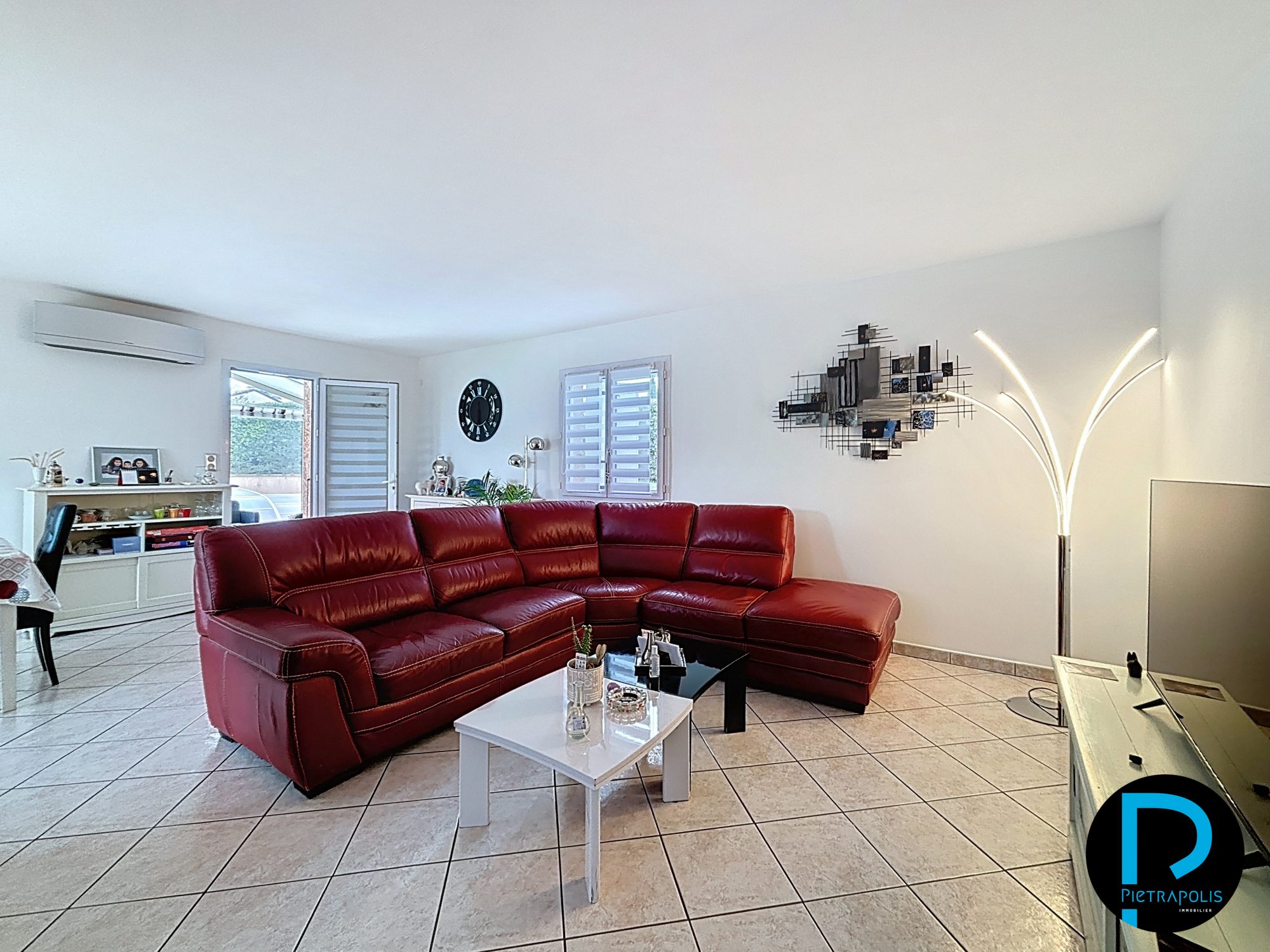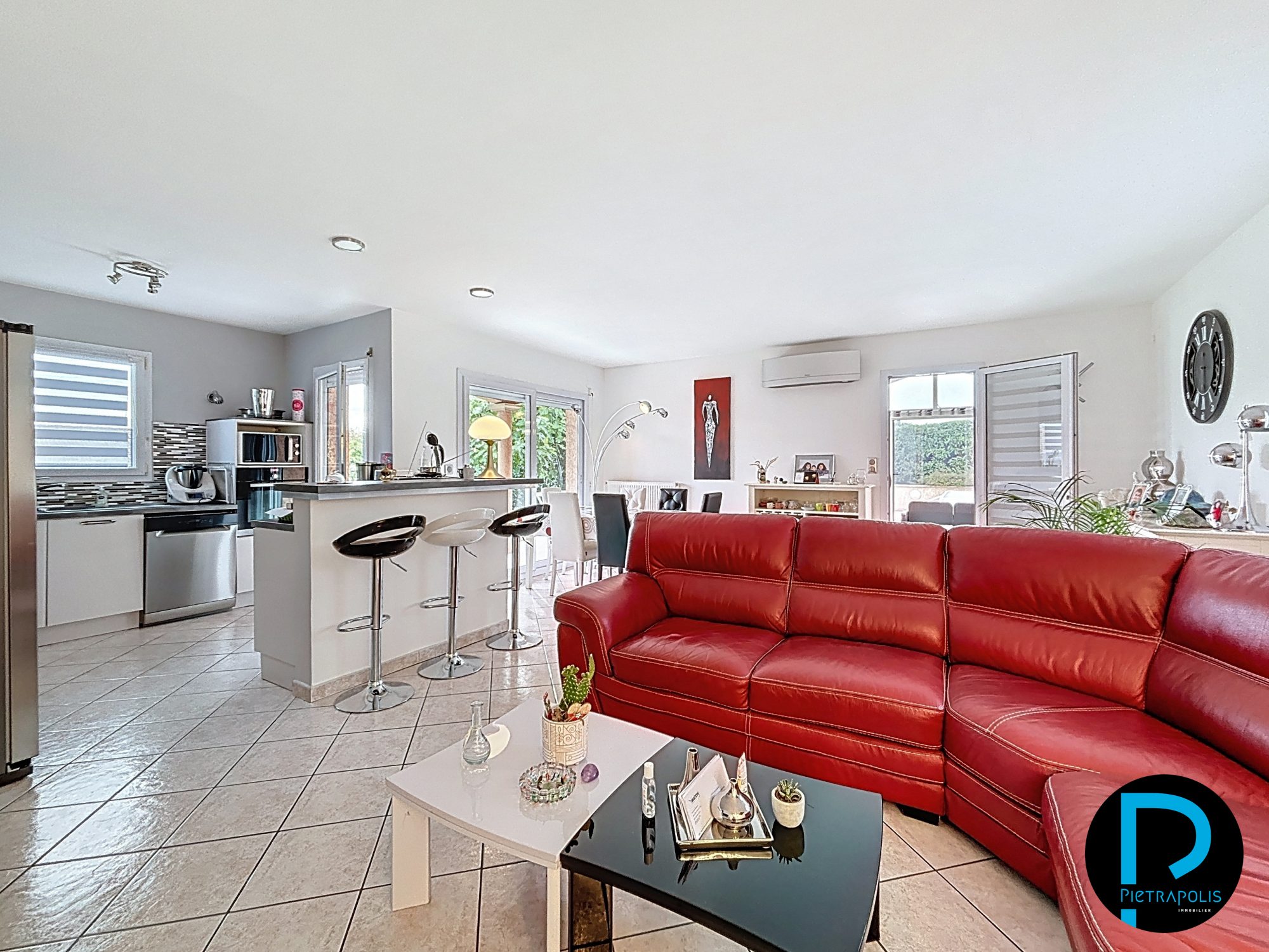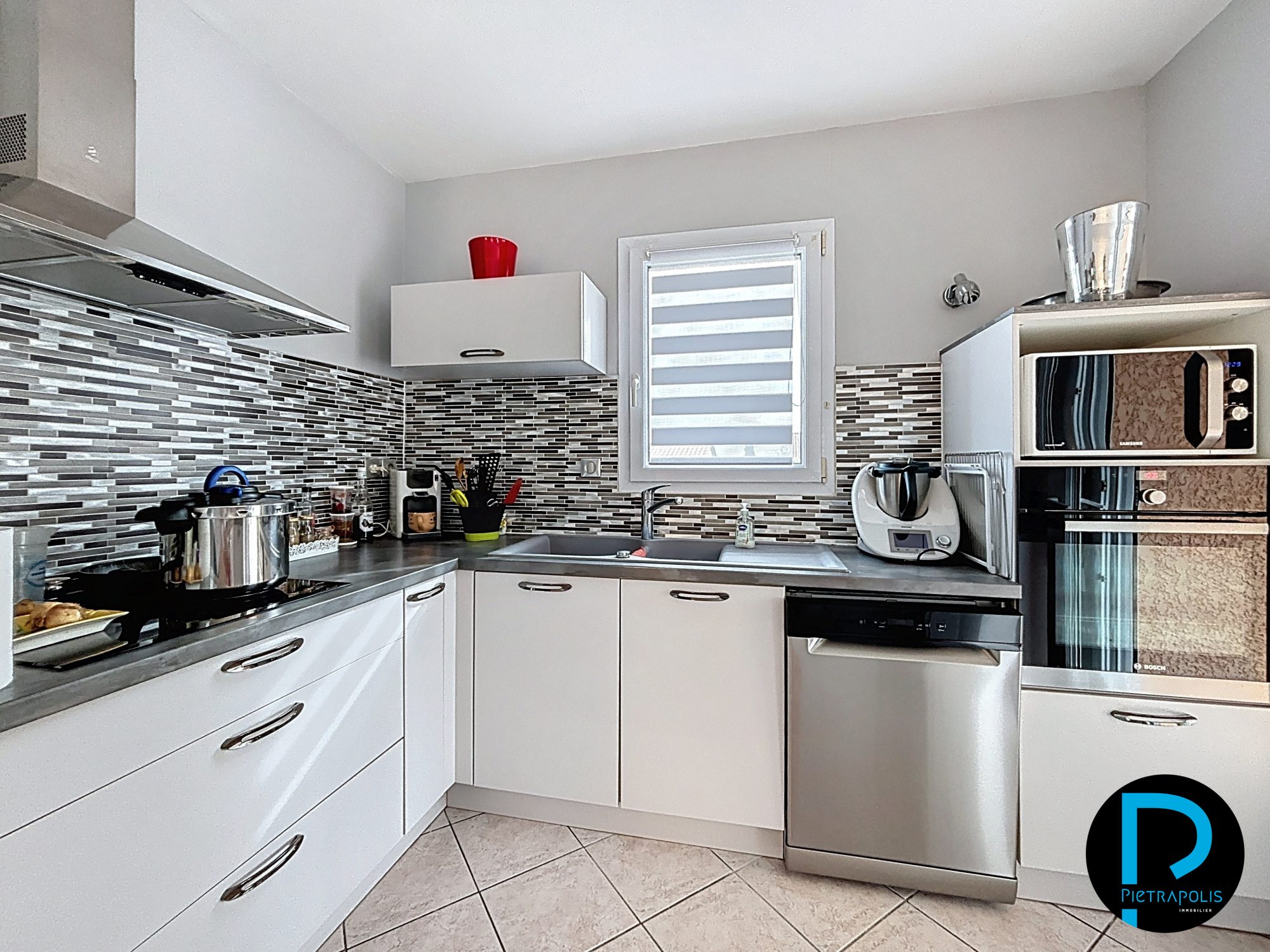 Elle se compose d’une entrée donnant sur une pièce de vie lumineuse avec cuisine équipée ouverte, prolongée par une véranda idéale pour profiter de la luminosité tout au long de l’année. Un couloir dessert trois chambres, une salle d’eau et un WC indépendant. La maison dispose également d’un accès direct à la buanderie et au garage attenant, apportant un vrai confort au quotidien.