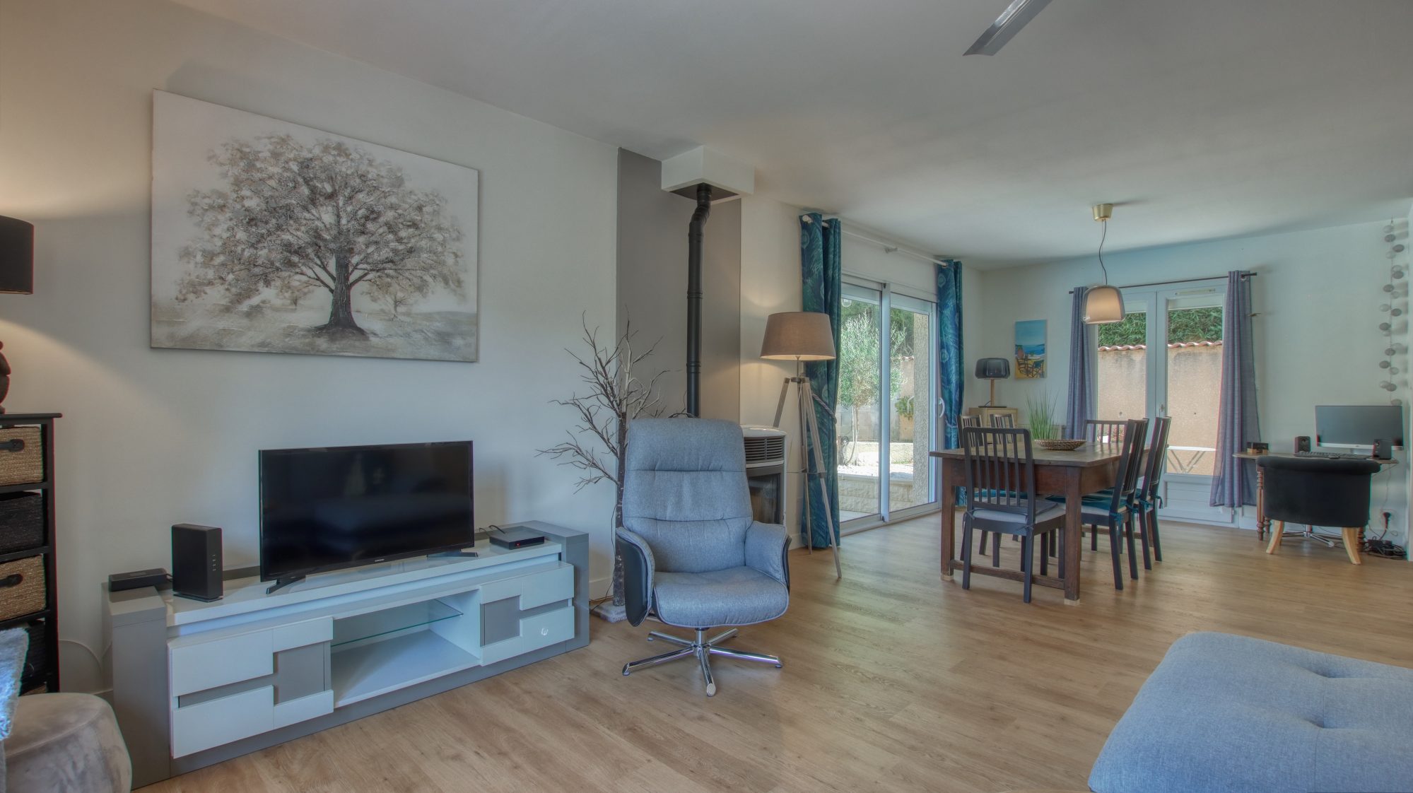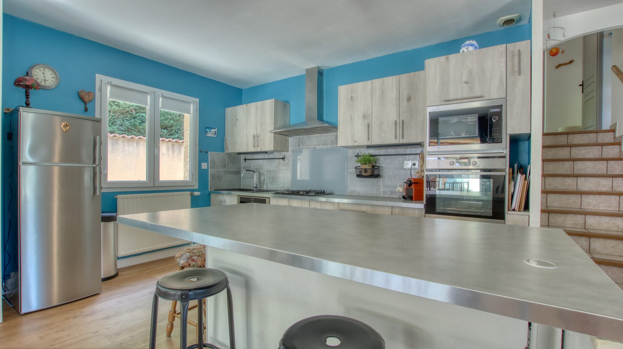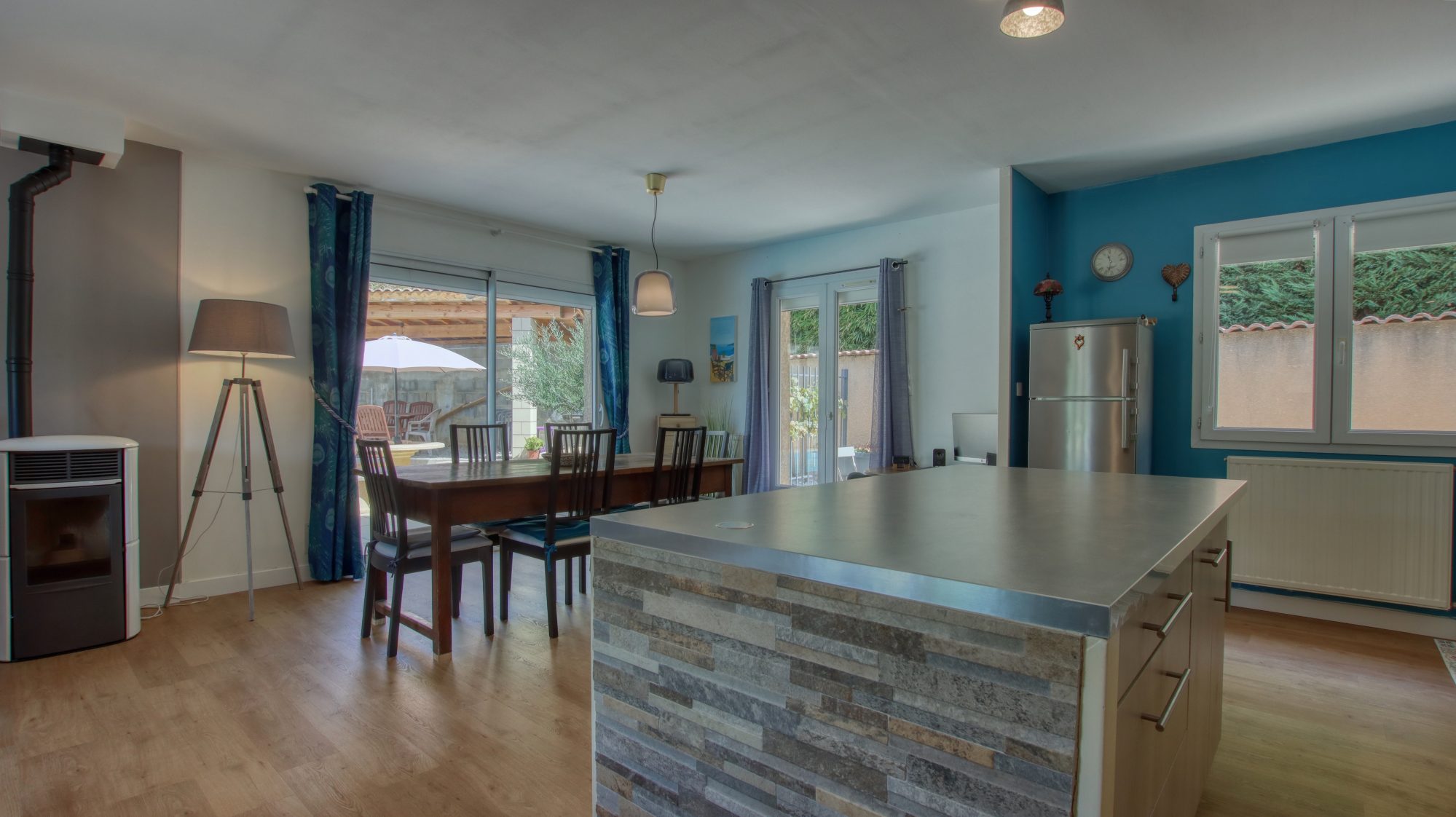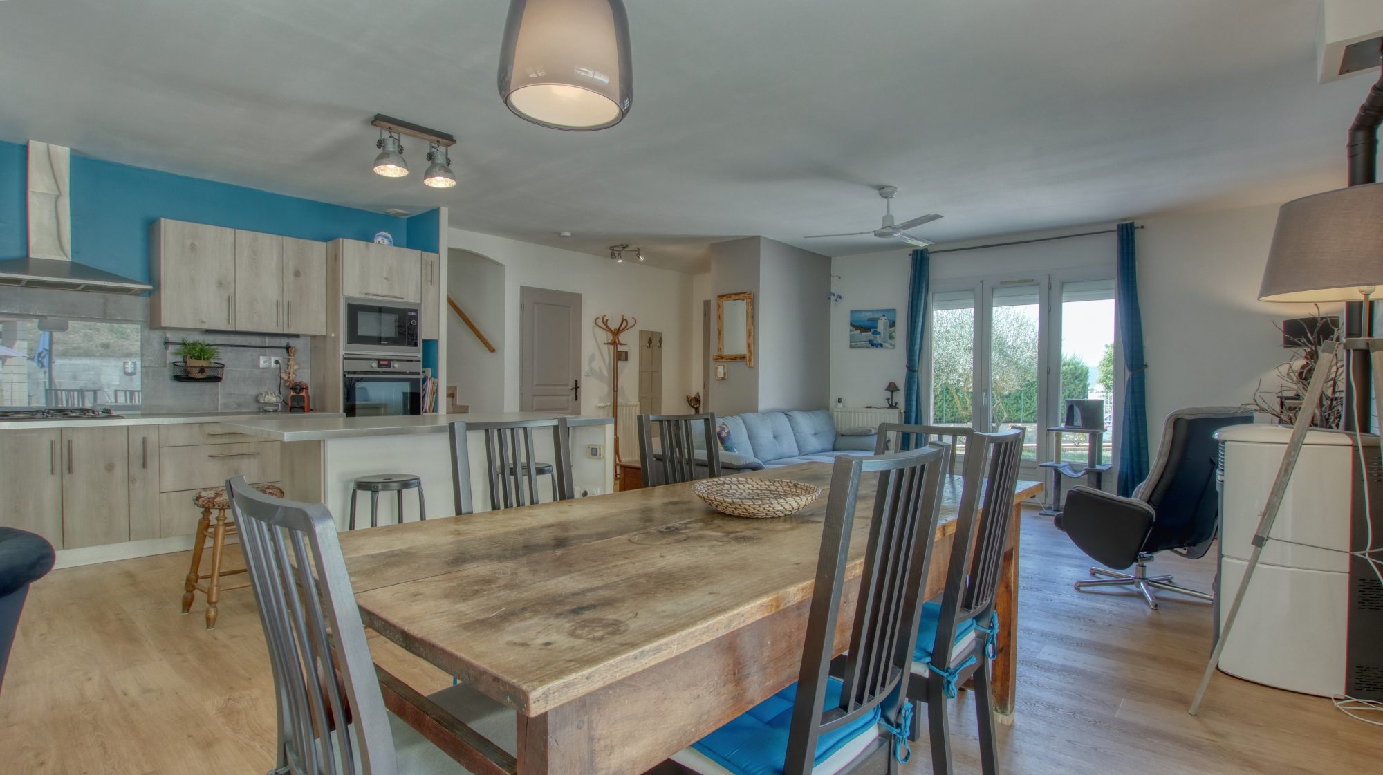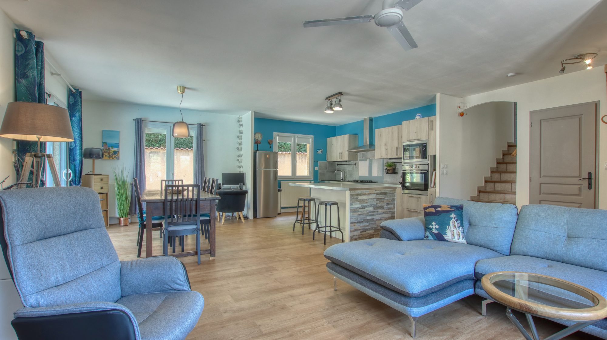 La maison est répartie sur un demi niveau, comprenant une grande pièce de vie lumineuse et agréable, ainsi qu'une cuisine ouverte et équipée.