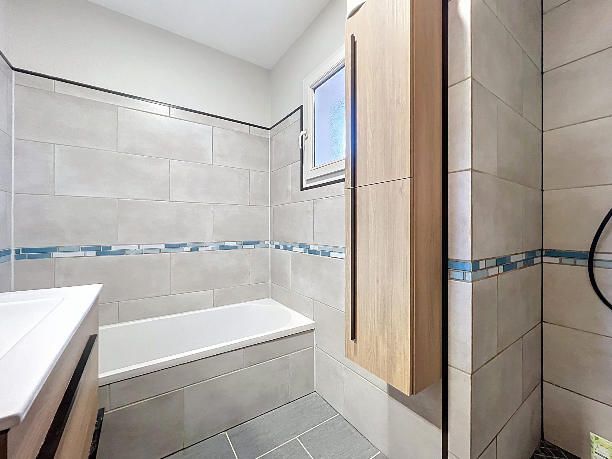 Elle se compose d'une entrée avec placard, d'une cuisine équipée avec cellier/buanderie, d'un grand salon séjour de plus de 30 m2 avec un accès jardin.