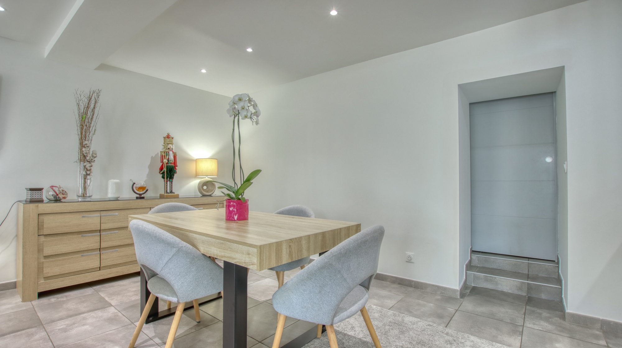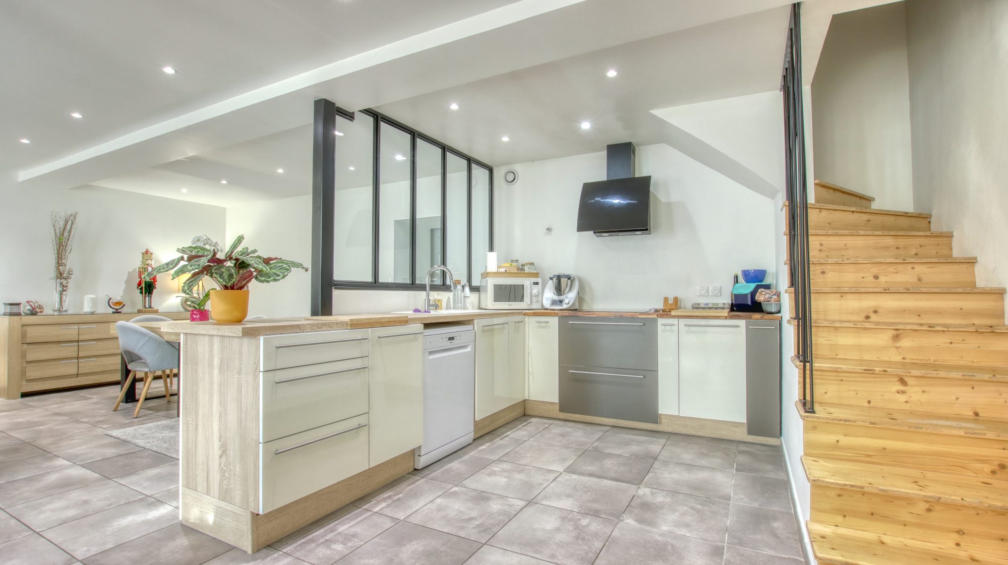 Au Rez-de chaussée La cuisine aménagée et équipée est ouverte sur le salon séjour et une buanderie avec WC.