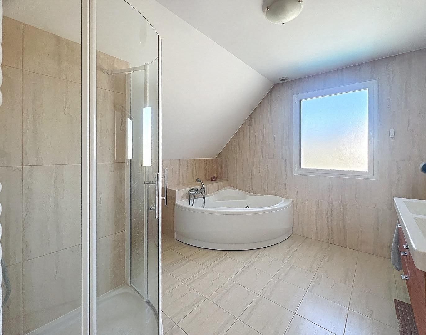 Côté extérieur, cette maison possède une terrasse de 60m2, un jardin de 238m2 et une belle piscine de 4m par 8m. Cette dernière dispose d'une pompe à chaleur.