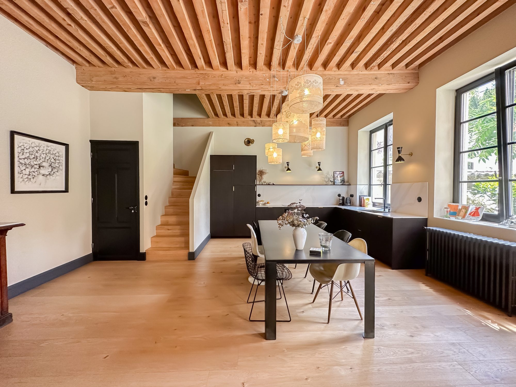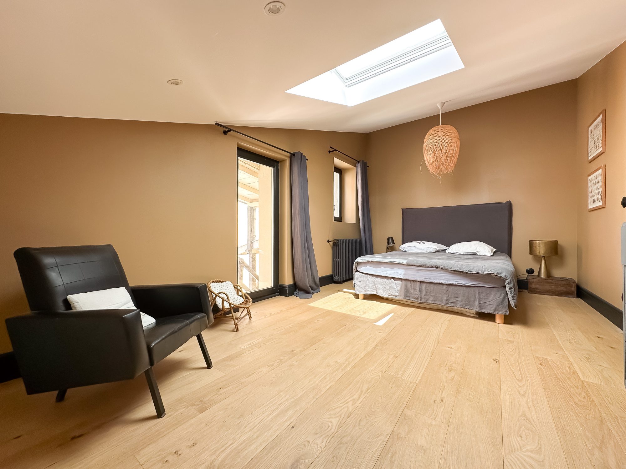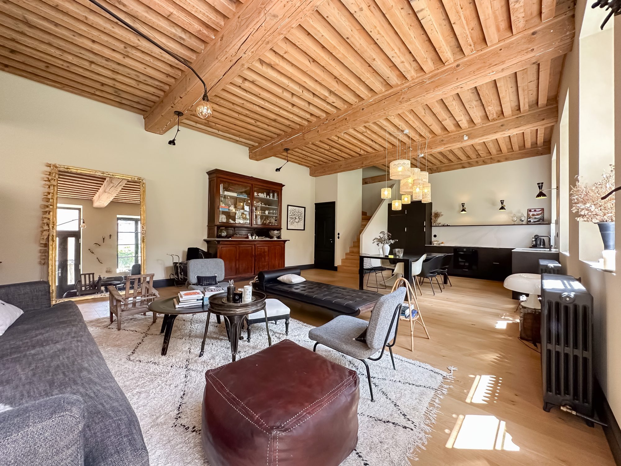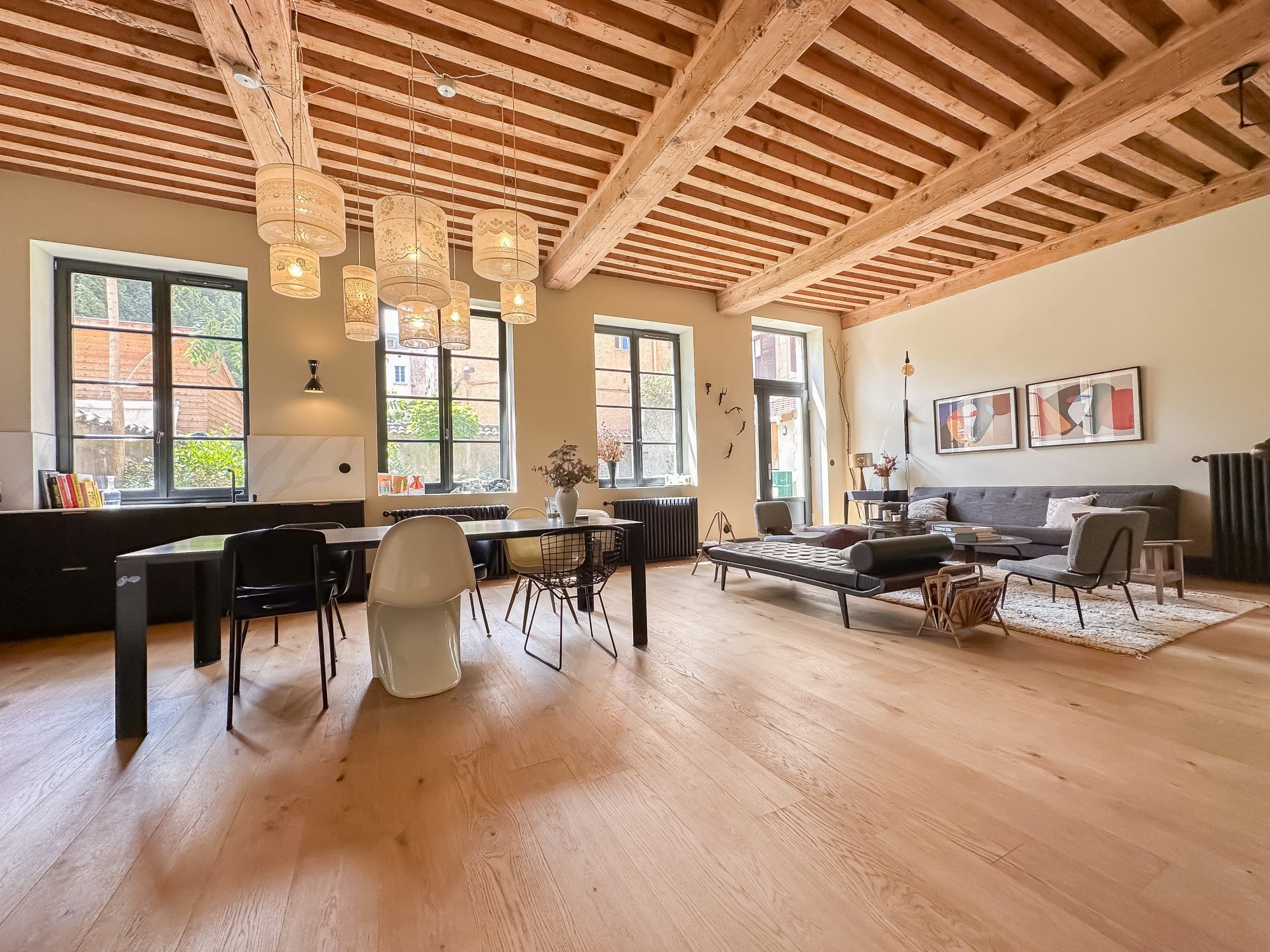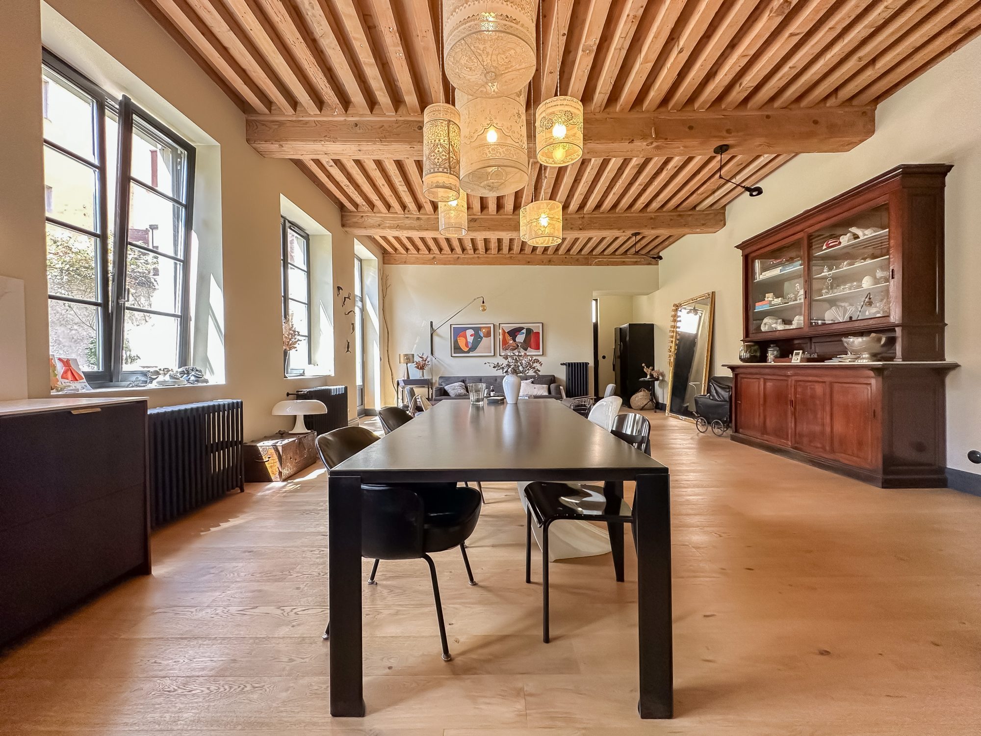 Une vaste pièce à vivre de 60 m² avec hauteur sous plafond de 3,50 m. Elle est baignée de lumière grâce à ses quatre grandes fenêtres. Elle dispose d'un espace salon, d'une zone repas et d'une cuisine meublée et équipée tout confort. WC indépendant. Un dégagement au fond de la pièce permet d'accéder à une très jolie cave.