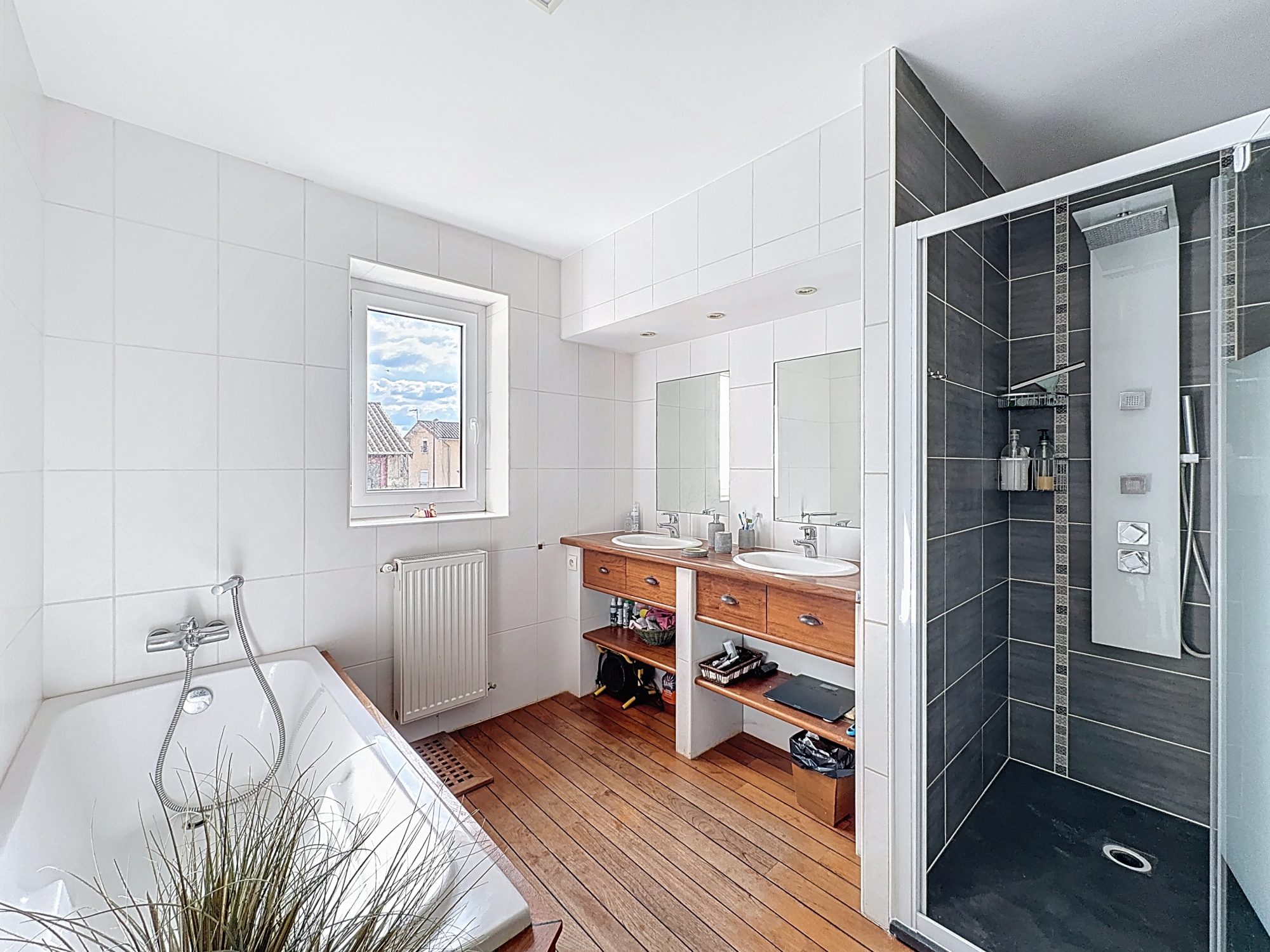 L'escalier mène à l'étage où se situent 2 chambres et une salle de bain confortable avec douche et baignoire, et un toilette indépendant.