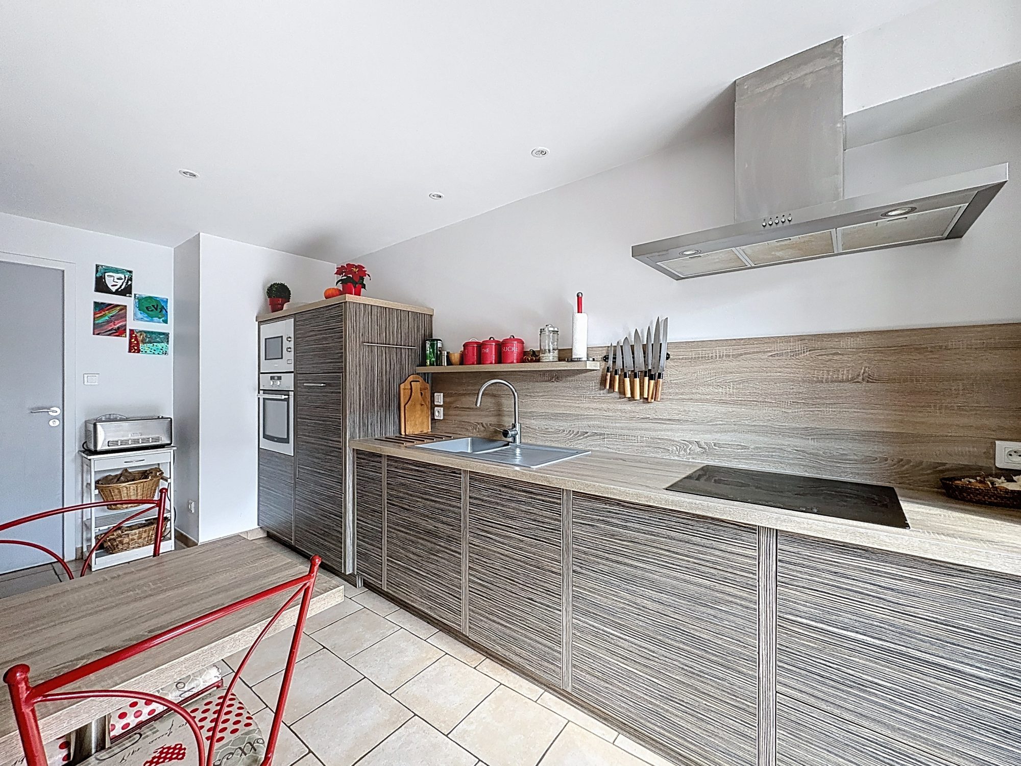 Le Rdc se compose : d'une pièce de vie traversante de 30 m² ouvrant sur les deux terrasses de chaque côté de la maison, d'une cuisine, d'une buanderie et de toilettes.