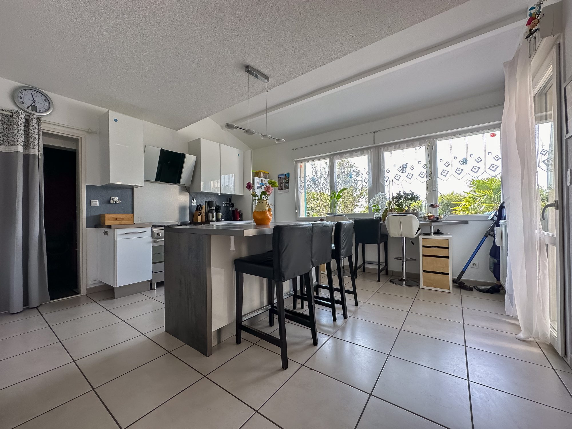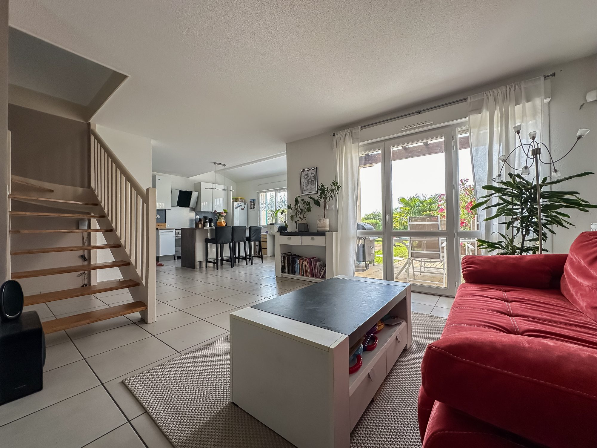 Hall d'entrée, pièce de vie de 44 m² avec cuisine ouverte meublée et équipée, une chambre, cellier/buanderie, garage pour vélos/moto.