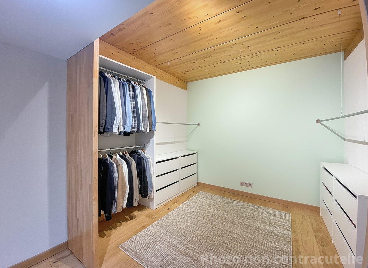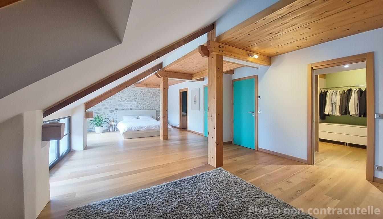 Une grande chambre composé de sa salle de bain privative ainsi que de son dressing.