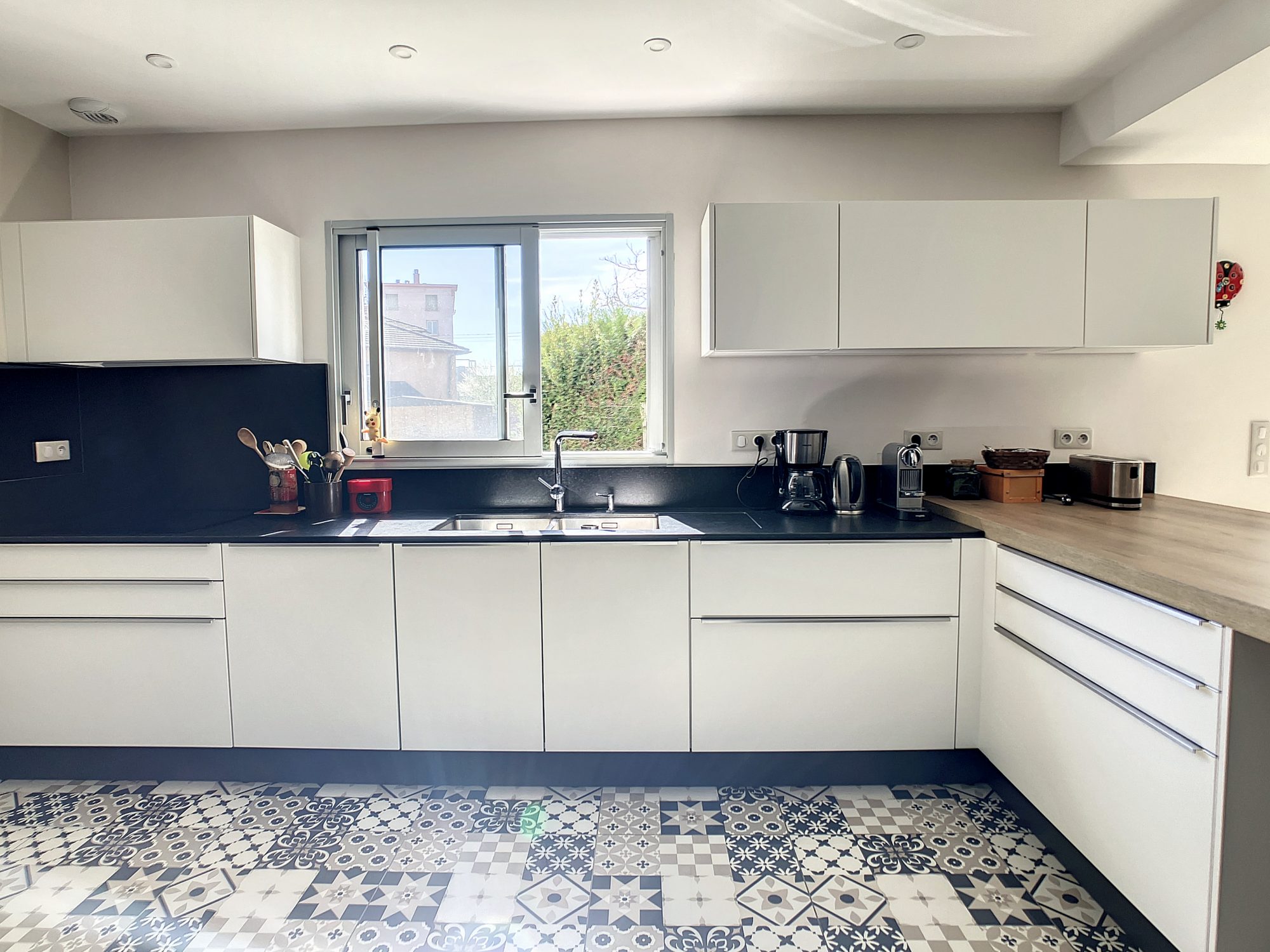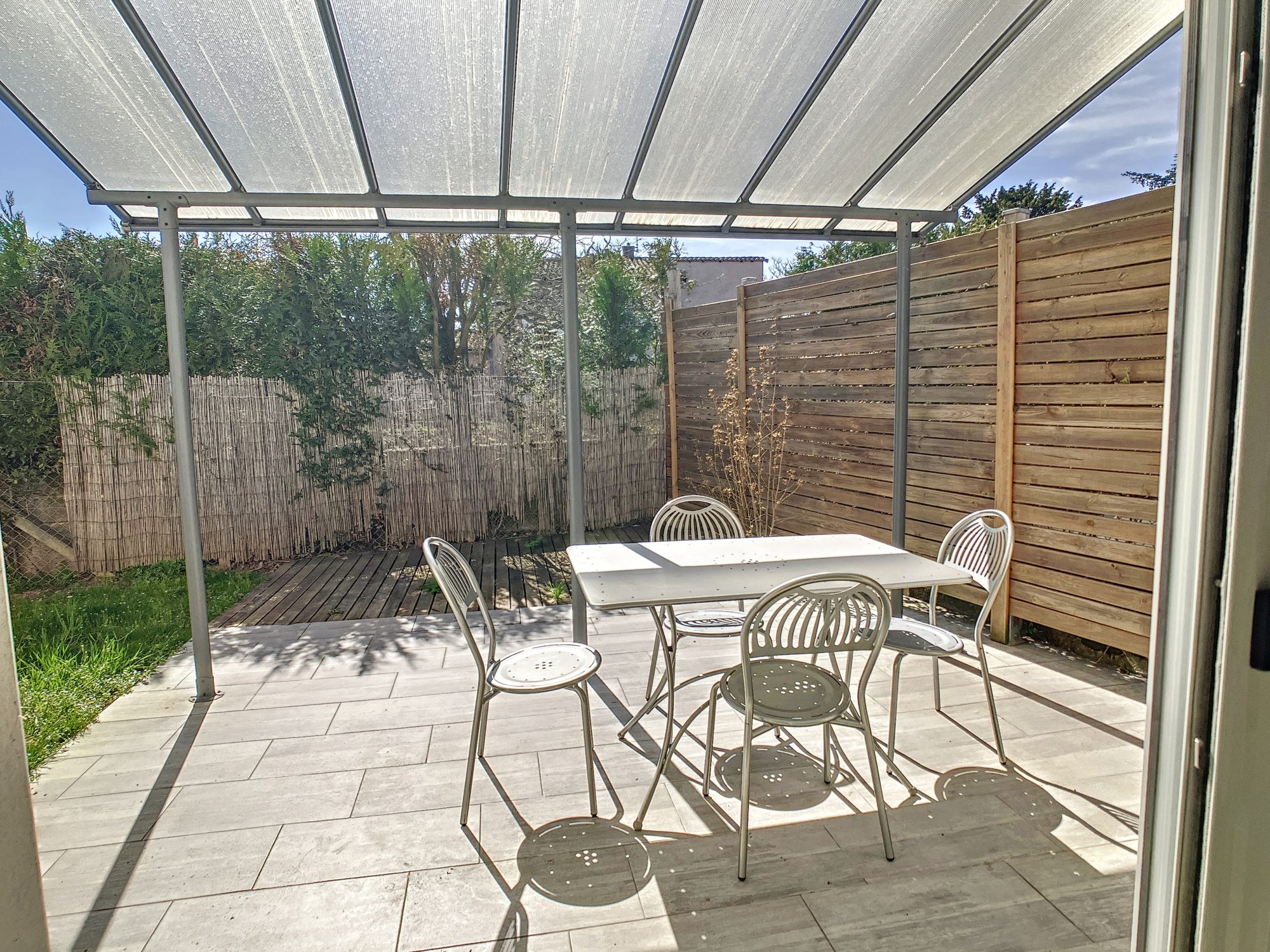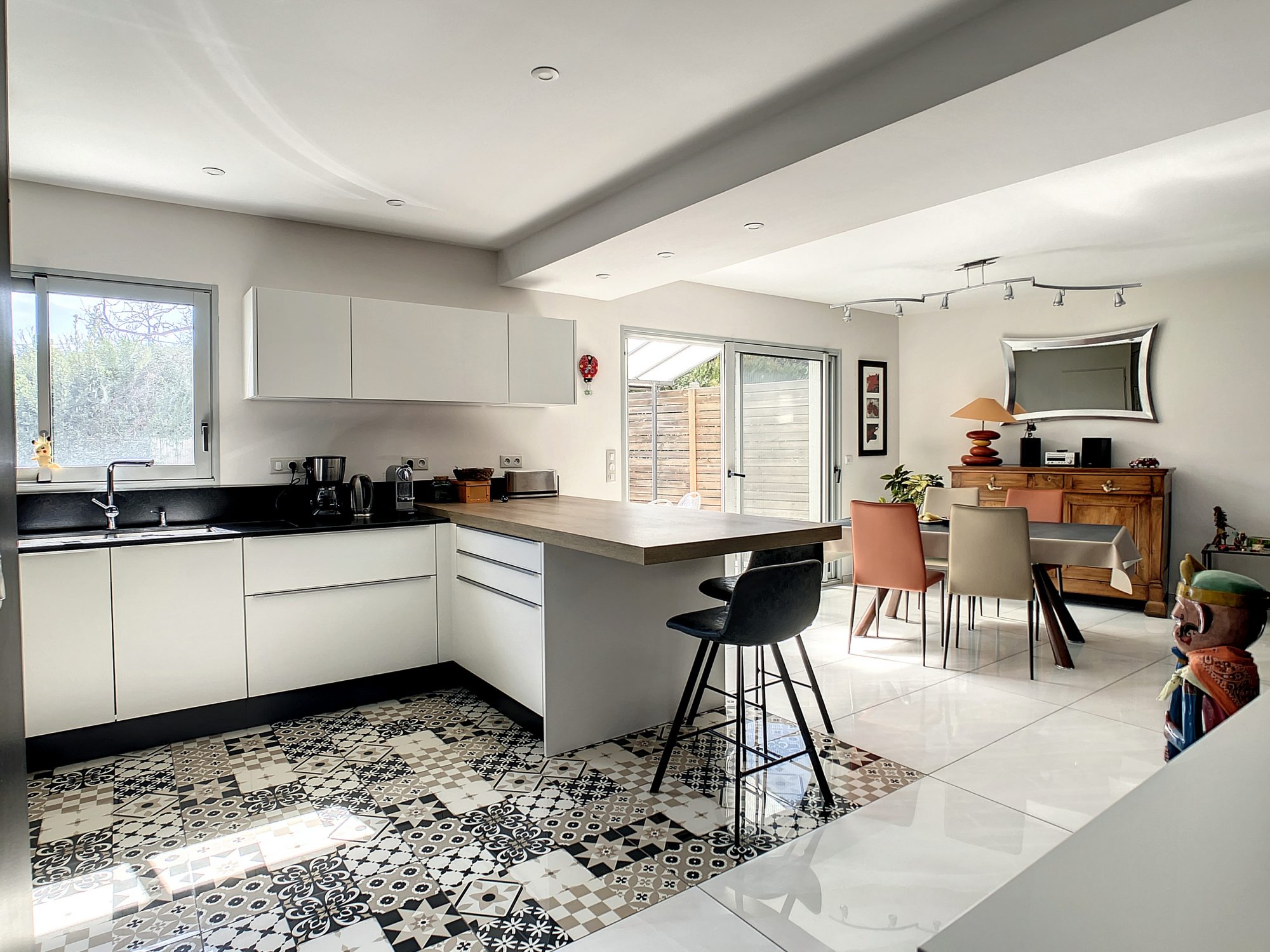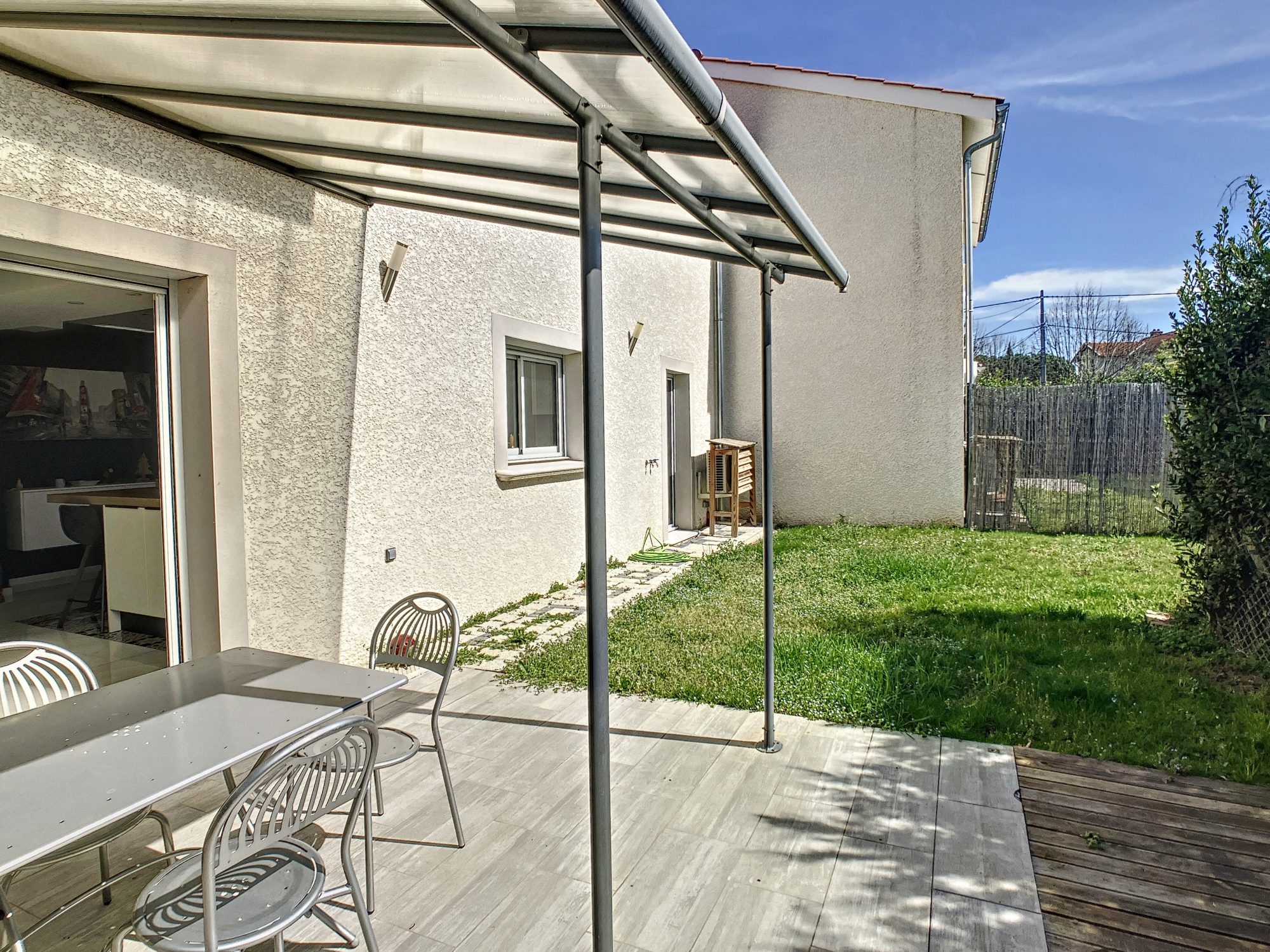 La cuisine aménagée et équipée ouverte dispose d'une sortie immédiate vers la terrasse, en partie couverte d'une avancée, type pergola et le jardin.