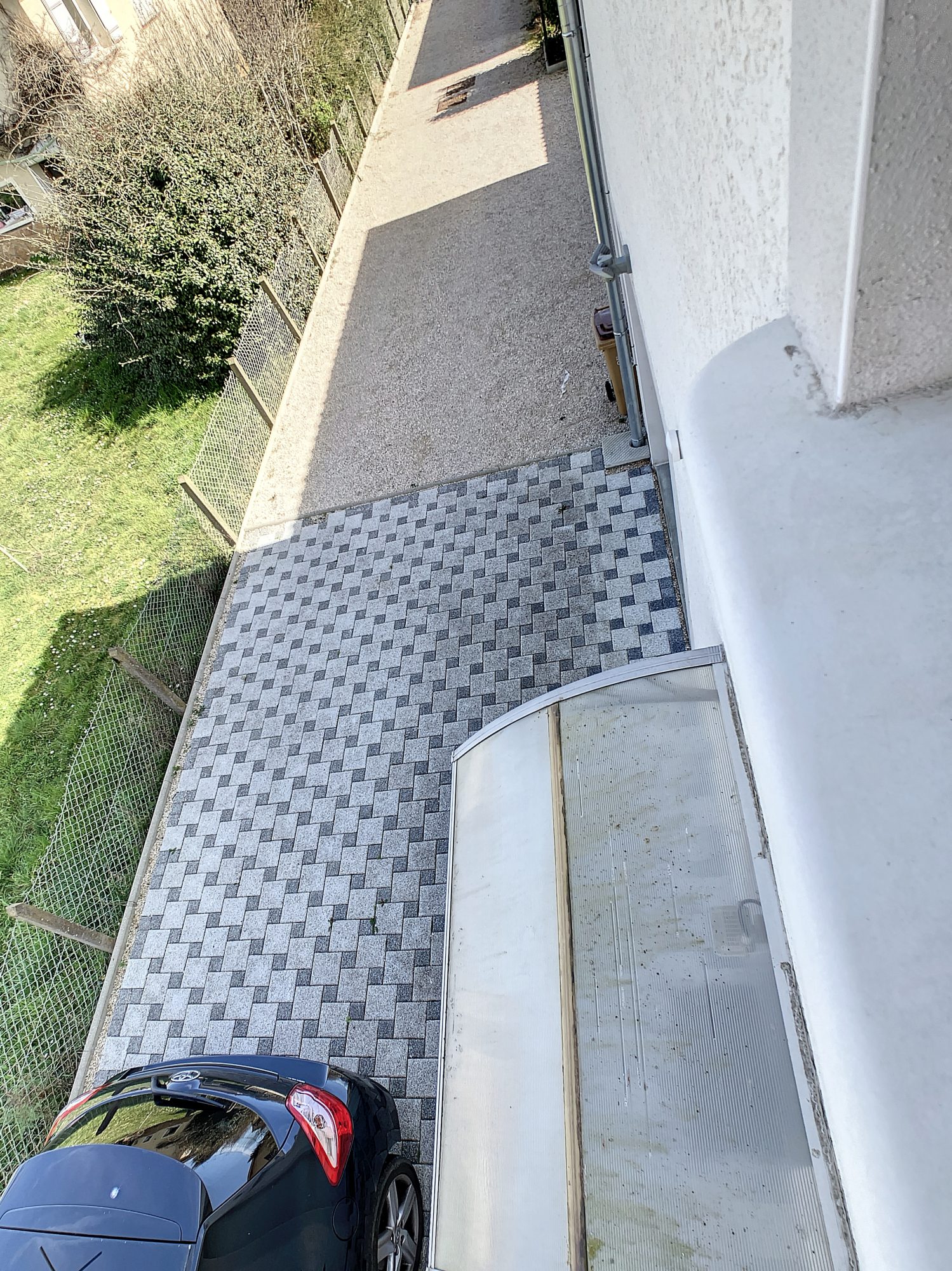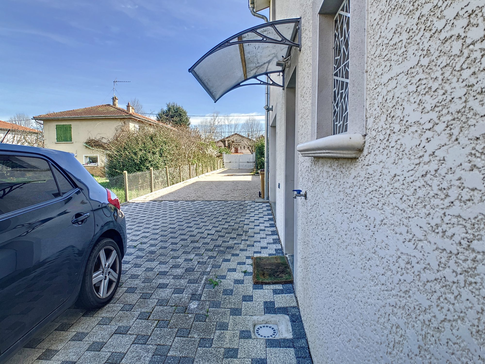 Le chemin d'accès voitures ou piétons est gravillonné et fermé par un portail motorisé