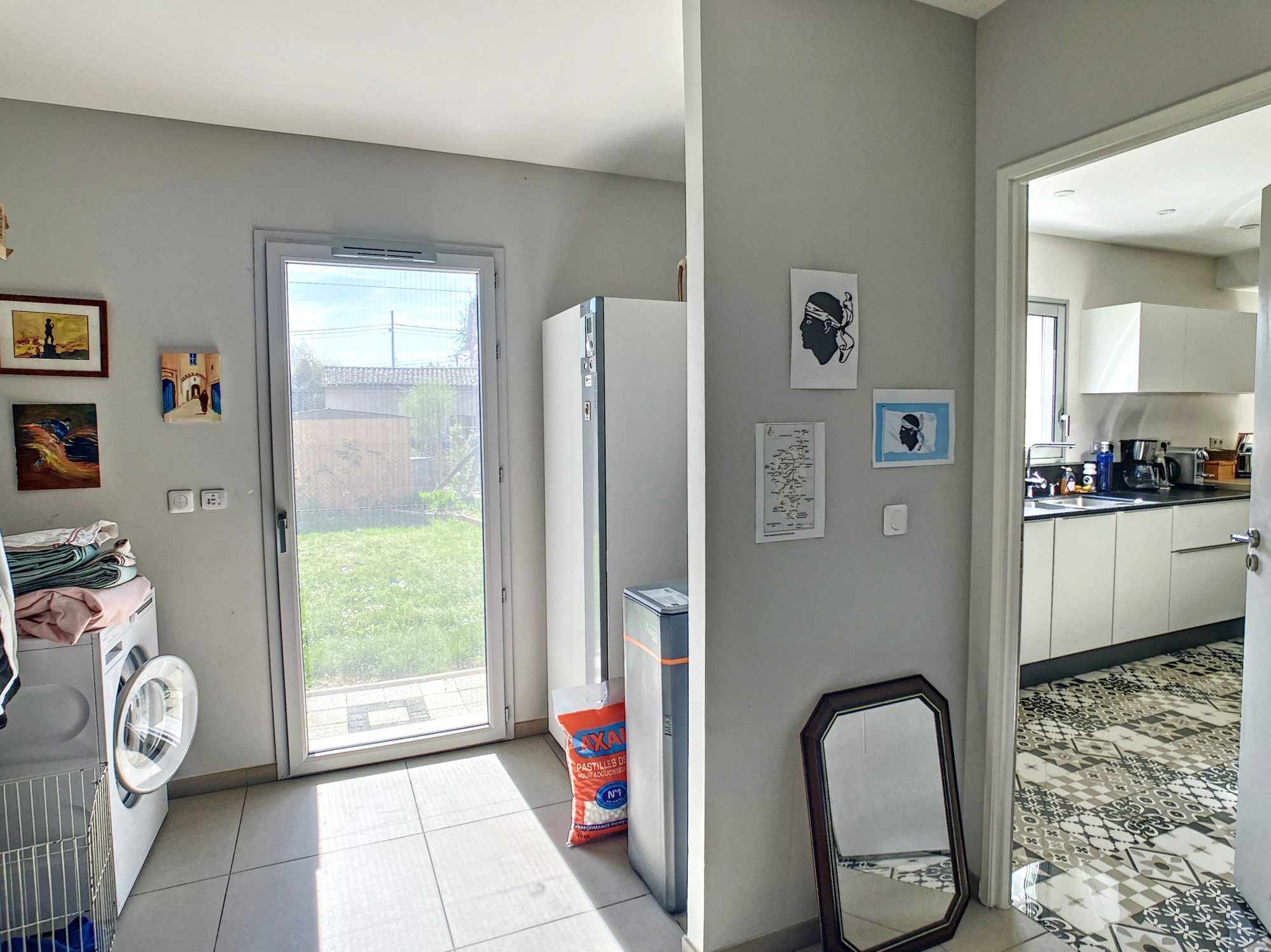Le garage associé à la buanderie avec porte fenêtre sur jardin et salle d'eau avec toilette complètent ce niveau
