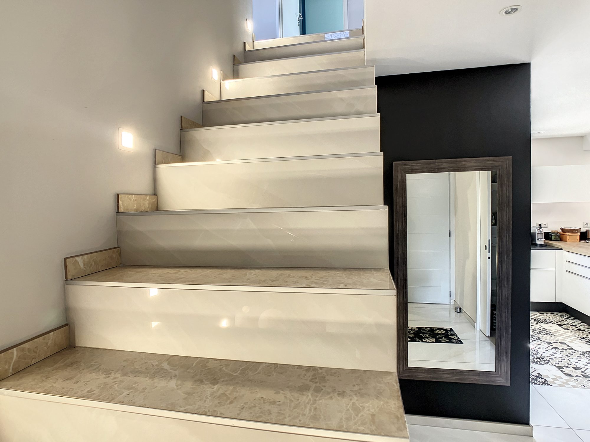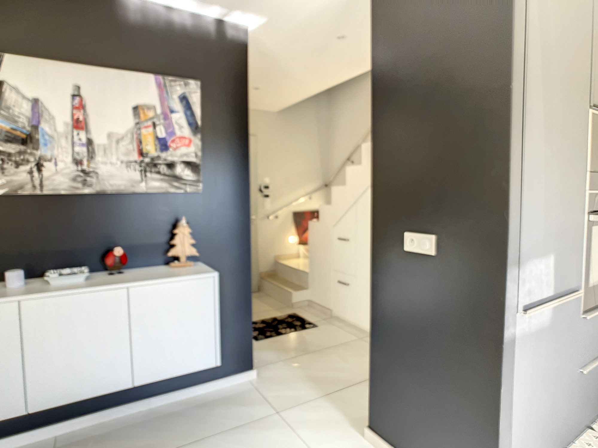 Chaleureuse entrée avec placards de rangement réalisés sur mesure, qui permet l'accès immédiat à la pièce de vie.