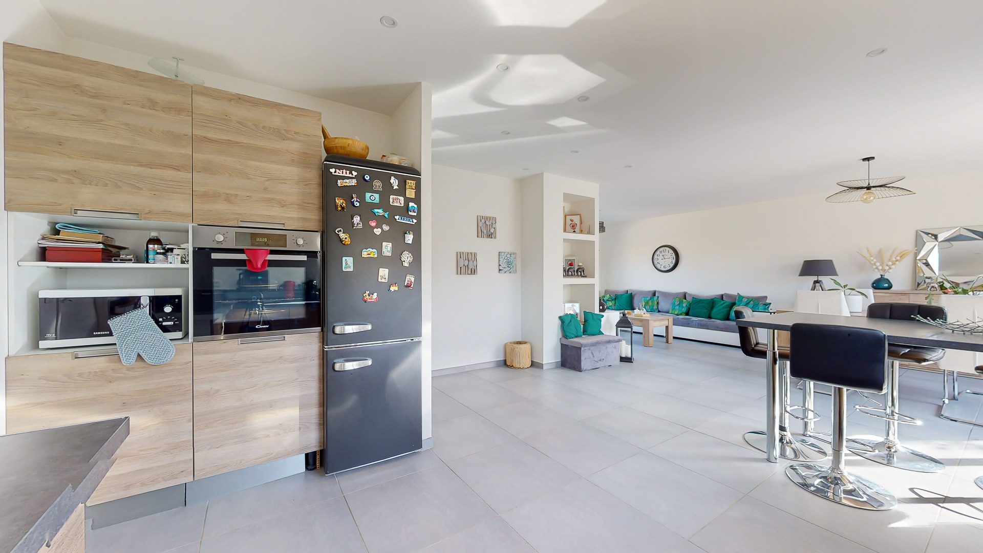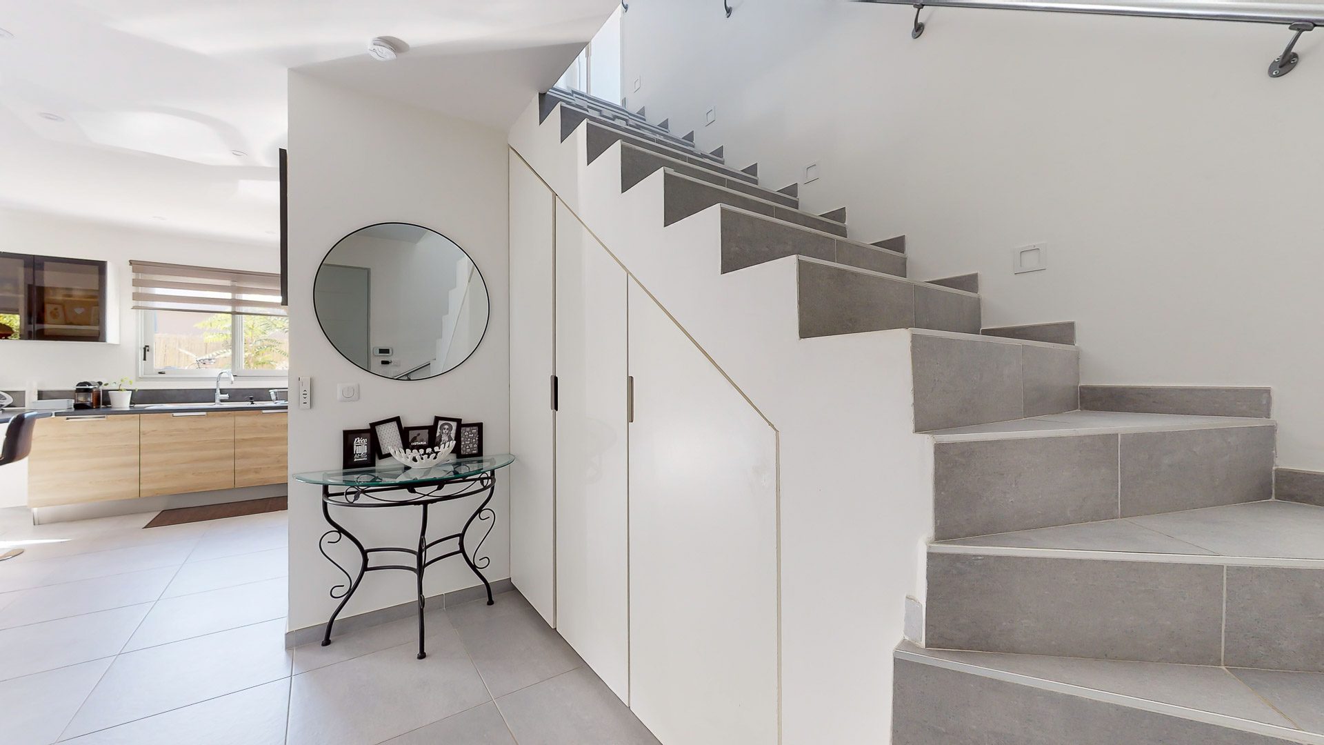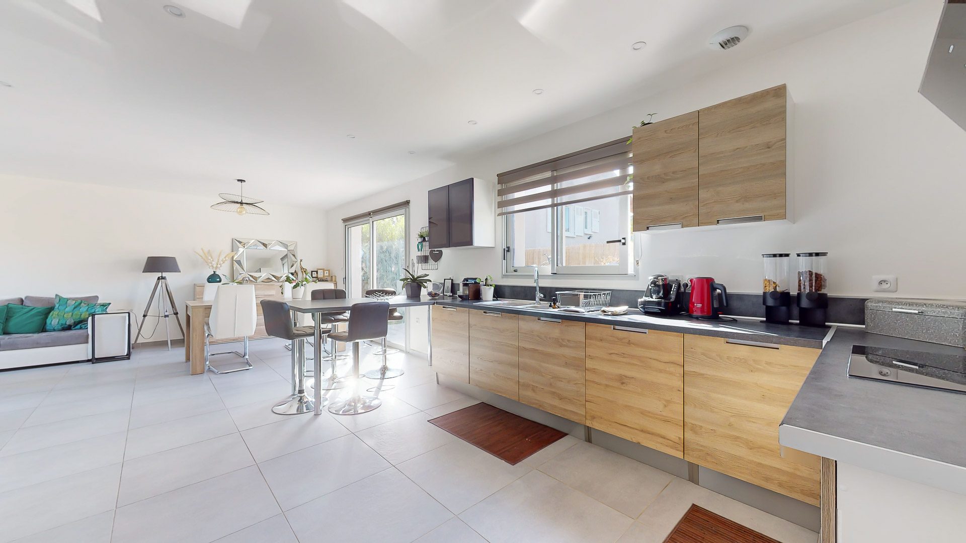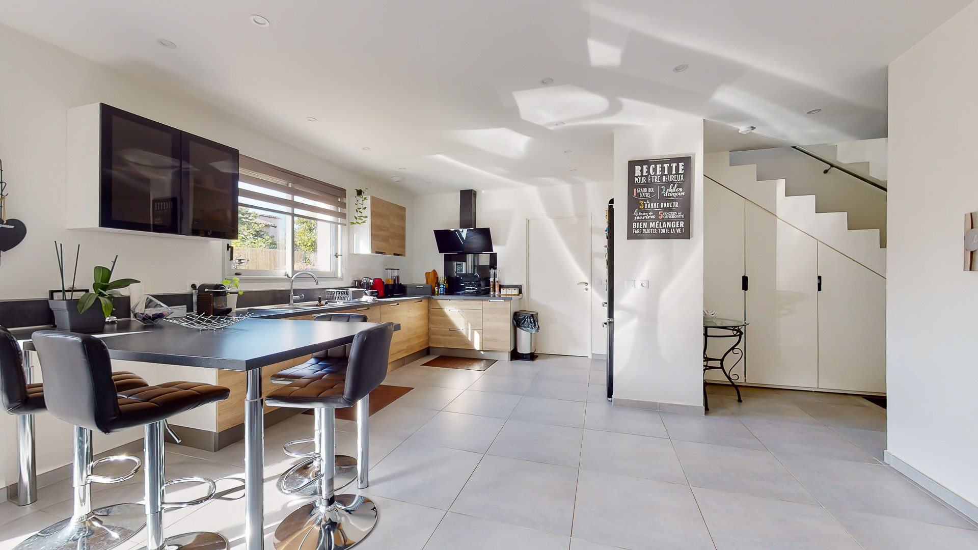 Belle entrée avec placards de rangement permettant d'accéder à la pièce de vie incluant une agréable cuisine aménagée et équipée proposant une sortie immédiate vers la terrasse et le jardin, mais aussi vers la terrasse coté entrée.