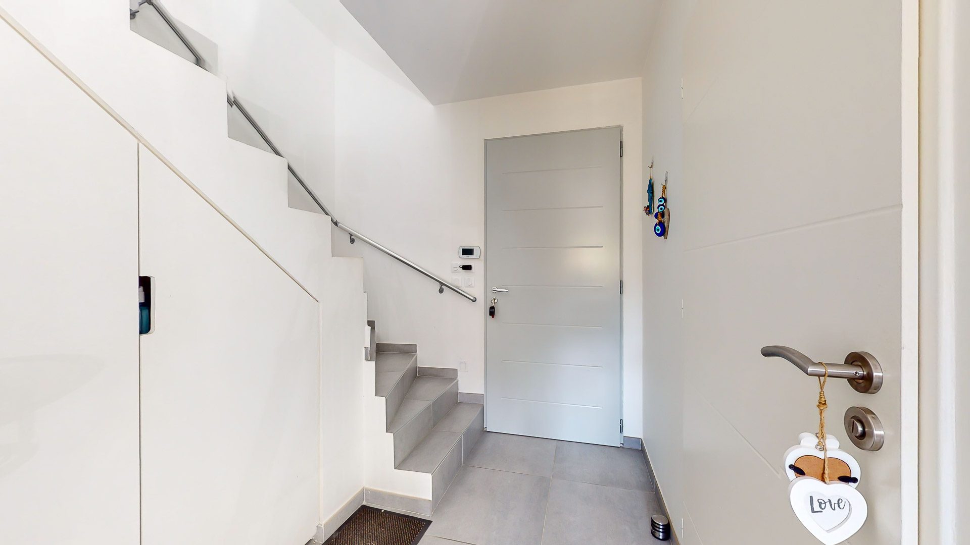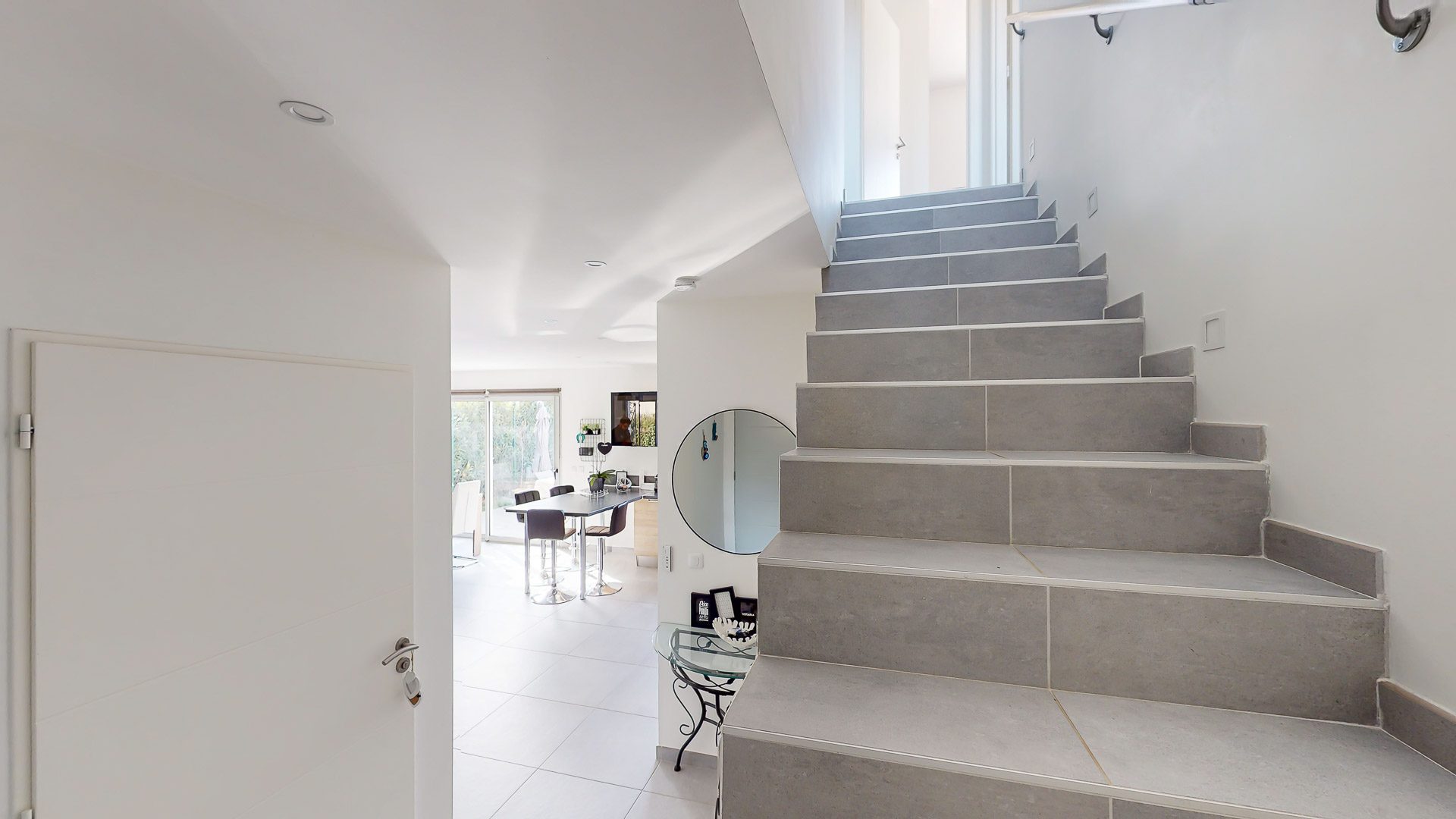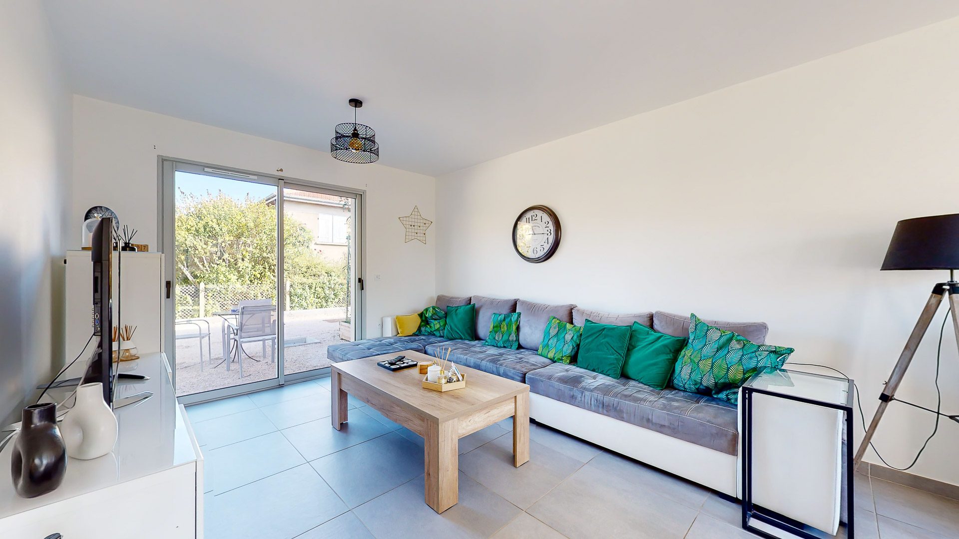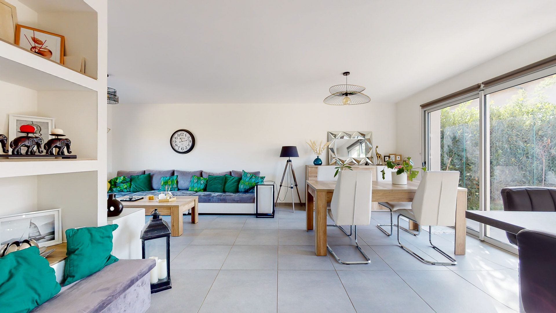 Belle entrée avec placards de rangement permettant d'accéder à la pièce de vie incluant une agréable cuisine aménagée et équipée proposant une sortie immédiate vers la terrasse et le jardin, mais aussi vers la terrasse coté entrée.