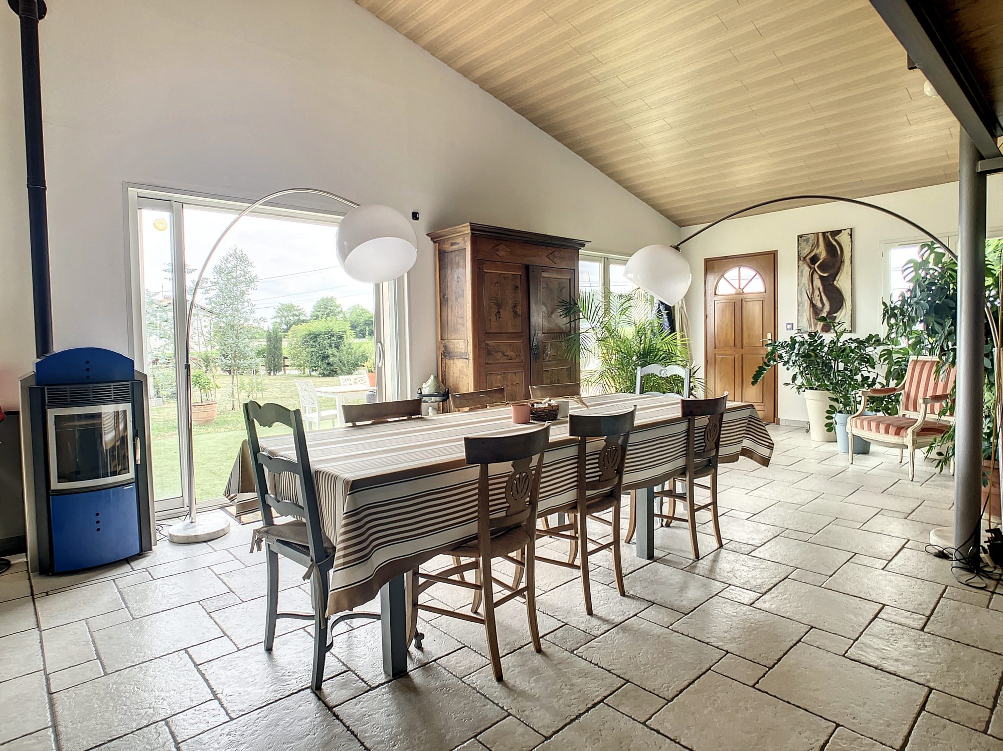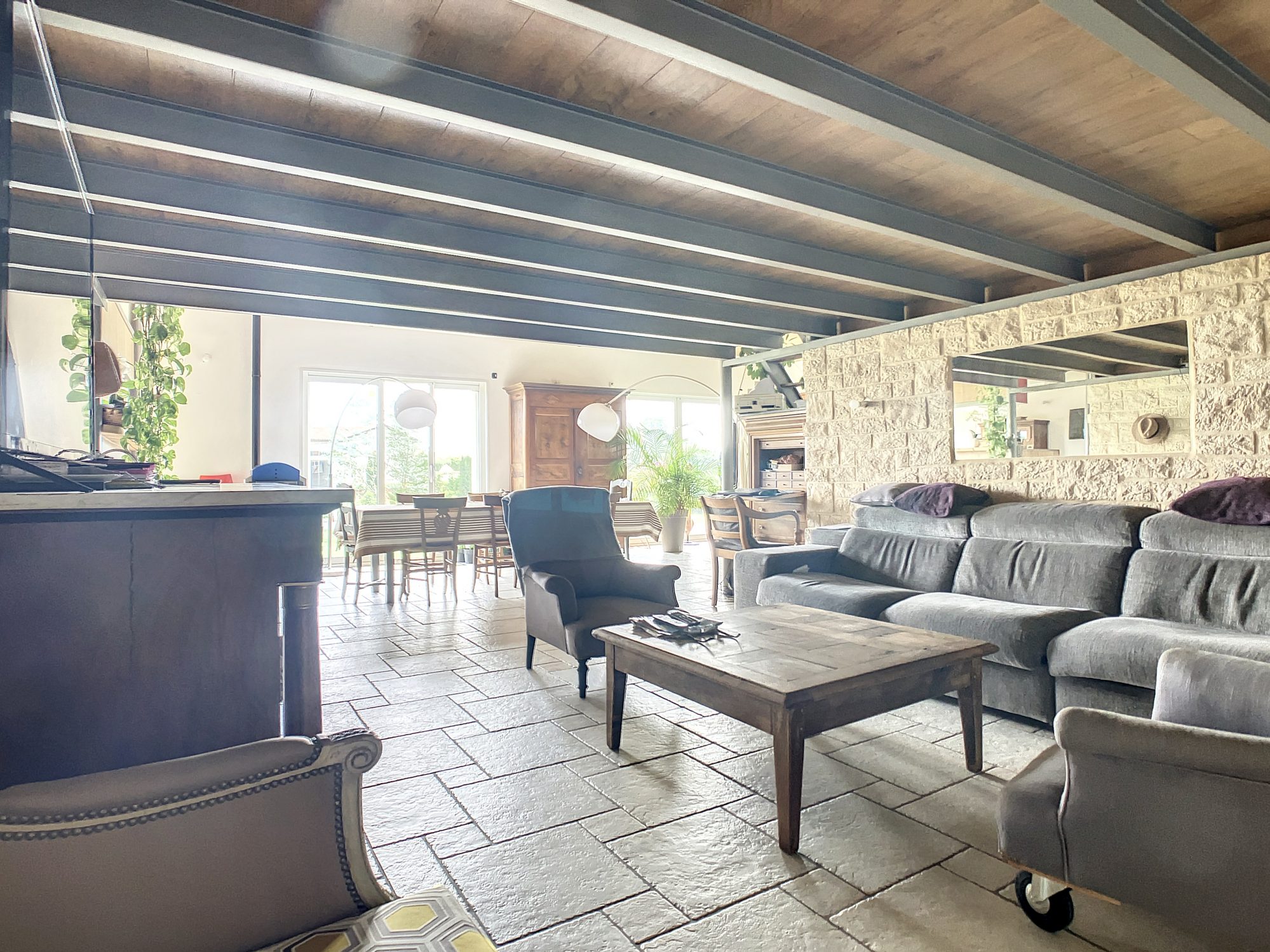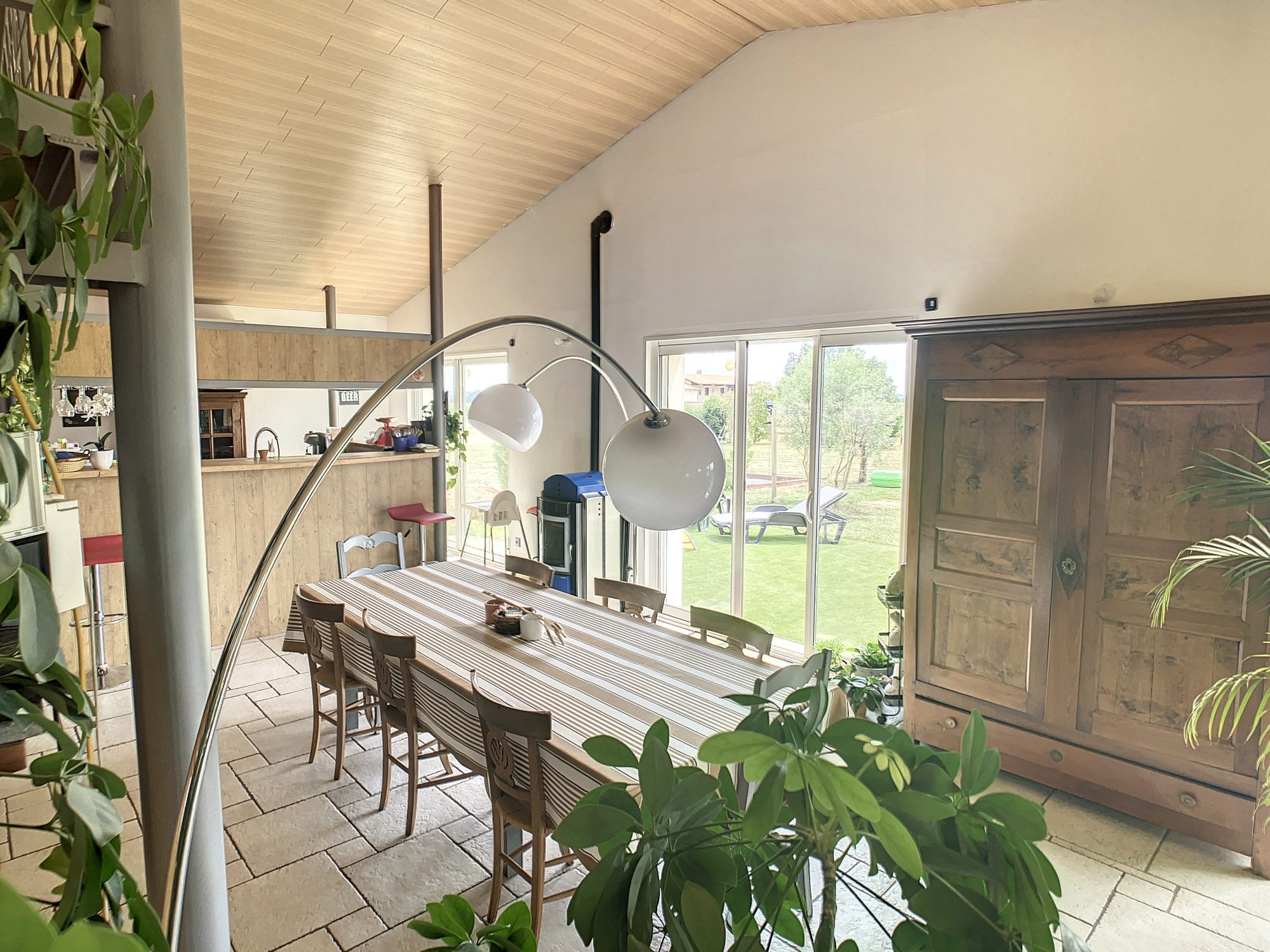 Grande pièce de vie qui profite d'une vue et accès au jardin grâce aux grandes baies à galandages.