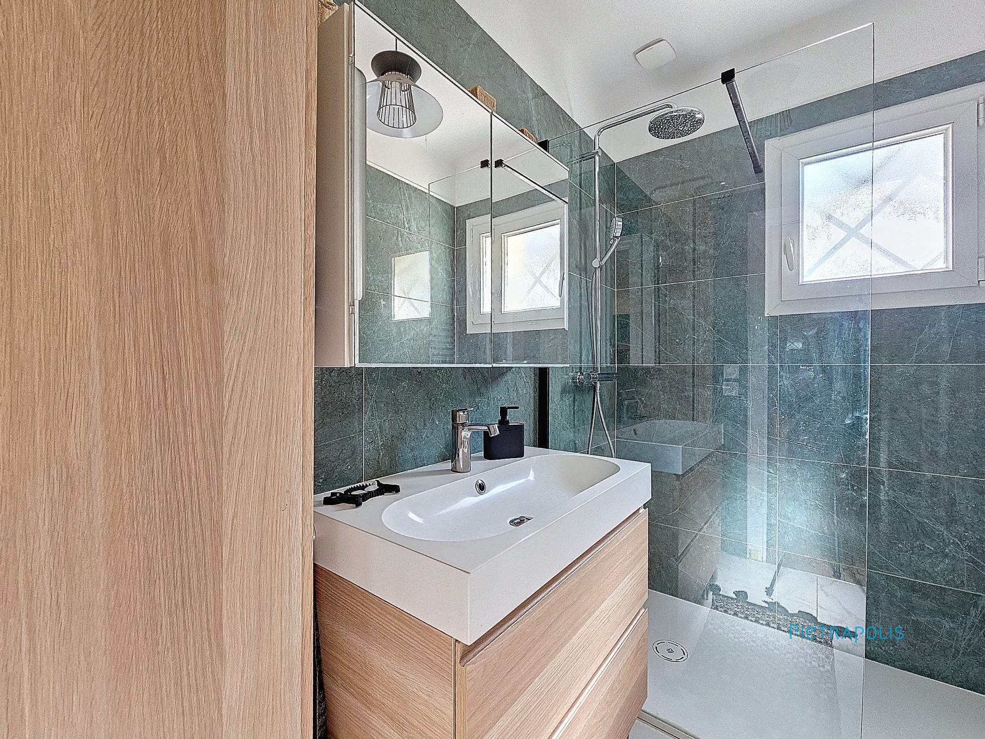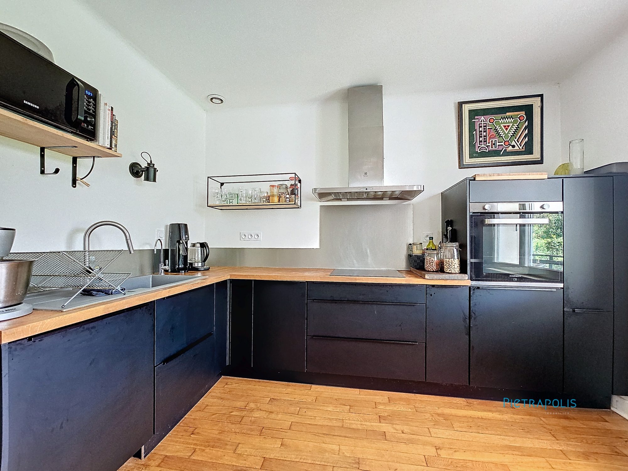 La maison se compose pour le niveau principal (105m2) d'une agréable pièce de vie avec cuisine ouverte entièrement équipée. Vous apprécierez les belles ouvertures avec vue sur le jardin et accès direct à la terrasse abritée par une pergola.