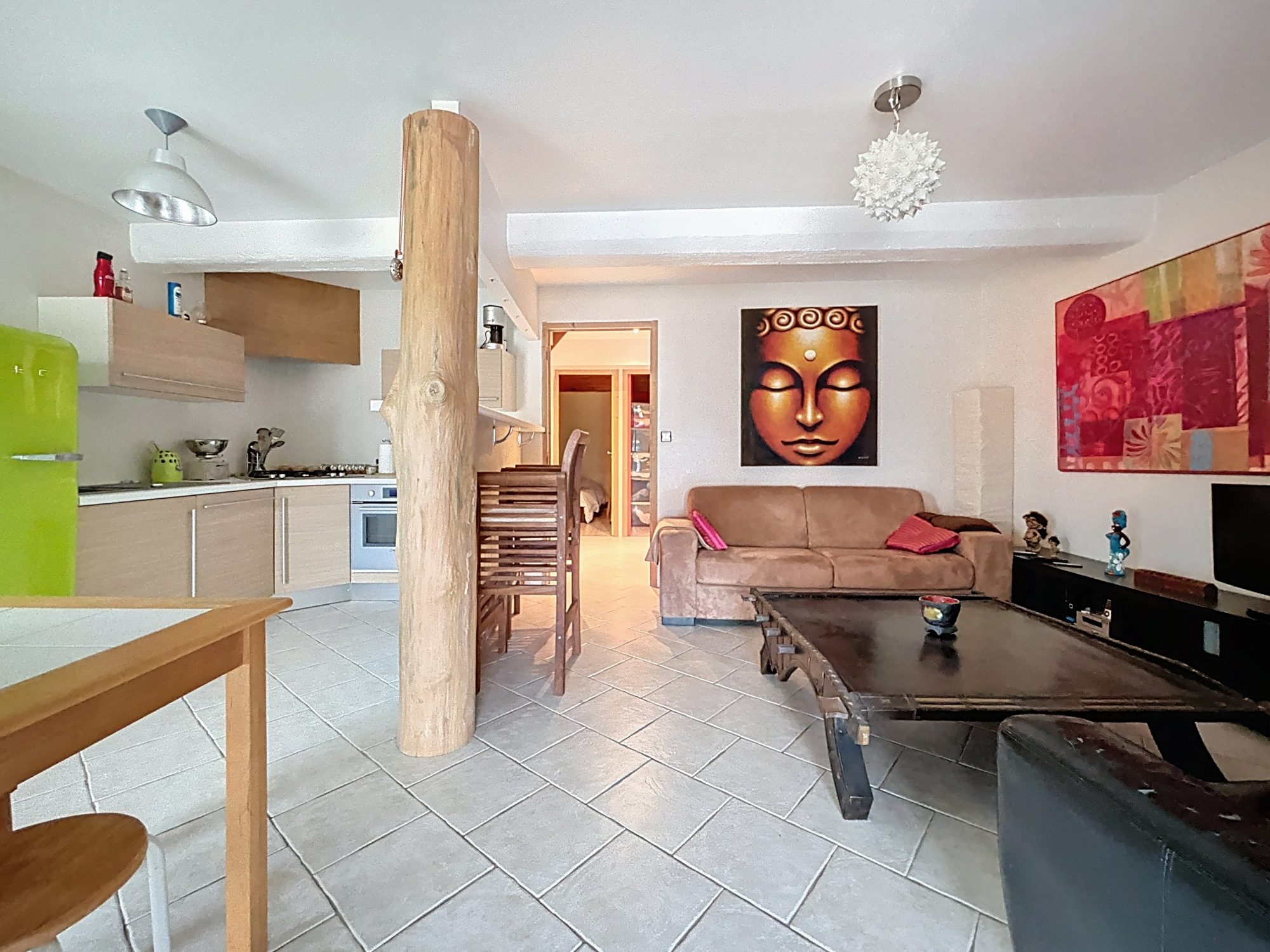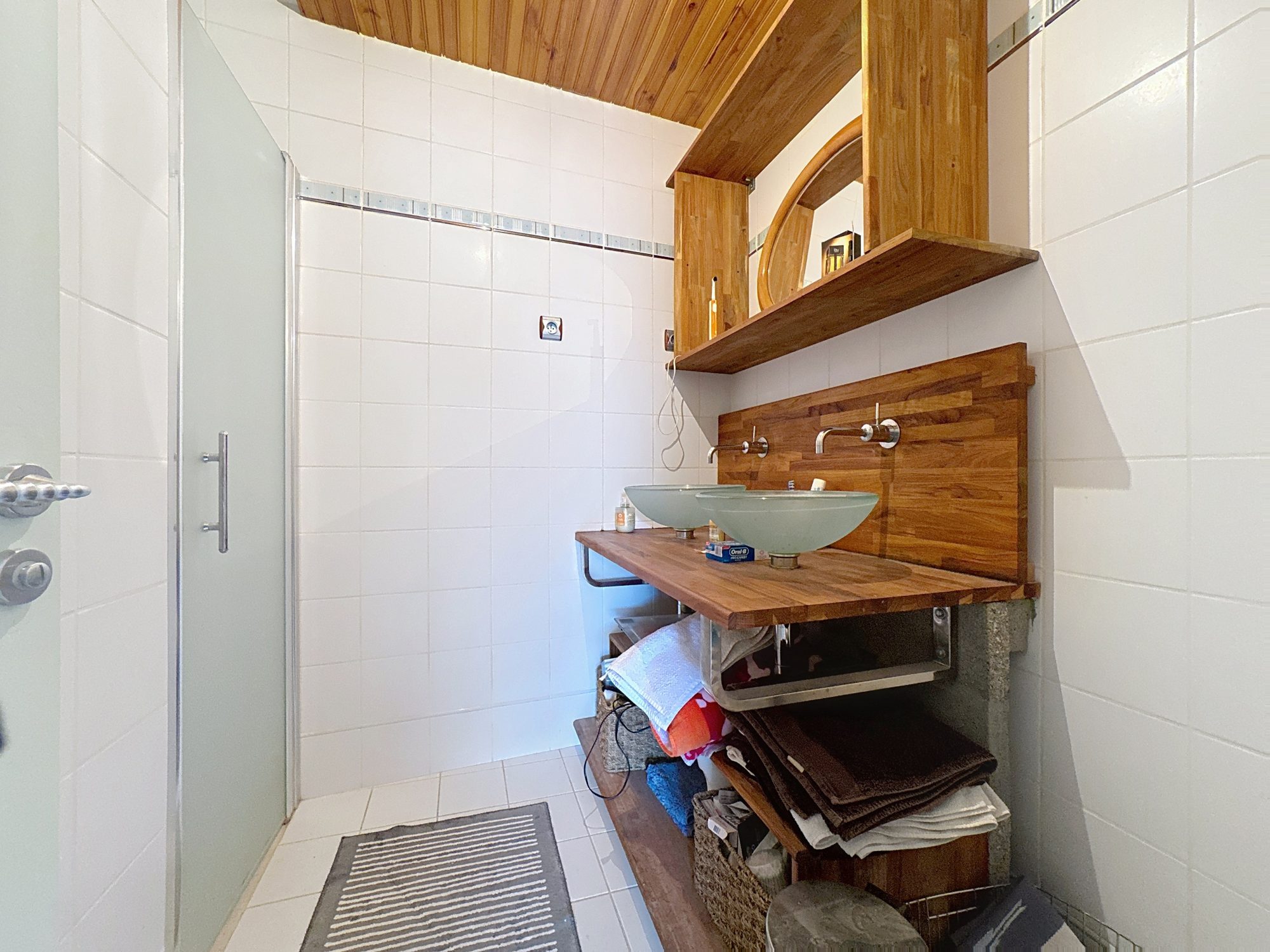 A l'étage, une terrasse exposée Ouest de 32,1 m², l'accès à la maison avec en arrivant un hall d'entrée desservant 2 chambres, des WC séparés, une salle de douche et un bel espace de vie avec cuisine ouverte de 25 m² donnant sur une loggia de 8,09 m².
