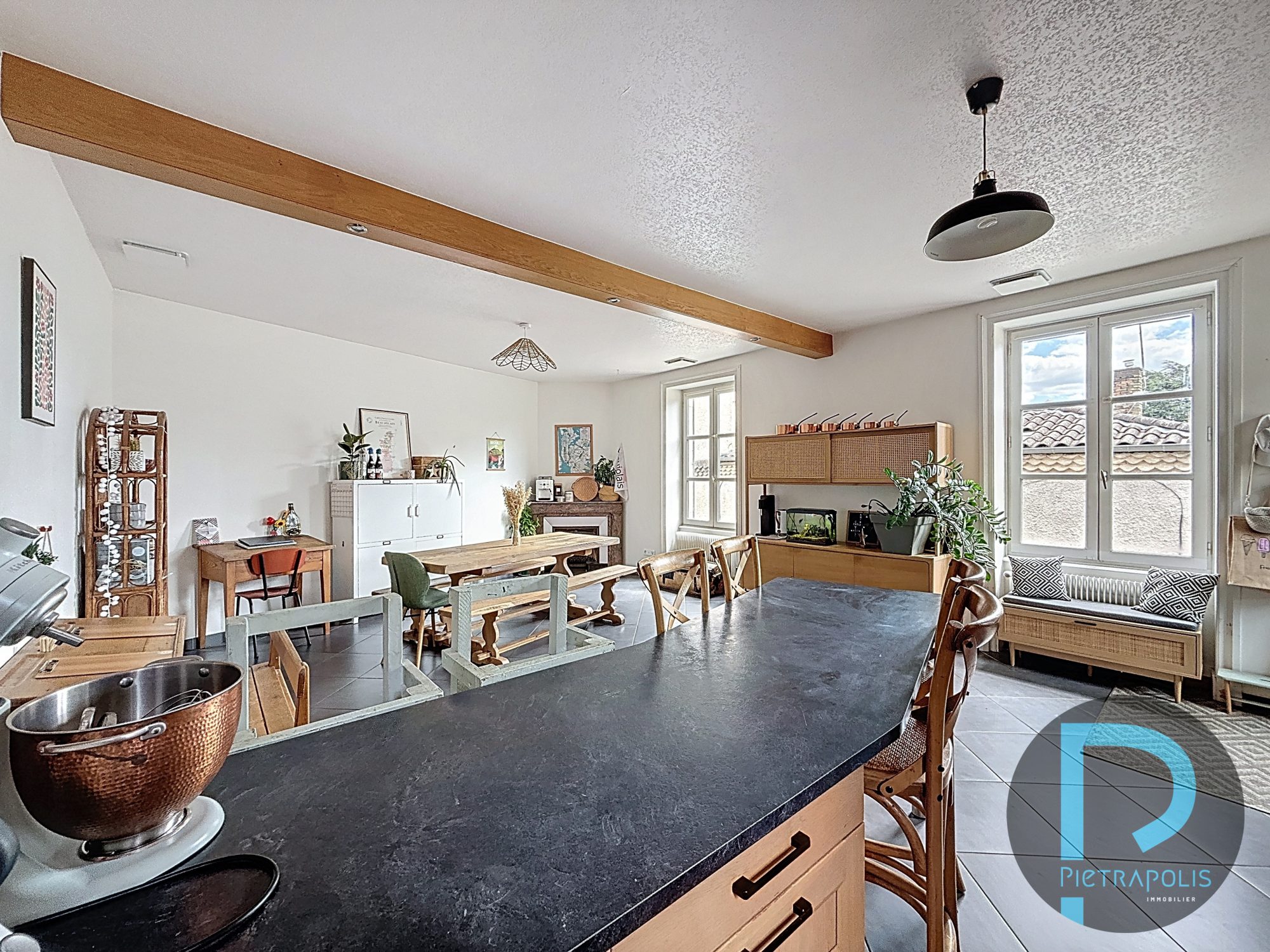 La cuisine américaine, aménagée et équipée, est le cœur de cette maison. Elle est idéale pour les amateurs de cuisine et les moments conviviaux en famille ou entre amis. Les ouvertures en bois/PVC et les portes à double vitrage garantissent une isolation thermique et phonique de qualité, tout en préservant l'esthétique d'antan.
