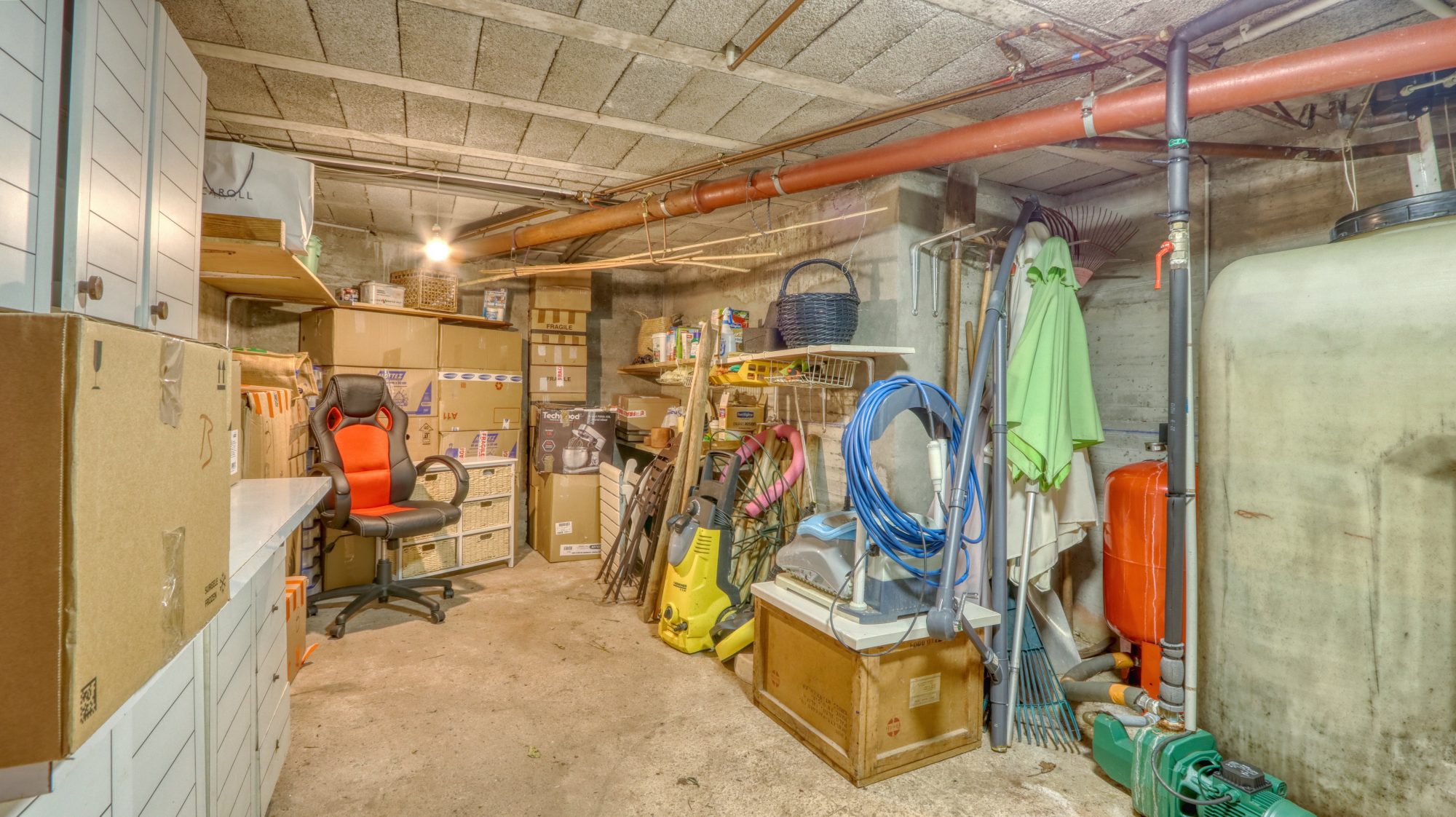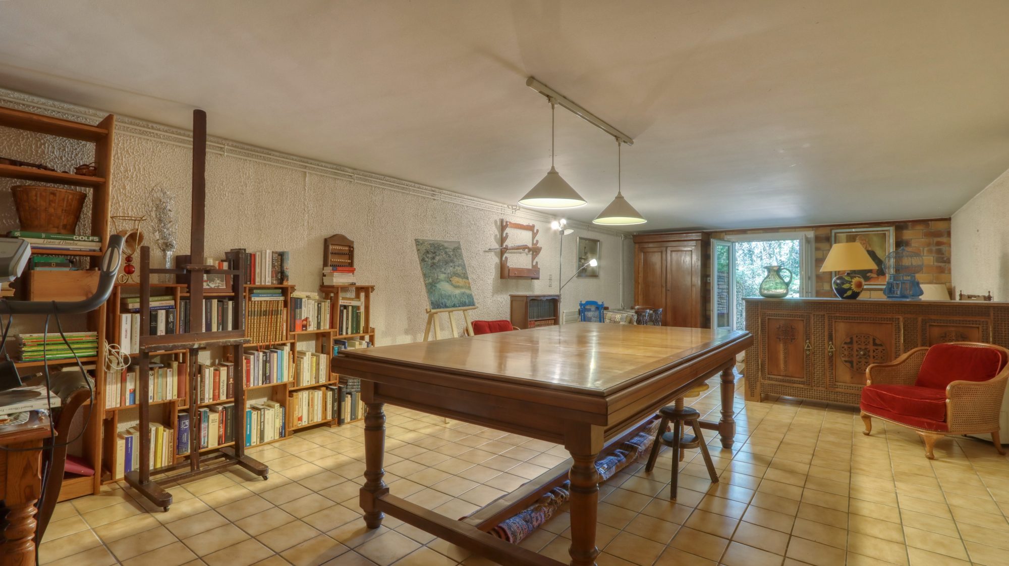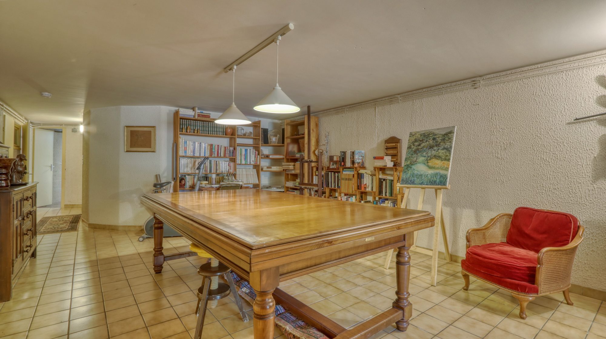 En sous-sol, une salle de jeux de 45 m² peut être convertie en logement annexe via son accès indépendant depuis le jardin. Une buanderie/lingerie, des sanitaires et une salle d'eau sont attenantes à cet espace.