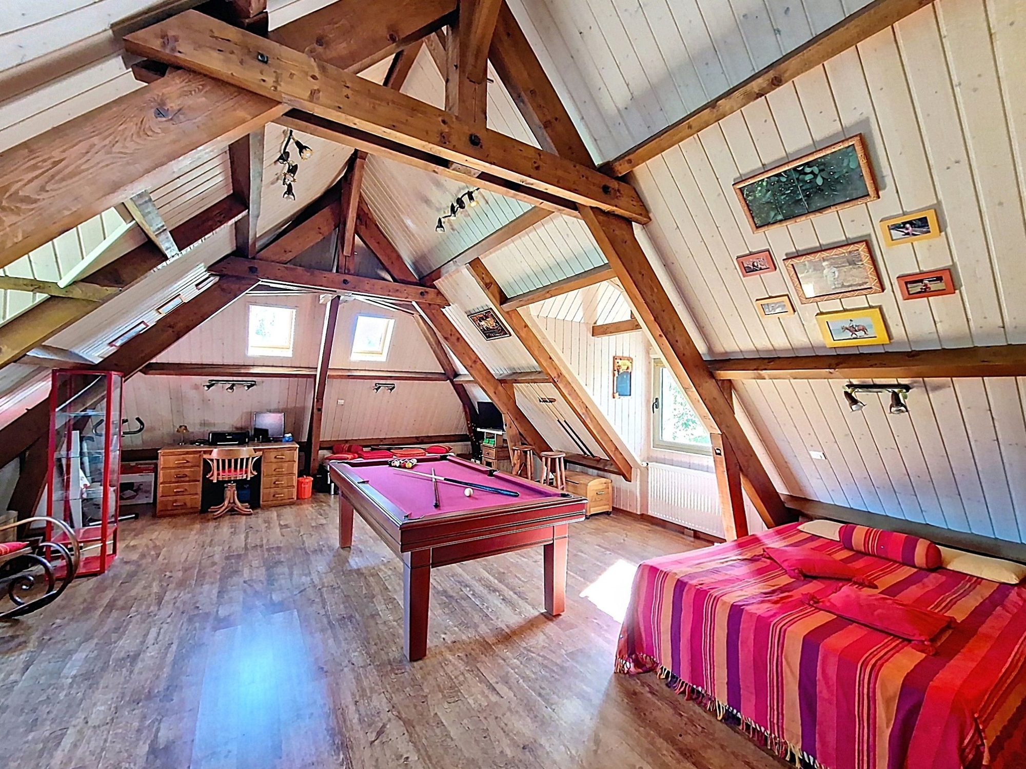 Au premier étage : mansardé : deux grandes chambres, salle d'eau avec W.C. et dégagement . Quelques marches plus haut : vaste salle de jeu de 32m².