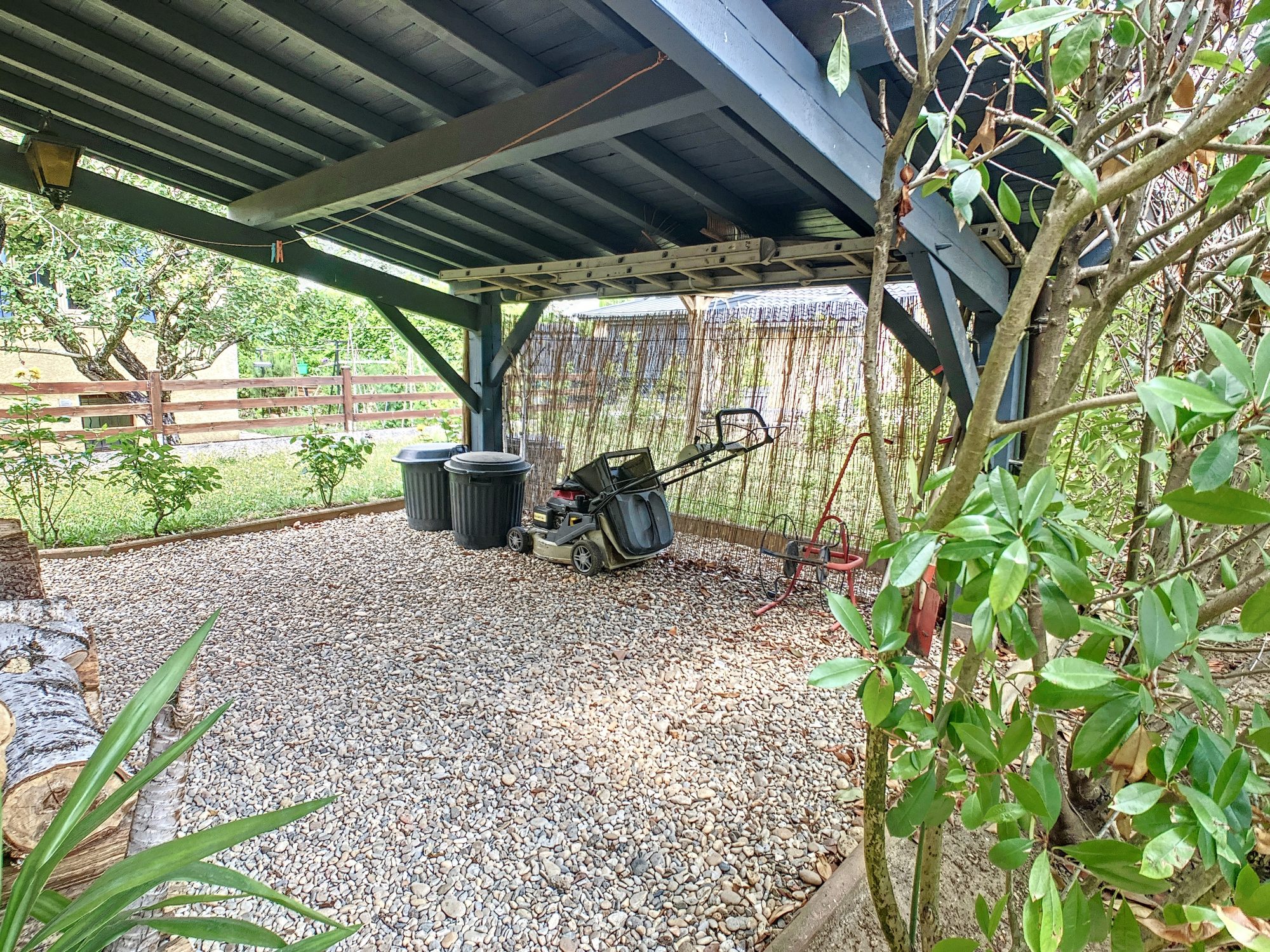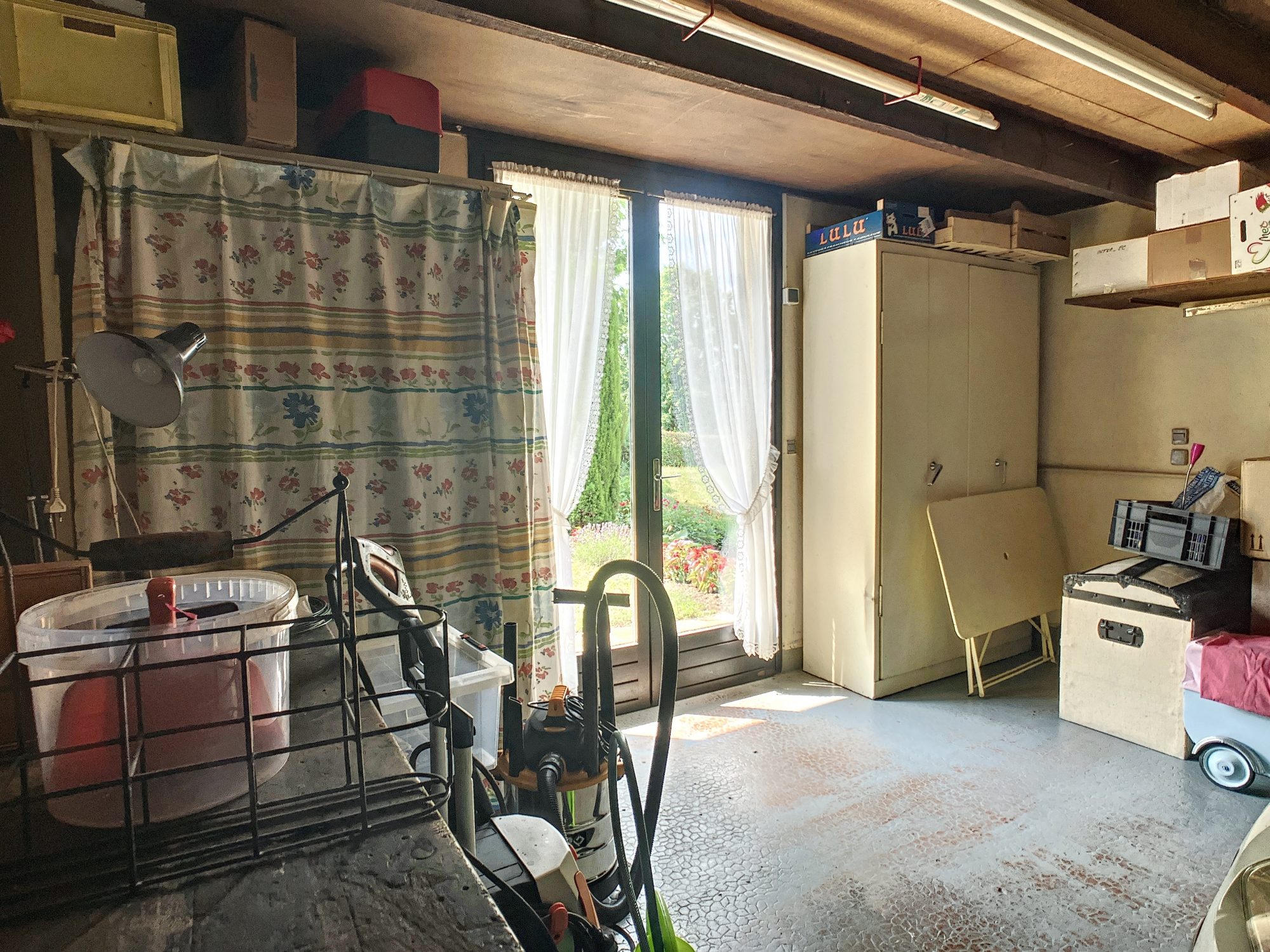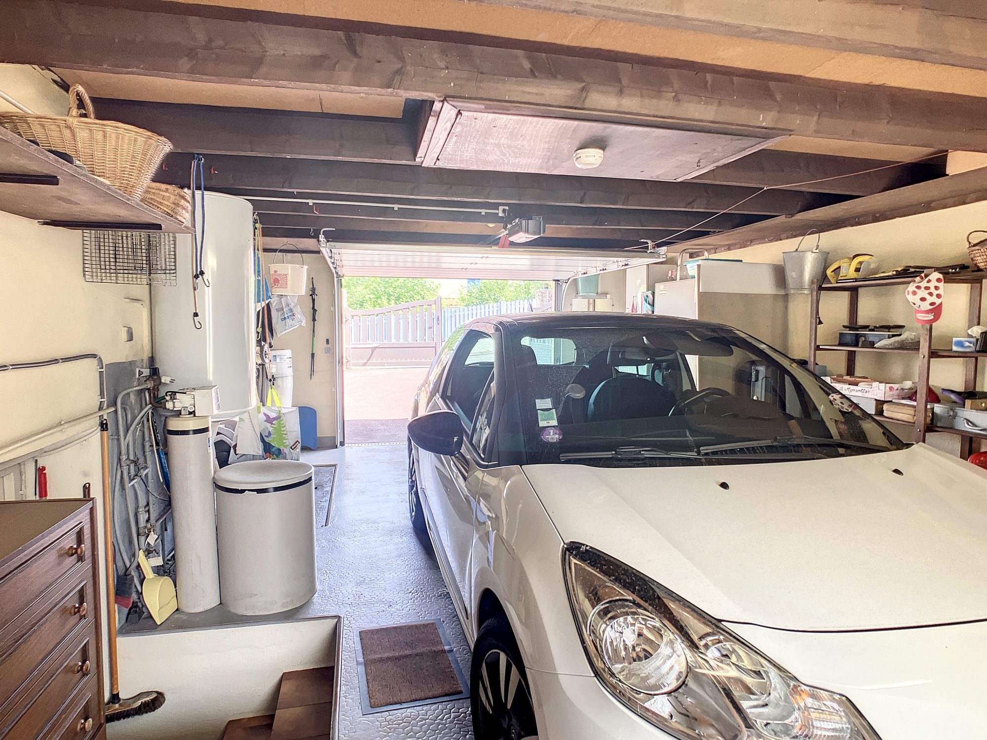 Le garage attenant à la cuisine permet de stationner une voiture. Il offre également un espace de bricolage ou autre. Un volume de rangement en grenier + une cave complètent cet espace.