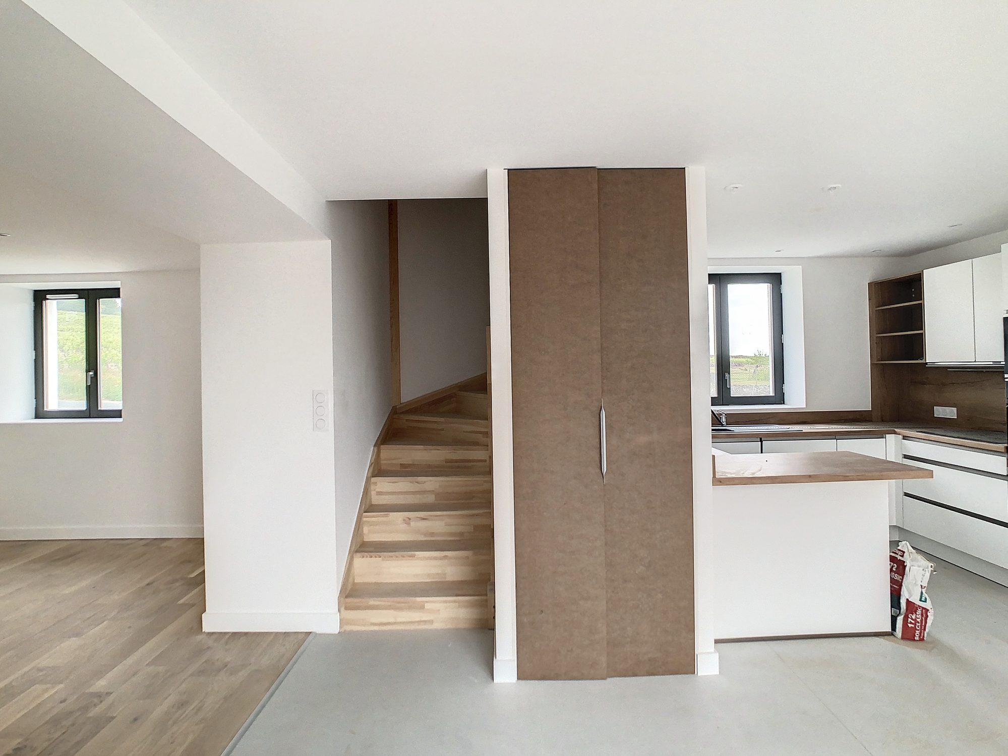 RDC : pièce de vie avec cuisine dinatoire - nombreux placards de rangement + cuisine aménagée et équipée.