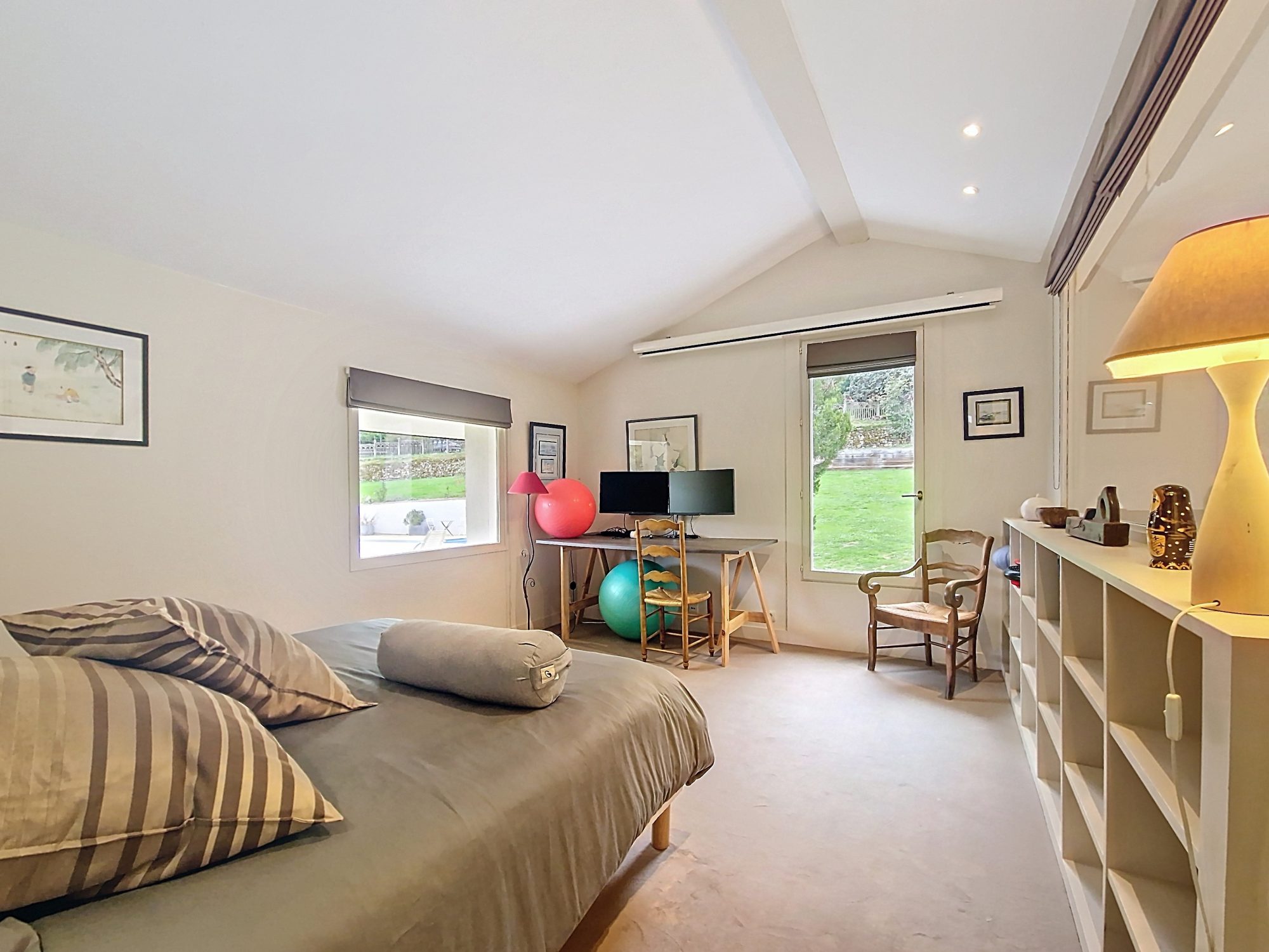 Une dépendance indépendante de 124 m² sur deux niveaux offre de multiples usages : garage pour voitures de collection, atelier, bureau professionnel, salle de sport, de yoga ou maison d’invités. Deux box à chevaux, un boulodrome et un potager viennent parfaire ce cadre de vie unique.